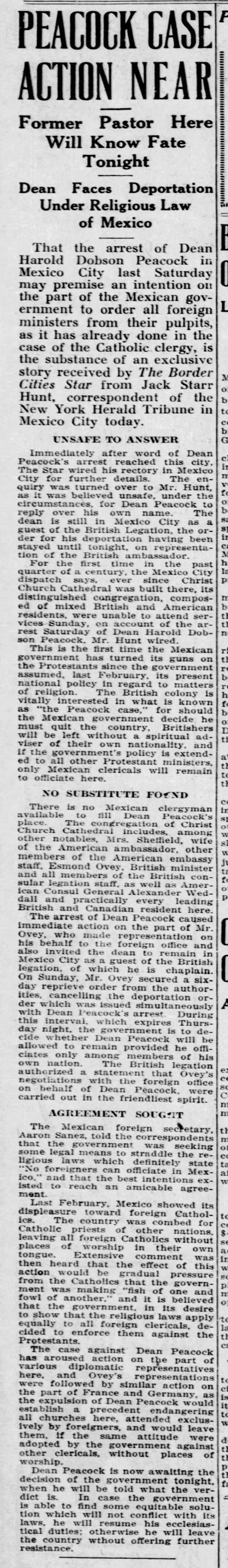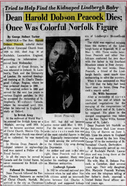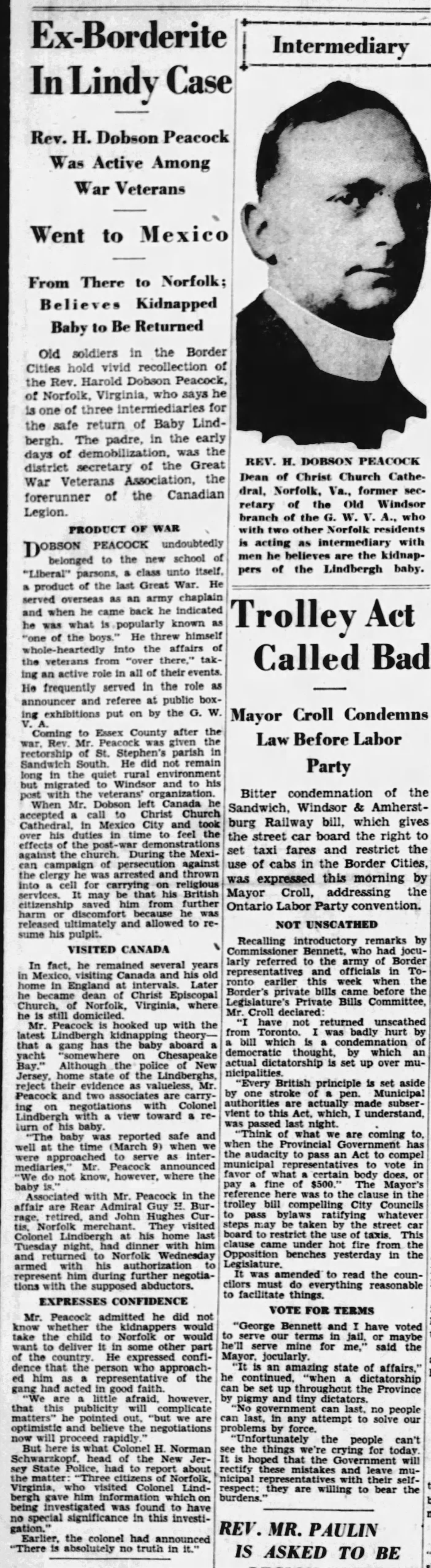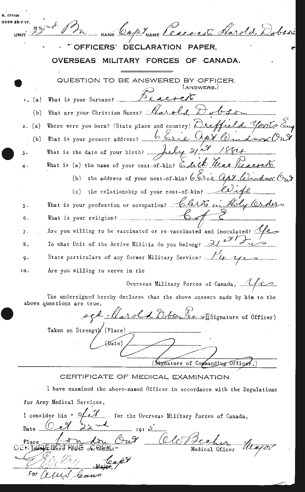 Family Search: Chaplain Harold Dobson-Peacock was born on 21 July 1884, in Driffield, Gloucestershire, England, United Kingdom as the son of William Peacock and Caroline Peacock. He had at least 1 daughter with Edith Mae. He immigrated to Canada in 1915 and lived in Windsor, Sandwich, Essex, Ontario, Canada in 1915 and Norfolk, Norfolk County, Virginia, United States, in 1930. He registered for military service in 1915. In 1915, at the age of 31, his occupation is listed as clerk of holy orders in Windsor, Sandwich, Essex, Ontario, Canada. He died on 16 August 1959, in Rochdale, Lancashire, England, United Kingdom, at the age of 75, and was buried in Rochdale Cemetery, Rochdale, Greater Manchester, England, United Kingdom.