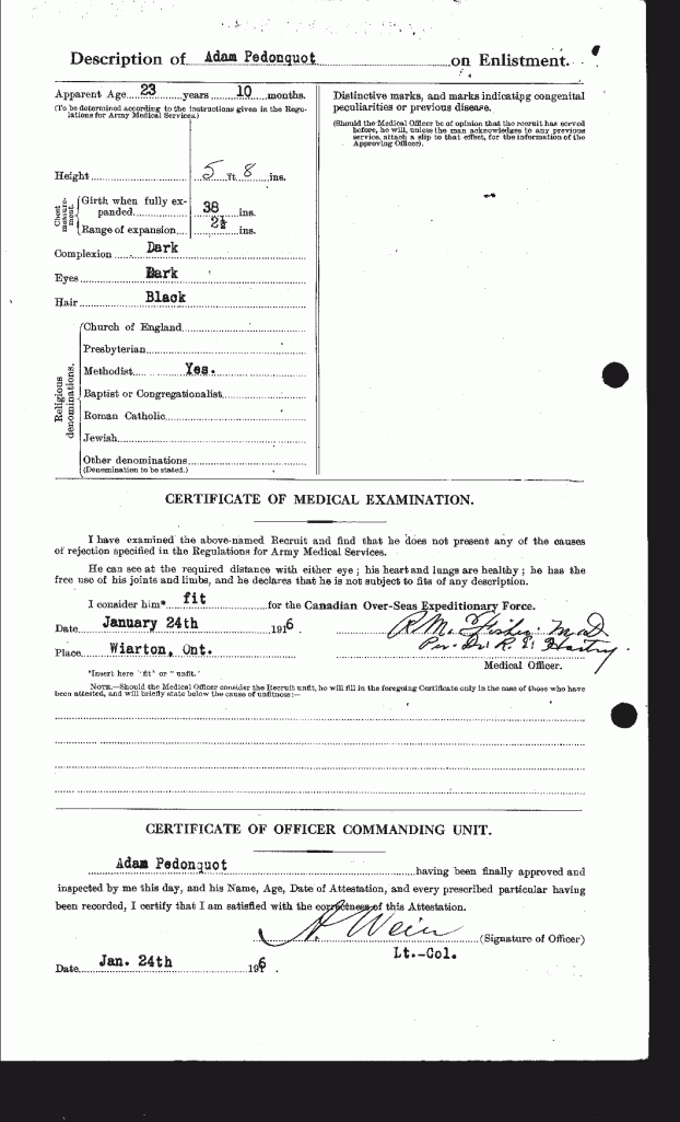 Family Search: When Adam Pedonoquott was born on 19 March 1892, in Cape Croker, Neyaashiinigmiing, Bruce, Ontario, Canada, his father, Benjamin Pedonoquott, was 46 and his mother, Mary Ashkewe, was 34. He married Velva Alvena Elliott on 28 November 1919, in Wiarton, Bruce, Ontario, Canada. They were the parents of at least 1 son and 2 daughters. He registered for military service in 1916. In 1919, at the age of 27, his occupation is listed as farmer in Cape Croker, Neyaashiinigmiing, Bruce, Ontario, Canada. He died in 1964, in Bruce, Ontario, Canada, at the age of 72.