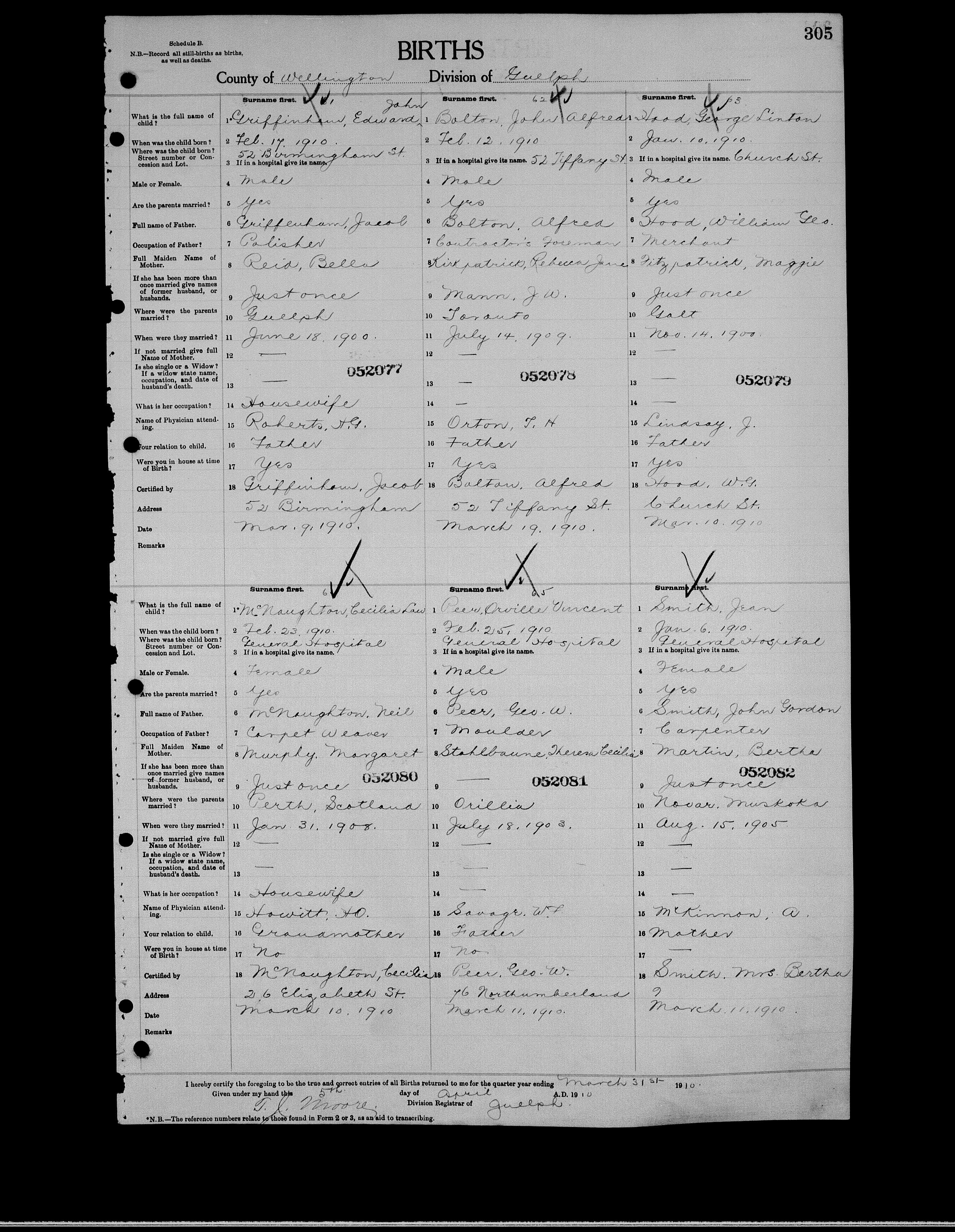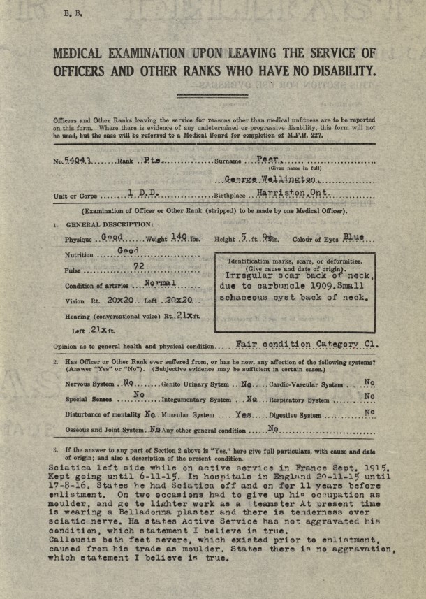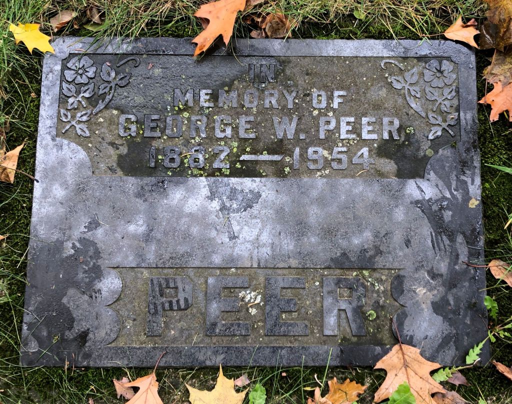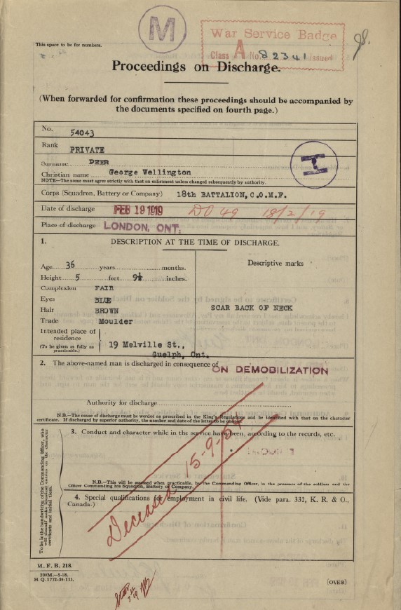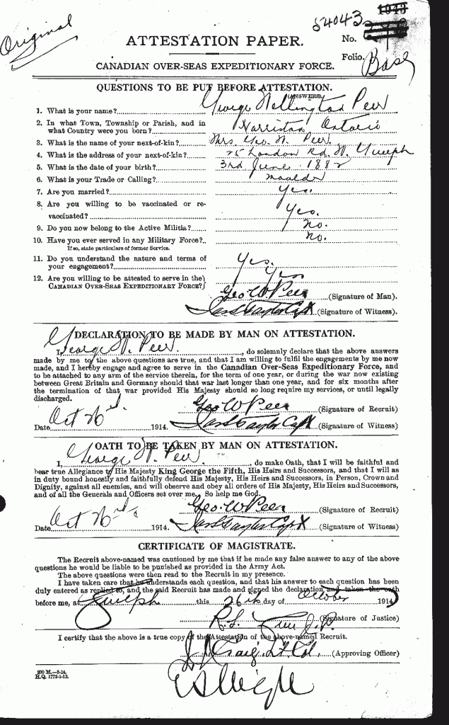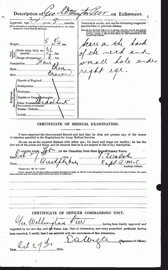 Family Search: When Private George Wellington Oswell Peer was born on 3 June 1882, in Maryhill, Waterloo, Ontario, Canada, his father, Stephen Edward Peer, was 31 and his mother, Mary Elizabeth Vollick, was 21. He married Teresa Cecilia Stahlbaum on 13 February 1904, in Wellington, Ontario, Canada. They were the parents of at least 2 sons and 2 daughters. He lived in Wellington, Ontario, Canada in 1901 and Wellington, Prince Edward, Ontario, Canada in 1911. He registered for military service in 1914. In 1914, at the age of 32, his occupation is listed as moulder. He died on 15 September 1954, in Guelph, Wellington, Ontario, Canada, at the age of 72, and was buried in Woodlawn Memorial Park, Guelph, Wellington, Ontario, Canada.