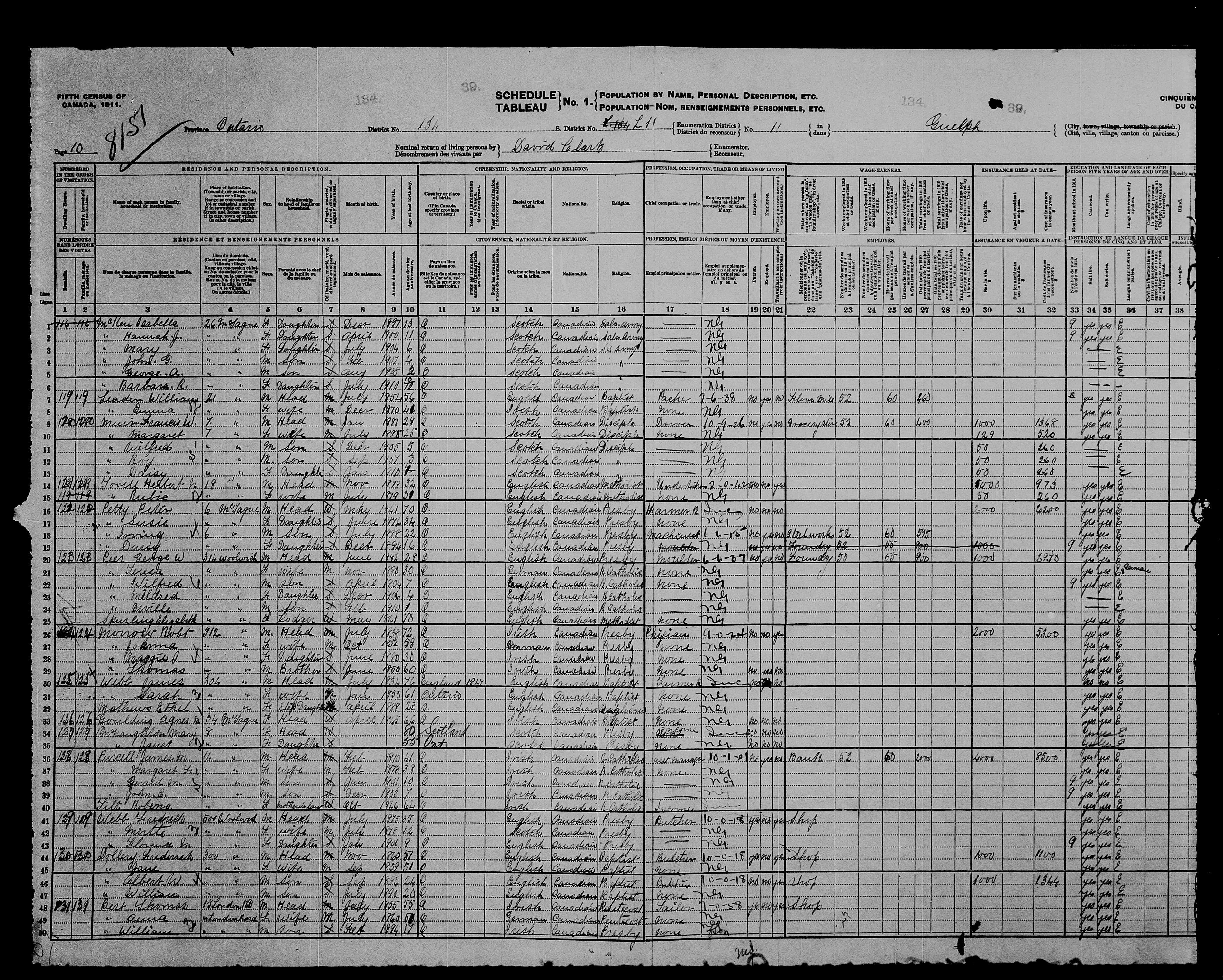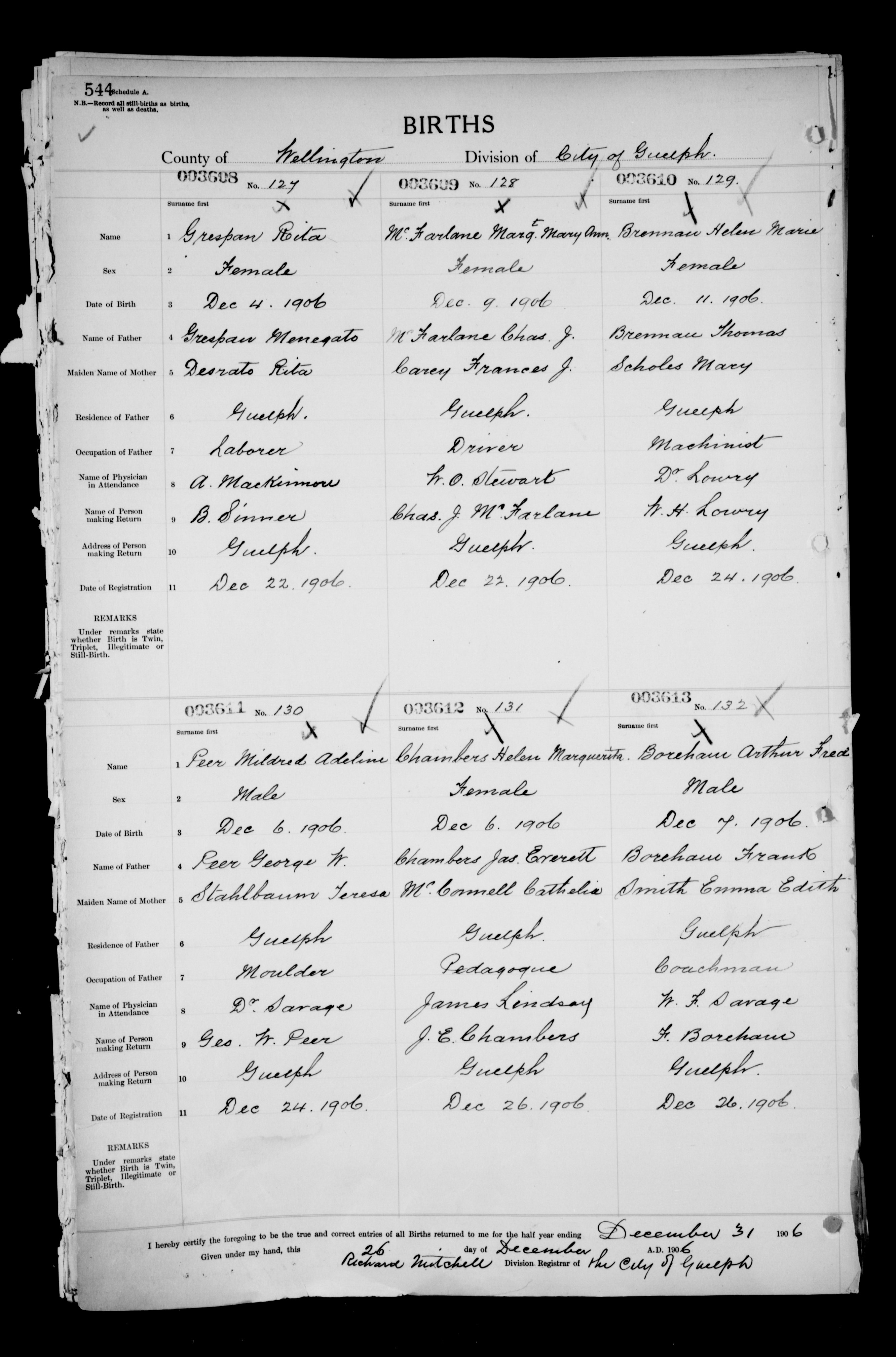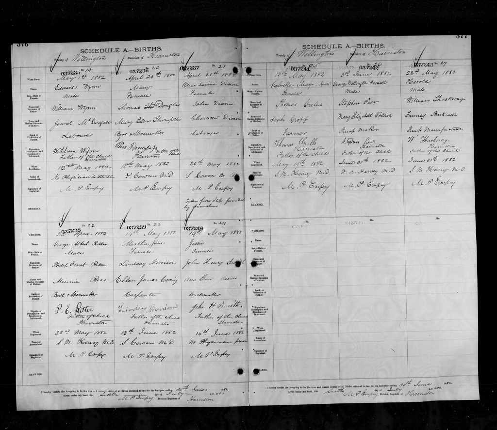Family Search: When Private George Wellington Oswell Peer was born on 3 June 1882, in Maryhill, Waterloo, Ontario, Canada, his father, Stephen Edward Peer, was 31 and his mother, Mary Elizabeth Vollick, was 21. He married Teresa Cecilia Stahlbaum on 13 February 1904, in Wellington, Ontario, Canada. They were the parents of at least 2 sons and 2 daughters. He lived in Wellington, Ontario, Canada in 1901 and Wellington, Prince Edward, Ontario, Canada in 1911. He registered for military service in 1914. In 1914, at the age of 32, his occupation is listed as moulder. He died on 15 September 1954, in Guelph, Wellington, Ontario, Canada, at the age of 72, and was buried in Woodlawn Memorial Park, Guelph, Wellington, Ontario, Canada.