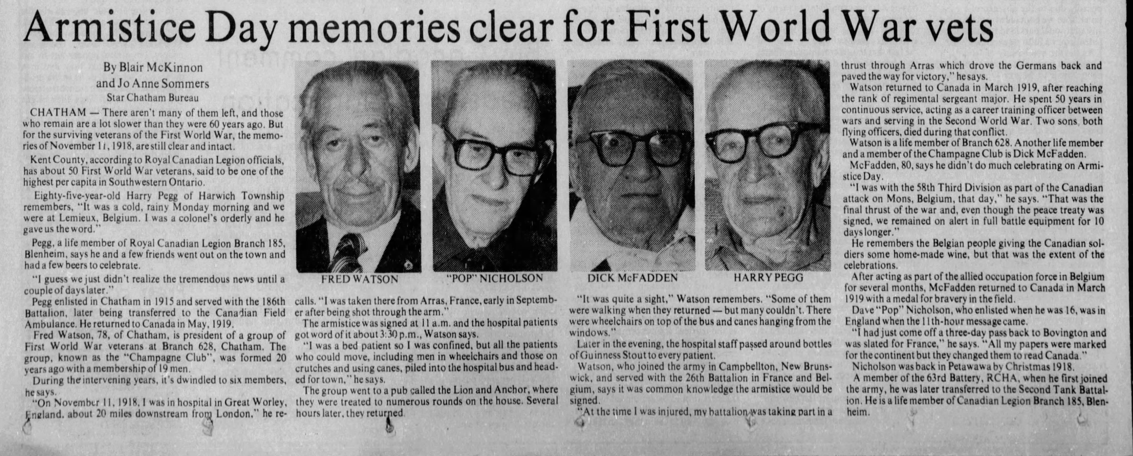 Family Search: When Private Harry Pegg was born on 5 December 1893, in Kent, Ontario, Canada, his father, William Thomas Pegg, was 34 and his mother, Rebeca Lodena Hill, was 31. He lived in Blenheim, Kent, Ontario, Canada for about 6 years and in Harwich, Kent, Ontario, Canada in 1931. He registered for military service in 1916. In 1931, at the age of 38, his occupation is listed as farm labourer in Harwich, Kent, Ontario, Canada. He died in 1980, in Ontario, Canada, at the age of 87, and was buried in Evergreen Cemetery, Blenheim, Chatham-Kent, Ontario, Canada.