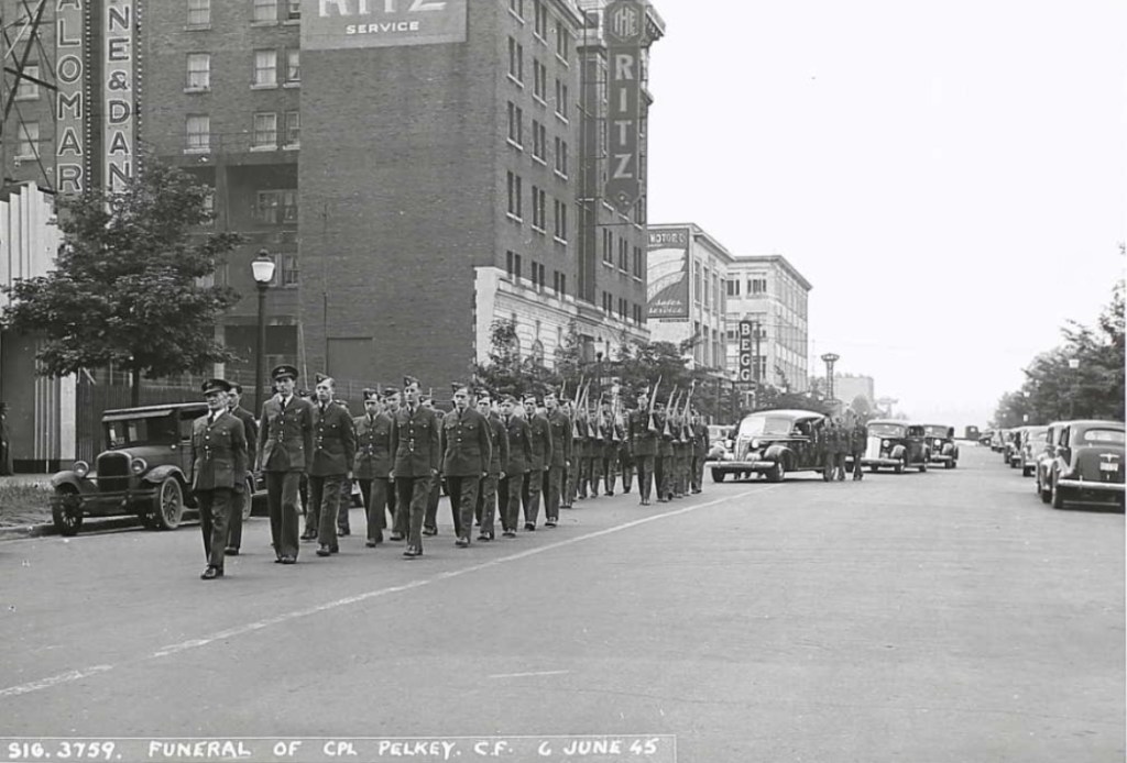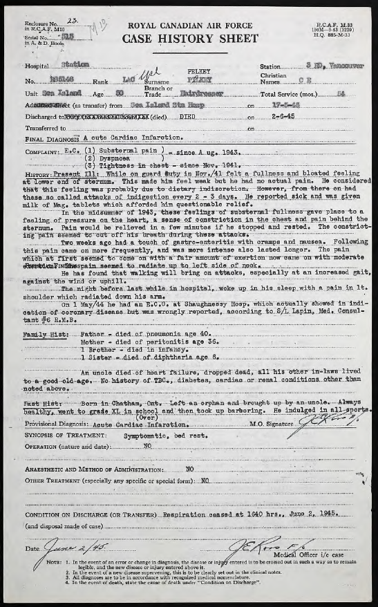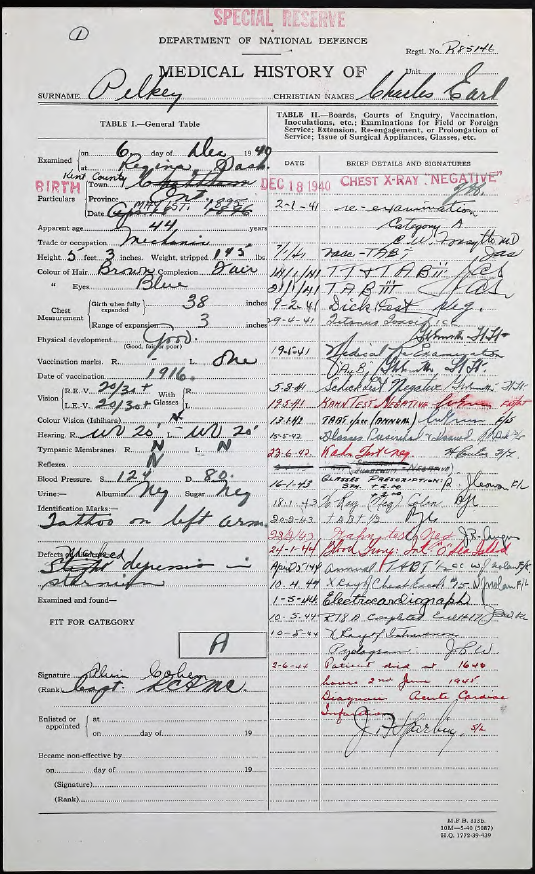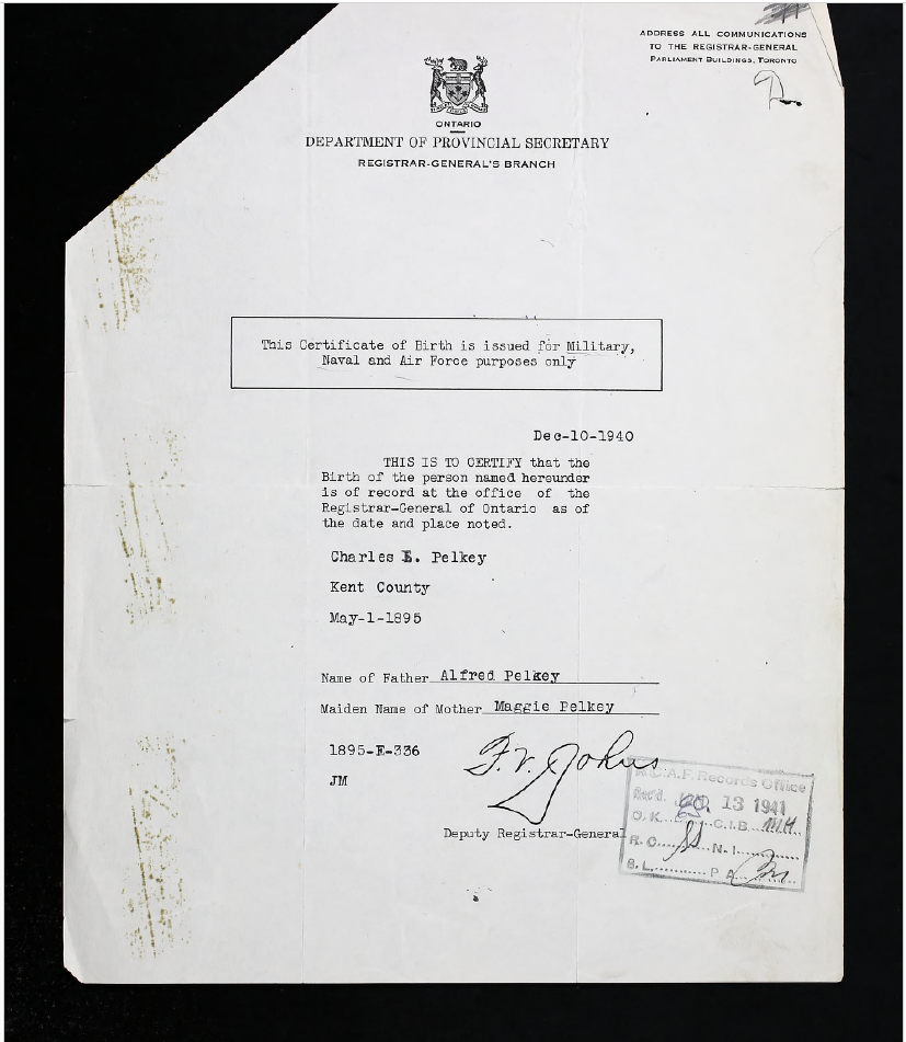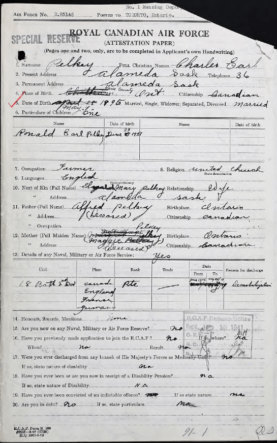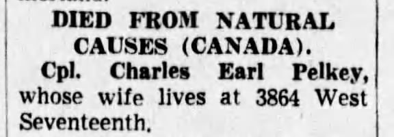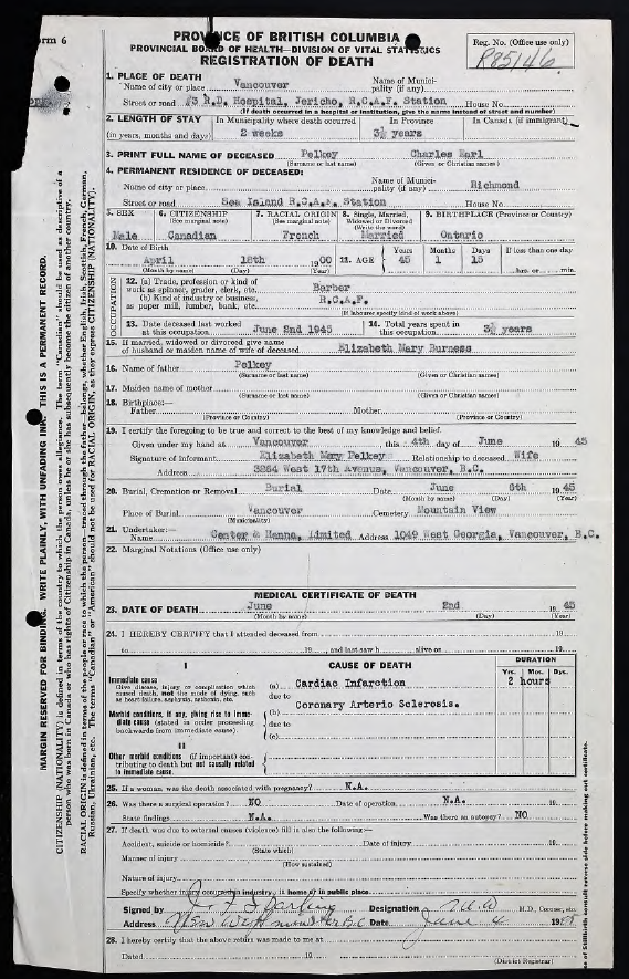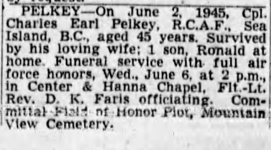 Family Search: When Private Charles Earl Pelkey was born on 1 May 1895, in Thamesville, Chatham-Kent, Ontario, Canada, his father, Alfred R. Pelkey, was 26 and his mother, Margaret Pelky, was 22. He married Elizabeth Mary Burness on 25 December 1926, in Alameda, Moose Creek No. 33, Saskatchewan, Canada. They were the parents of at least 1 son. He lived in Ontario, Canada in 1895 and Alameda, Moose Creek No. 33, Saskatchewan, Canada in 1940. He registered for military service in 1916. In 1941, at the age of 46, his occupation is listed as barber in Alameda, Moose Creek No. 33, Saskatchewan, Canada. He died on 2 June 1945, in Vancouver, British Columbia, Canada, at the age of 50, and was buried in Mountain View Cemetery, Vancouver, British Columbia, Canada.