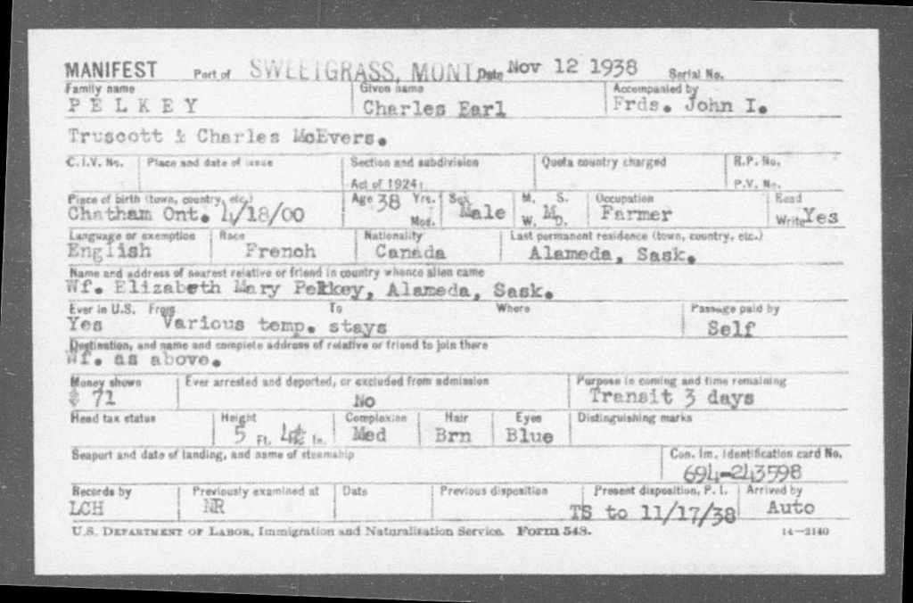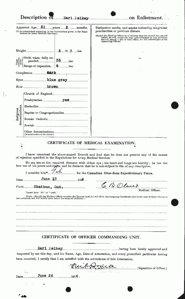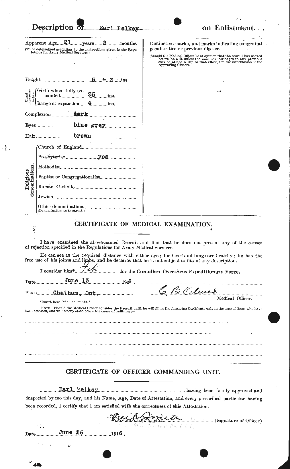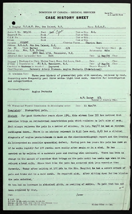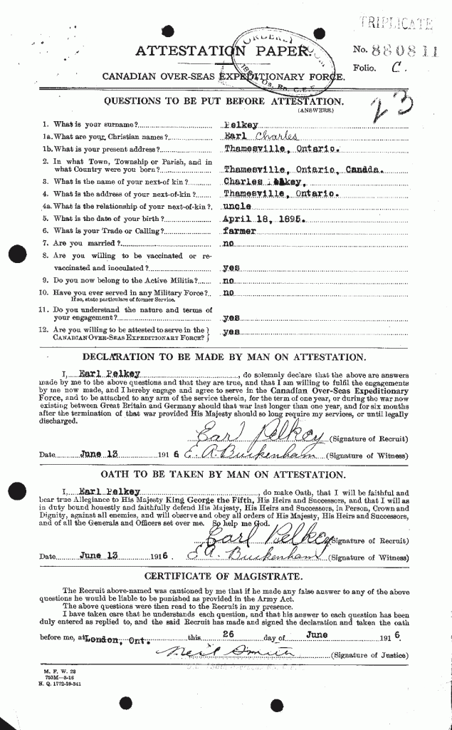 Family Search: When Private Charles Earl Pelkey was born on 1 May 1895, in Thamesville, Chatham-Kent, Ontario, Canada, his father, Alfred R. Pelkey, was 26 and his mother, Margaret Pelky, was 22. He married Elizabeth Mary Burness on 25 December 1926, in Alameda, Moose Creek No. 33, Saskatchewan, Canada. They were the parents of at least 1 son. He lived in Ontario, Canada in 1895 and Alameda, Moose Creek No. 33, Saskatchewan, Canada in 1940. He registered for military service in 1916. In 1941, at the age of 46, his occupation is listed as barber in Alameda, Moose Creek No. 33, Saskatchewan, Canada. He died on 2 June 1945, in Vancouver, British Columbia, Canada, at the age of 50, and was buried in Mountain View Cemetery, Vancouver, British Columbia, Canada.