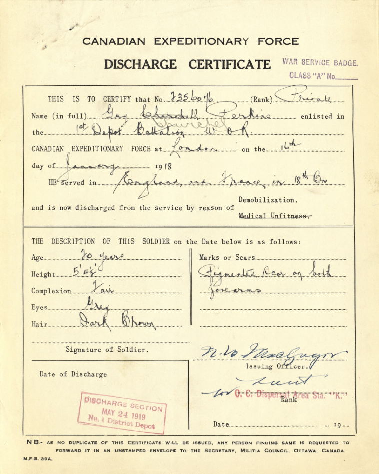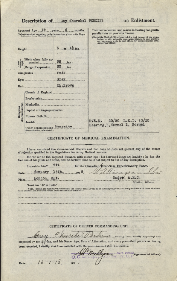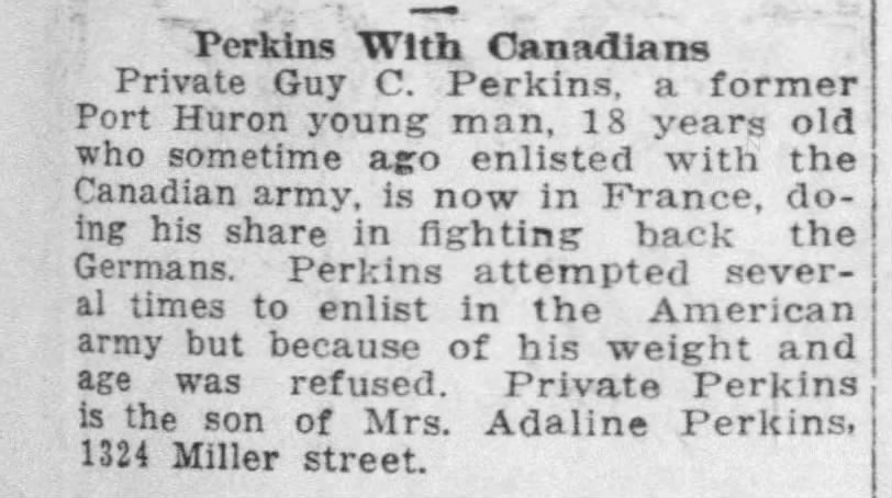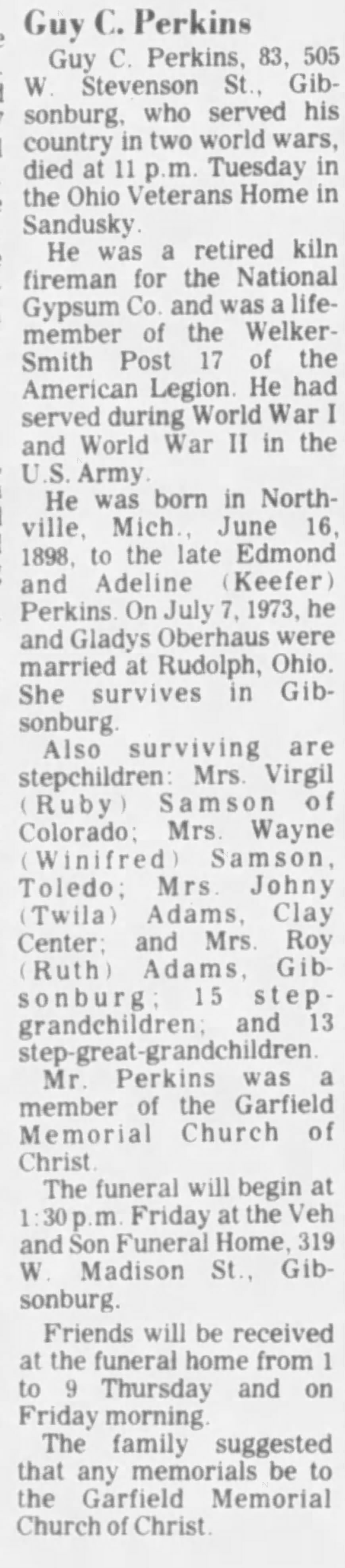Family Search: When Private Guy Charles Perkins was born on 16 June 1898, in Northville, Wayne, Michigan, United States, his father, Edmond Perkins, was 22 and his mother, Adaline R Keefer, was 27. He married Lillian Frances Siler on 21 December 1935, in Lucas, Ohio, United States. He lived in Port Huron, St. Clair, Michigan, United States in 1918 and Gibsonburg, Sandusky, Ohio, United States in 1981. He registered for military service in 1918. In 1918, at the age of 20, his occupation is listed as machinist apprentice in Port Huron, St. Clair, Michigan, United States. He died on 23 June 1981, in Sandusky, Erie, Ohio, United States, at the age of 83, and was buried in West Union Cemetery, Gibsonburg, Sandusky, Ohio, United States.