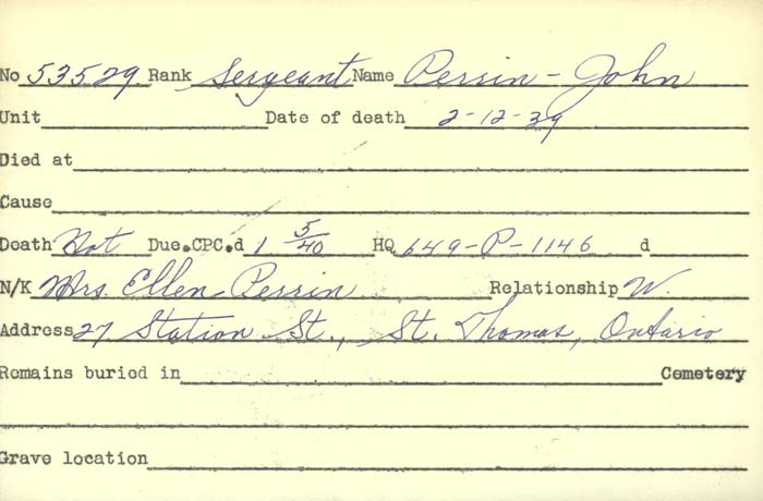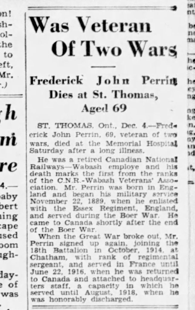 Family Source: When Frederick John Perrin was born on 24 September 1871, in Bermondsey, Surrey, England, United Kingdom, his father, William Perrin, was 28 and his mother, Mary Newberry, was 28. He married Ellen Alexander on 8 July 1899, in St James, Middlesex, England, United Kingdom. They were the parents of at least 2 sons and 1 daughter. He immigrated to Canada in 1909 and lived in Little Dunmow, Essex, England, United Kingdom in 1881 and Chatham, Kent, Ontario, Canada in 1918. He registered for military service in 1914. In 1914, at the age of 43, his occupation is listed as labourer in Chatham, Kent, Ontario, Canada. He died on 2 December 1939, in St. Thomas, Elgin, Ontario, Canada, at the age of 68, and was buried in South Park Cemetery, Lyndale, Elgin, Ontario, Canada.