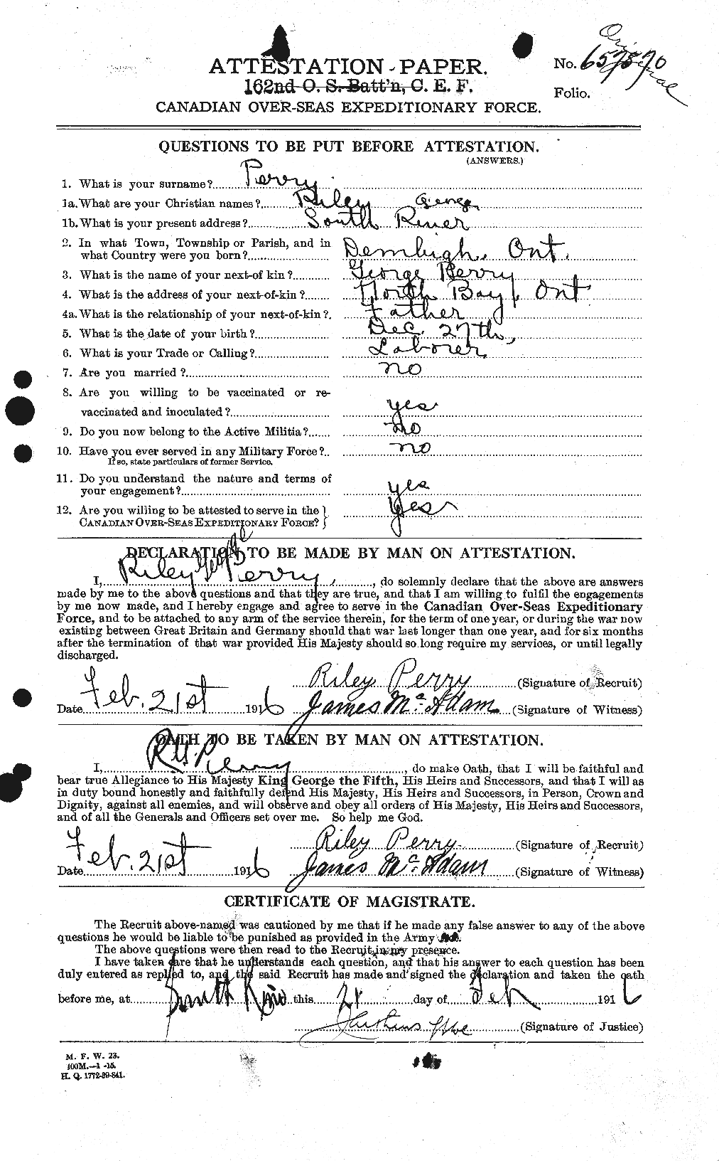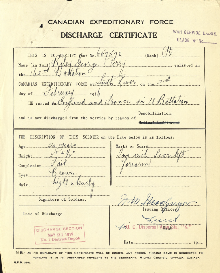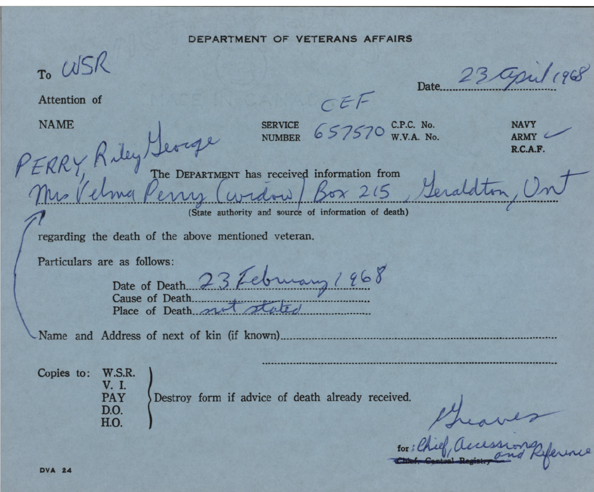 Family Search: When Private George Riley Finch Perry was born on 15 December 1898, in Denbigh, Addington Highlands Township, Lennox and Addington, Ontario, Canada, his father, George Wesley Simmons Perry, was 53 and his mother, Hannah “Annie” Woodcock Finch, was 22. He lived in South River, Parry Sound, Ontario, Canada in 1916 and North Bay, Nipissing, Ontario, Canada in 1920. He registered for military service in 1916. In 1916, at the age of 18, his occupation is listed as labourer in South River, Parry Sound, Ontario, Canada. He died on 23 February 1968, in Geraldton, Greenstone, Thunder Bay, Ontario, Canada, at the age of 69, and was buried in Geraldton Cemetery, Geraldton, Greenstone, Thunder Bay, Ontario, Canada.