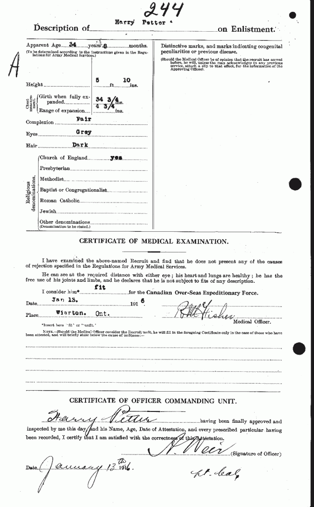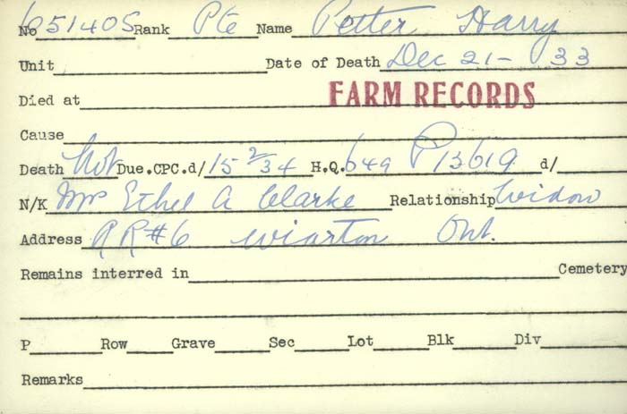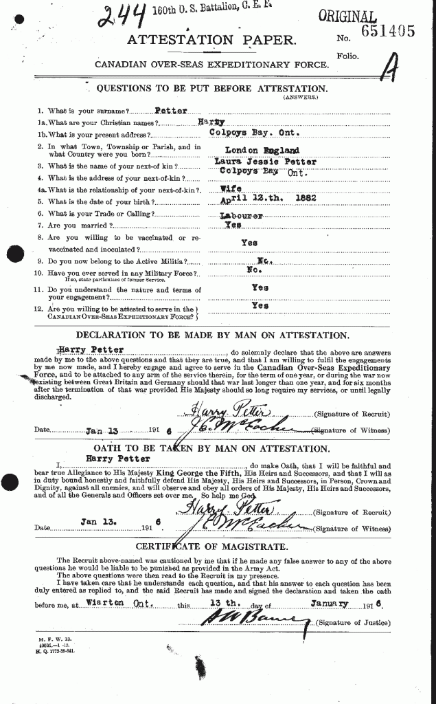 Family Search: When Private Harry Petter was born on 12 April 1881, in London, England, United Kingdom, his father, George Petter, was 28 and his mother, Eliza, was 23. He married Laura Jessie Clarke in 1903, in England, United Kingdom. They were the parents of at least 5 sons and 2 daughters. He immigrated to Canada in 1911 and lived in Wood Green, Middlesex, England, United Kingdom in 1911 and Colpoy’s Bay, Bruce, Ontario, Canada in 1916. In 1916, at the age of 35, his occupation is listed as labourer in Colpoy’s Bay, Bruce, Ontario, Canada. He died on 21 December 1933, in Wiarton, Bruce, Ontario, Canada, at the age of 52, and was buried in Edgehill Cemetery, Wiarton, Bruce, Ontario, Canada.