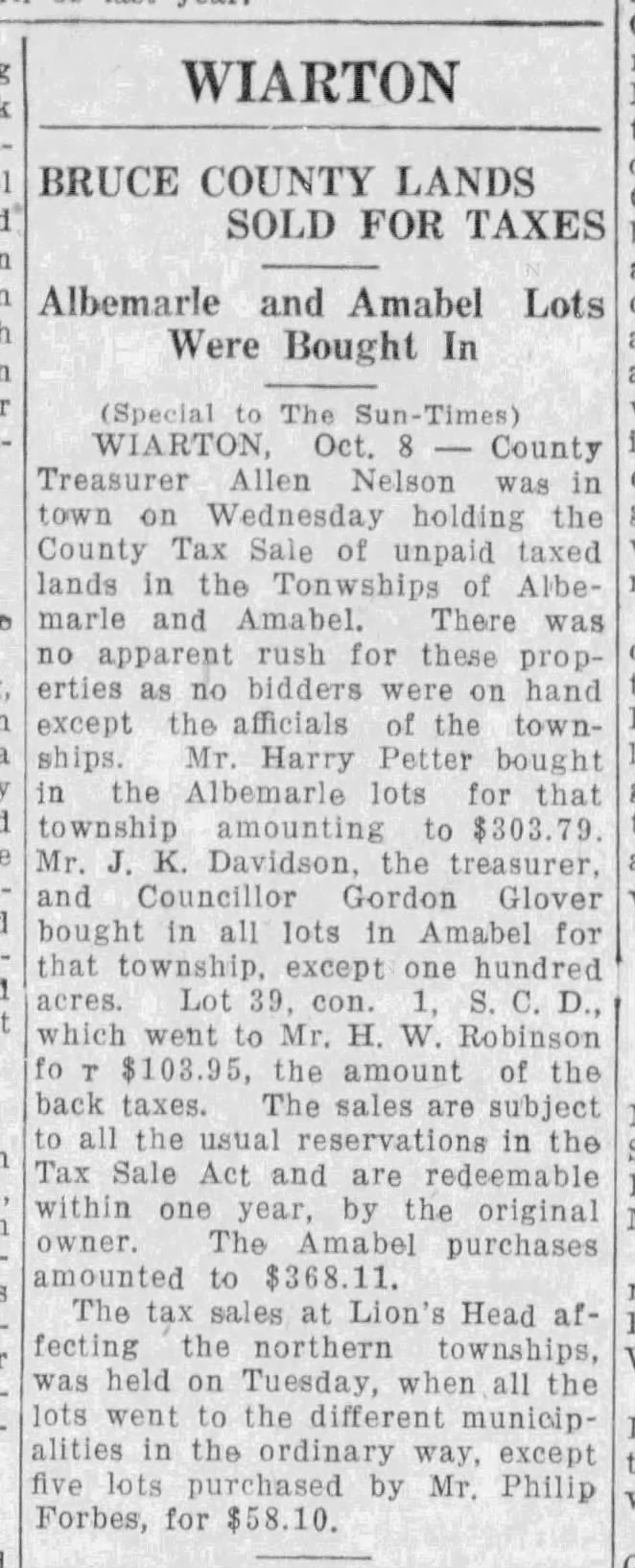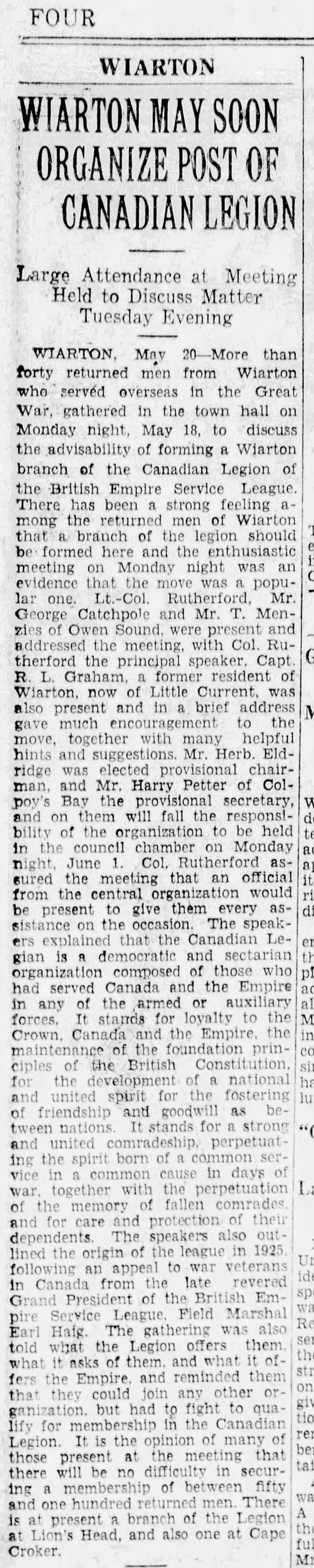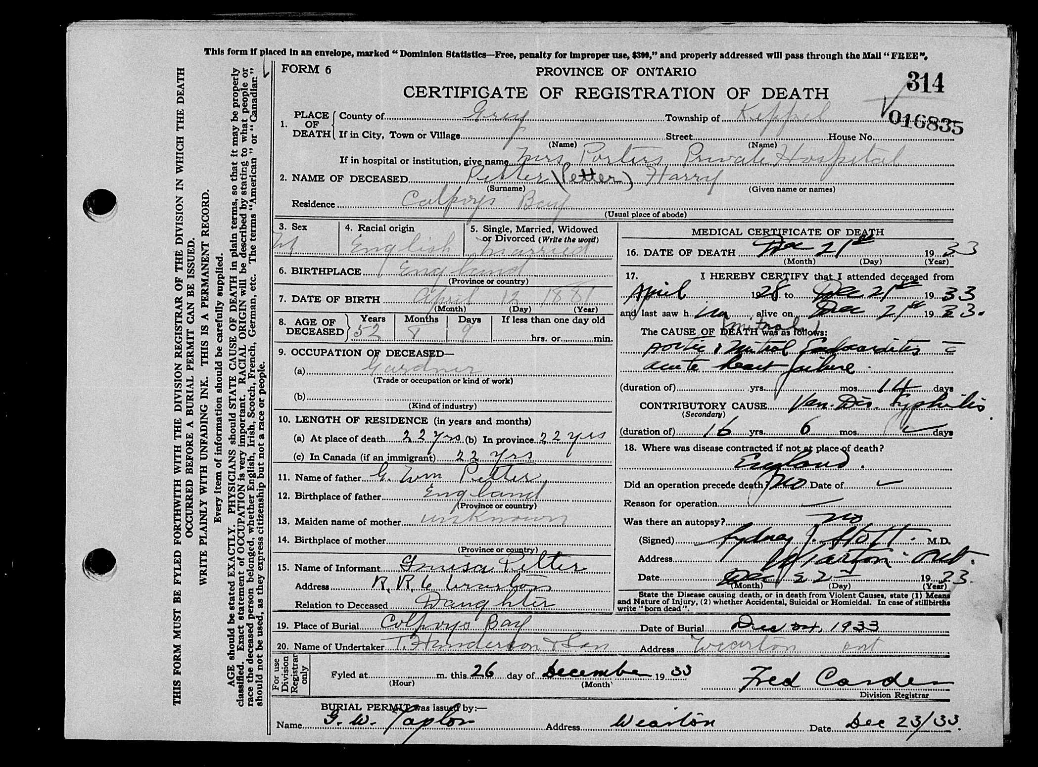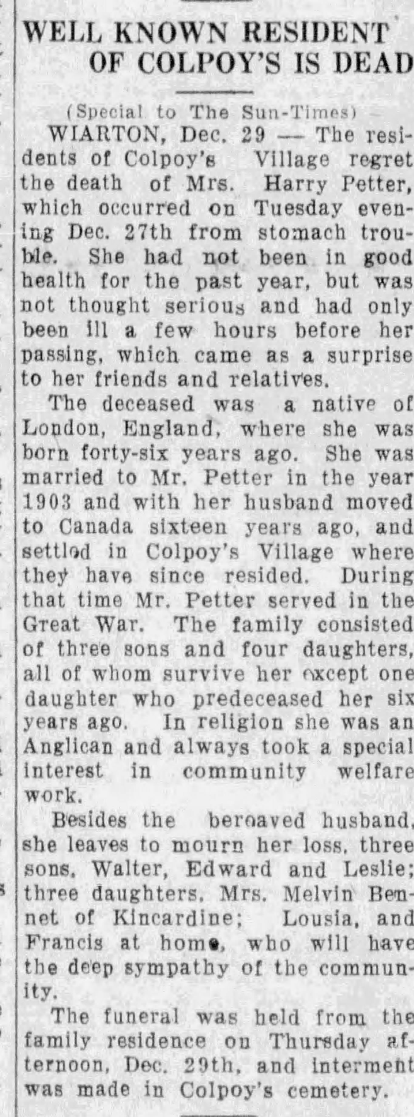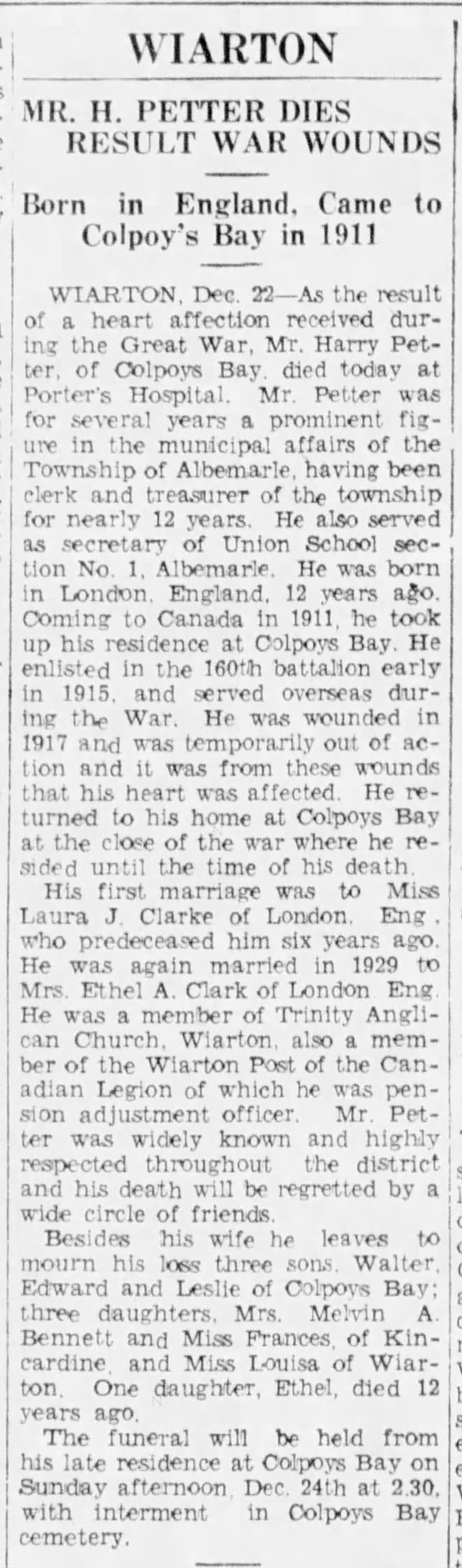 WIARTON, Dec. 22—As the result of a heart affection received during the Great War, Mr. Harry Petter, of Colpoys Bay, died today at Porter’s Hospital. Mr. Petter was for several years a prominent figure in the municipal affairs of the Township of Albemarle, having been clerk and treasurer of the township for nearly 12 years. He also served as secretary of Union School section No. 1, Albemarle. He was born in London, England, 12 years ago. Coming to Canada in 1911, he took up his residence at Colpoys Bay. He enlisted in the 160th battalion early in 1915, and served overseas during the War. He was wounded in 1917 and was temporarily out of action and it was from these wounds that his heart was affected. He returned to his home at Colpoys Bay at the close of the war where he resided until the time of his death.