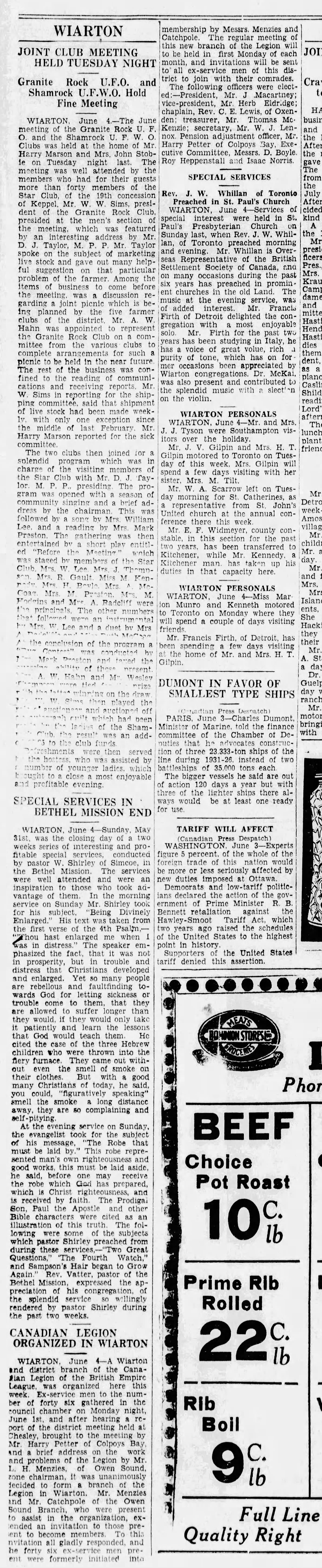 His first marriage was to Miss Laura J. Clarke of London, Eng., who predeceased him six years ago. He was again married in 1929 to Mrs. Ethel A. Clark of London Eng. He was a member of Trinity Anglican Church, Wiarton, also a member of the Wiarton Post of the Canadian Legion of which he was pension adjustment officer. Mr. Petter was widely known and highly respected throughout the district and his death will be regretted by a wide circle of friends.