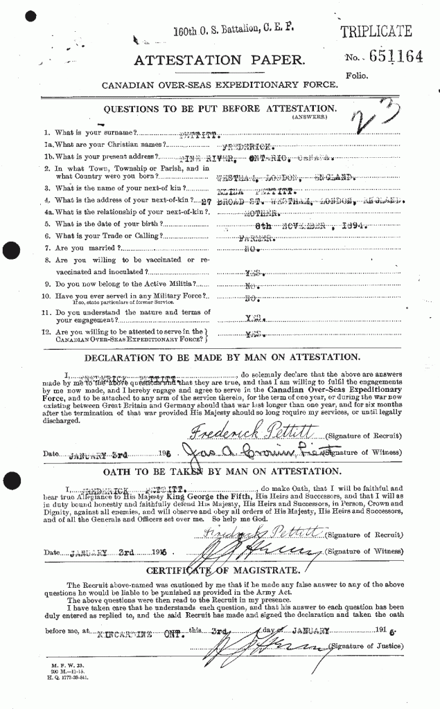 Pettitt, Frederick: Service no. 651164 Digitized Service Record Source: Per research by 160th Battalion Facebook Group. Confirmed served with 18th Battalion. Find-A-Grave Share this: Click to email a link to a friend (Opens in new window) Email Click to share on Facebook (Opens in new window) Facebook Click to share on X (Opens in new window) X Click to share on Reddit (Opens in new window) Reddit Click to share on LinkedIn (Opens in new window) LinkedIn Click to print (Opens in new window) Print Click to share on Tumblr (Opens in new window) Tumblr Click to share on Pocket (Opens in new window) Pocket Click to share on Pinterest (Opens in new window) Pinterest Click to share on Telegram (Opens in new window) Telegram Click to share on WhatsApp (Opens in new window) WhatsApp Like Loading...