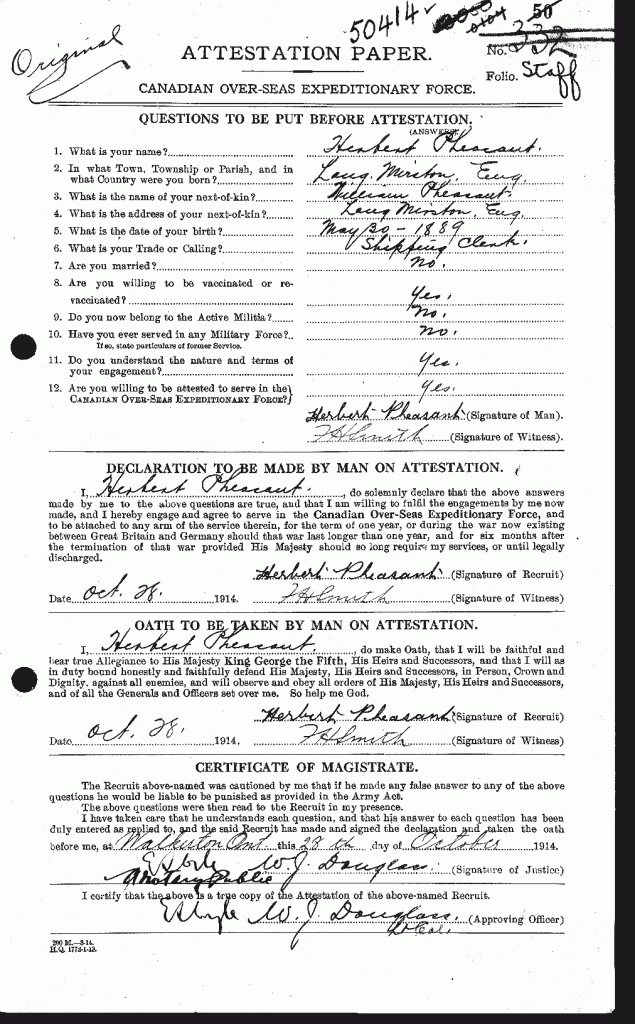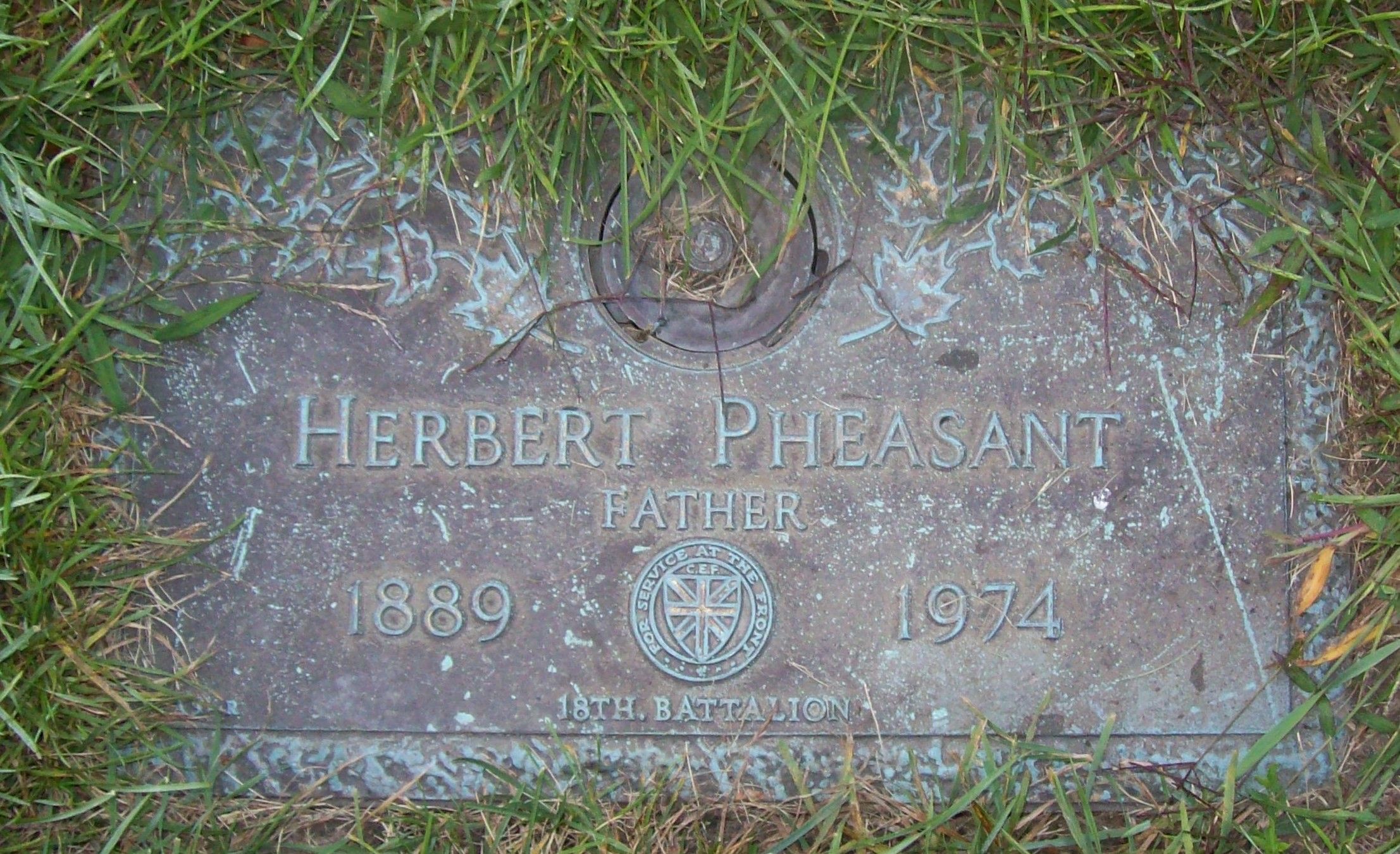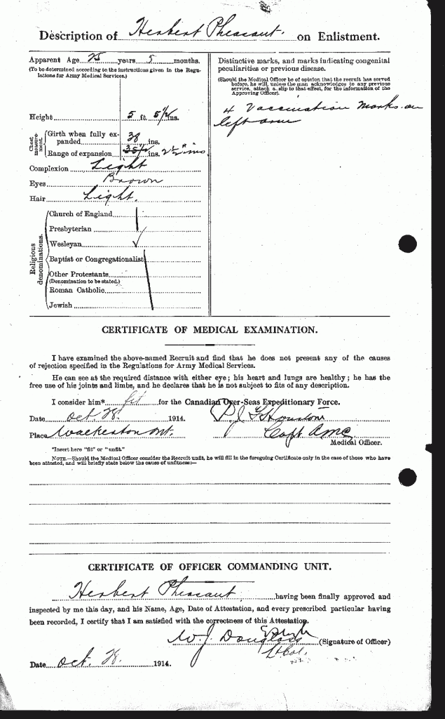 Family Search: When Private Herbert Pheasant was born in 1889, in Long Marston, Hertfordshire, England, United Kingdom, his father, John Pheasant, was 38 and his mother, Ann Bates, was 33. He married Florence Maud Saunders on 4 December 1919, in Windsor, Essex, Ontario, Canada. They were the parents of at least 2 daughters. He lived in Windsor, Sandwich, Essex, Ontario, Canada in 1931. He registered for military service in 1914. In 1914, at the age of 25, his occupation is listed as shipping clerk. He died on 14 September 1974, in Windsor, Essex, Ontario, Canada, at the age of 85, and was buried in Victoria Memorial Gardens, Oldcastle, Essex, Ontario, Canada