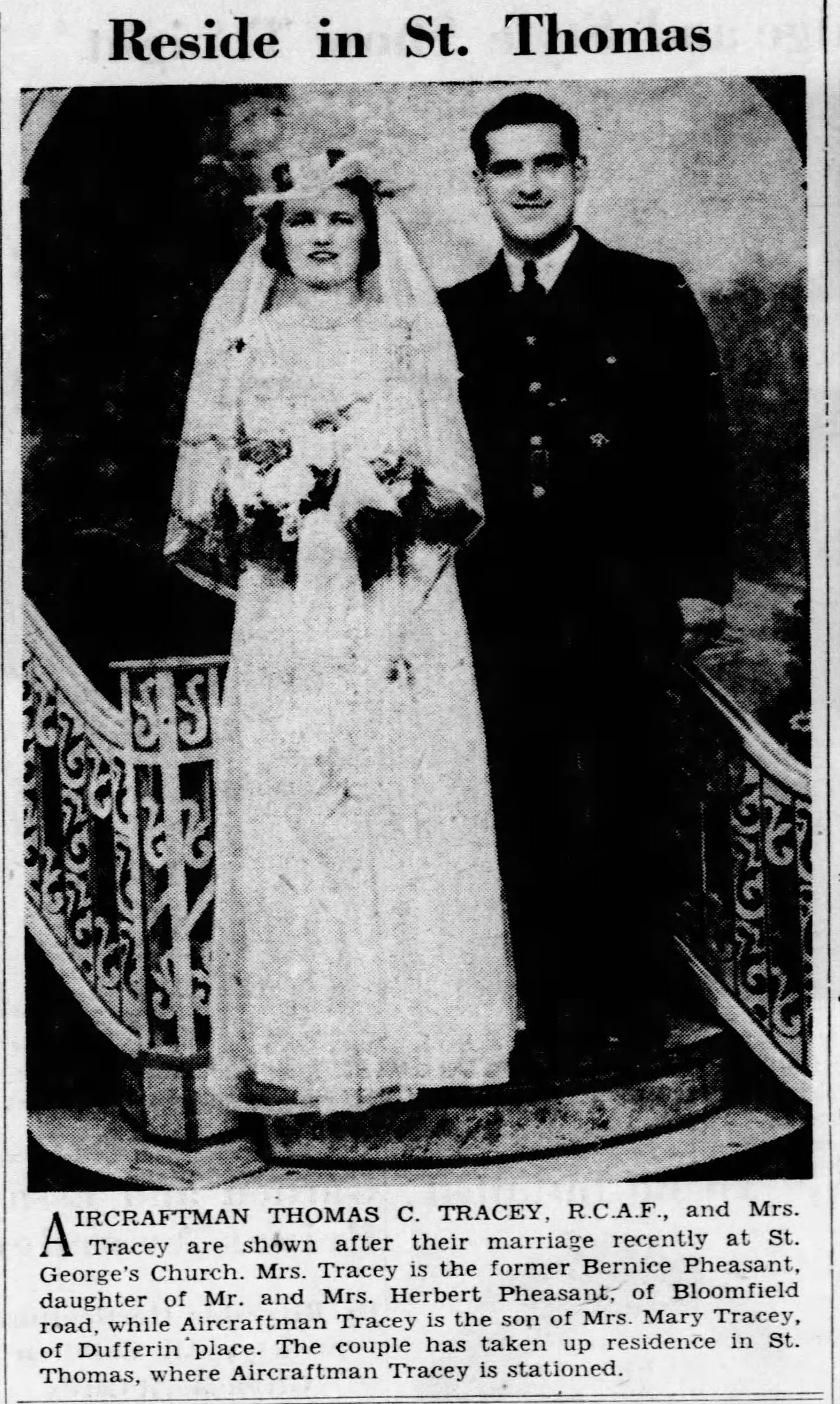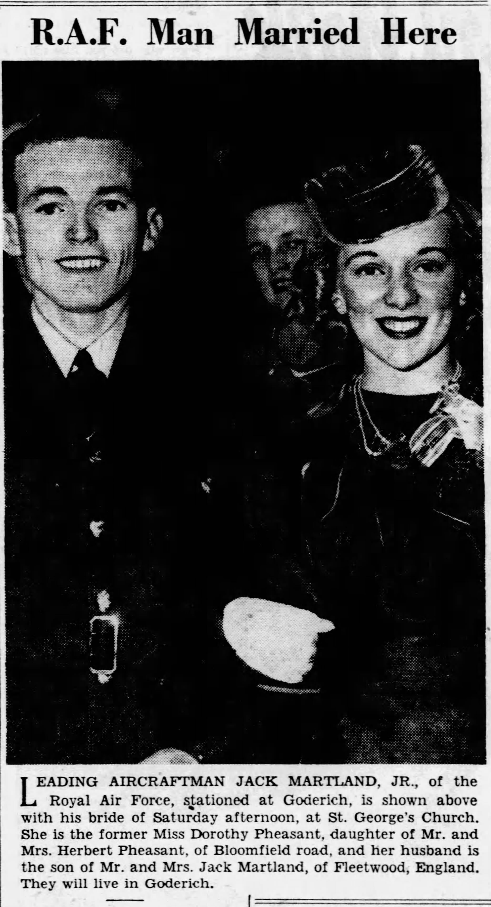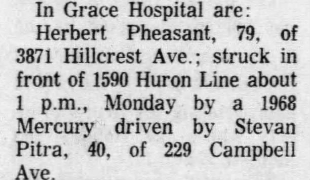 “PHEASANT Herbert, 85 years, September 14, 1974 at Windsor Western Hospital, I.O.D.E. Unit. Late of 3871 Hlllcrest Boulevard. Dear father of Mrs. Bernice Tracy, Mrs. Dorothy Martiana, both of Windsor. Also loved by four grandchildren. Funeral service in the Chapel of the Walter D Kelly Funeral Home, 1969 Wyandotte street East, Tuesday, September 17 at 1:30 p.m. Rev. Donald W. Clark officiating. Interment Victoria Memorial cemetery.”