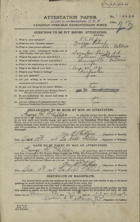 Family Search: Private George Robert Phillips was born on 28 August 1890, in Scranton, Lackawanna, Pennsylvania, United States as the son of William Phillips and Flora Stom. He married Lillian Bush on 29 October 1913, in Dunnville, Haldimand, Ontario, Canada. He lived in Dunnville, Haldimand, Ontario, Canada in 1915. He registered for military service in 1915. In 1915, at the age of 25, his occupation is listed as carpenter in Dunnville, Haldimand, Ontario, Canada.