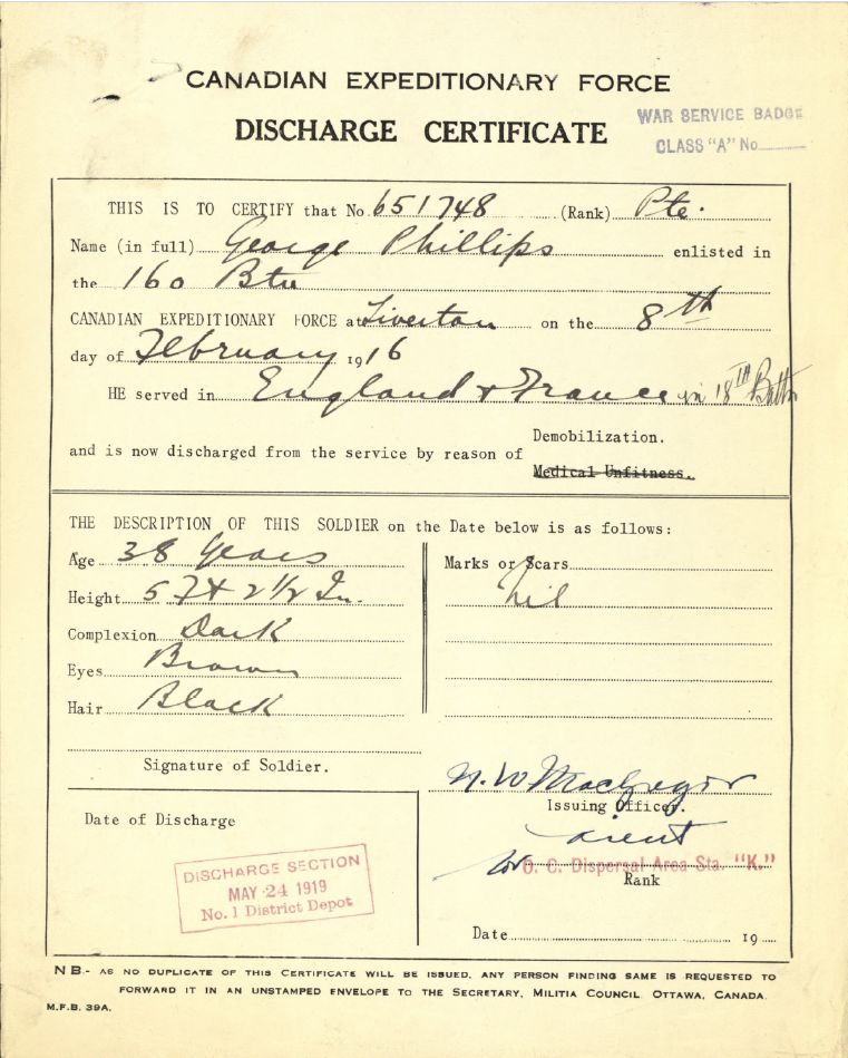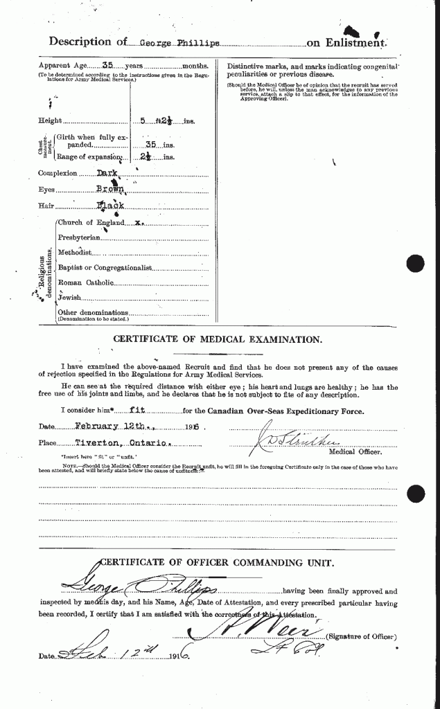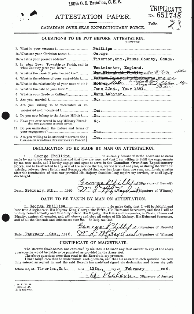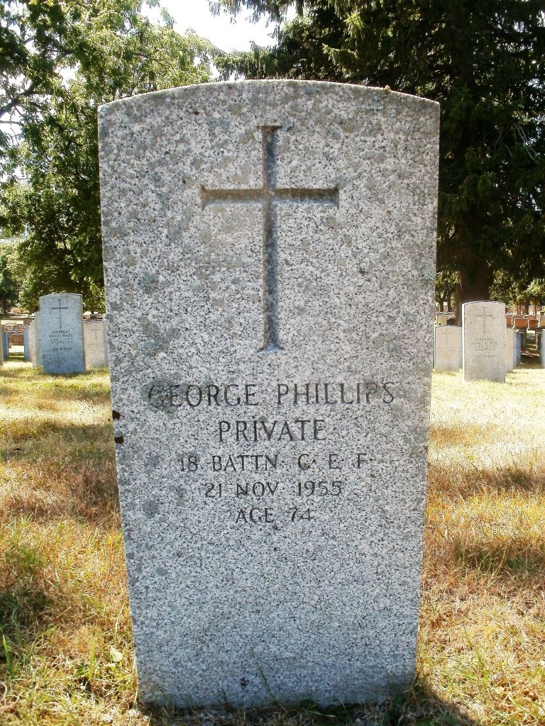Family Search: When Private George Phillips was born on 22 June 1881, in Westminster, London, England, United Kingdom, his father, Richard Phillips, was 34 and his mother, Elizabeth Ravilious, was 42. He immigrated to Canada in 1913 and lived in Tiverton, Bruce, Ontario, Canada in 1916 and Kincardine, Bruce, Ontario, Canada in 1921. He registered for military service in 1916. In 1916, at the age of 35, his occupation is listed as farm labourer in Tiverton, Bruce, Ontario, Canada. He died on 21 November 1955, at the age of 74, and was buried in Woodland Cemetery, London, Ontario, Canada.