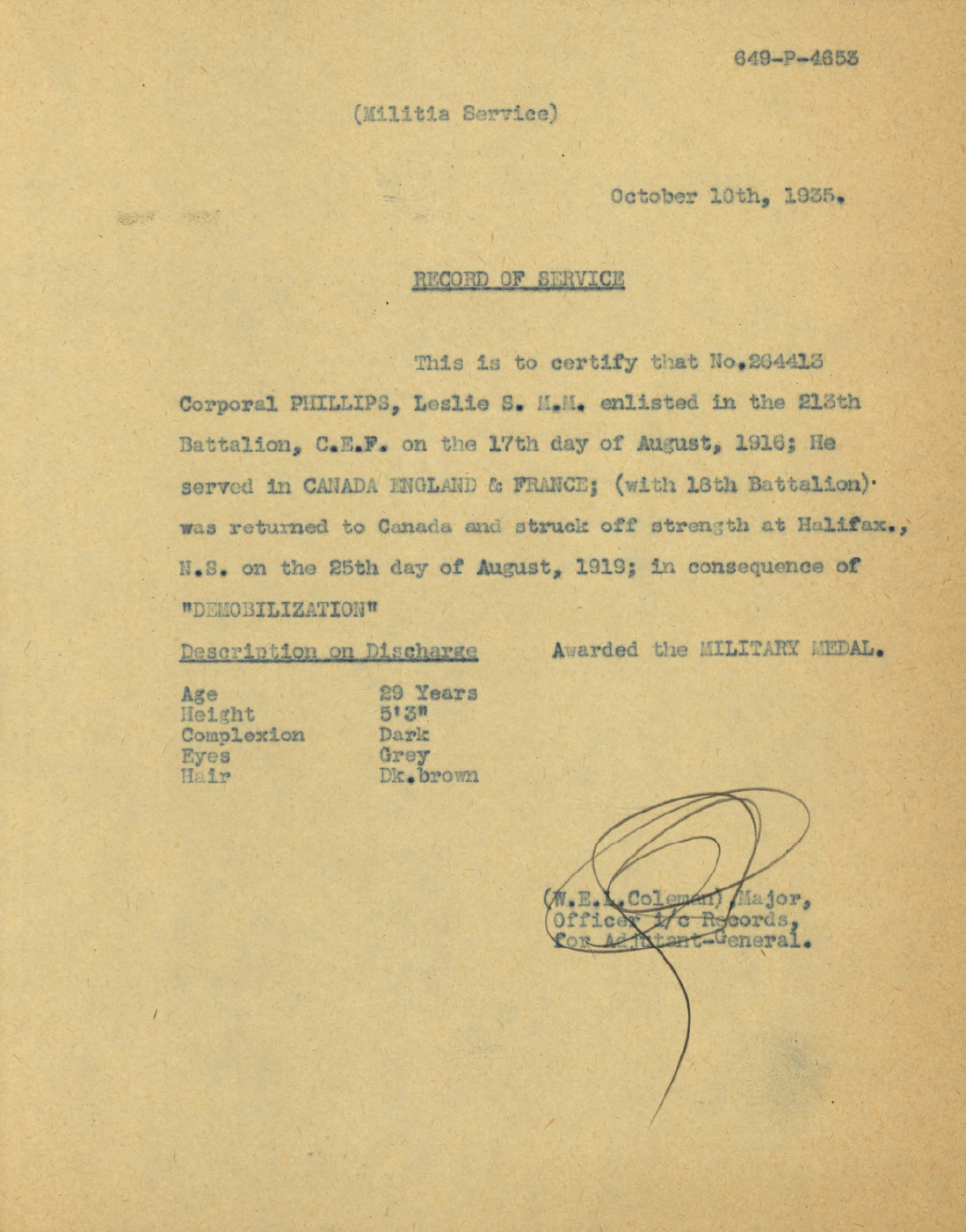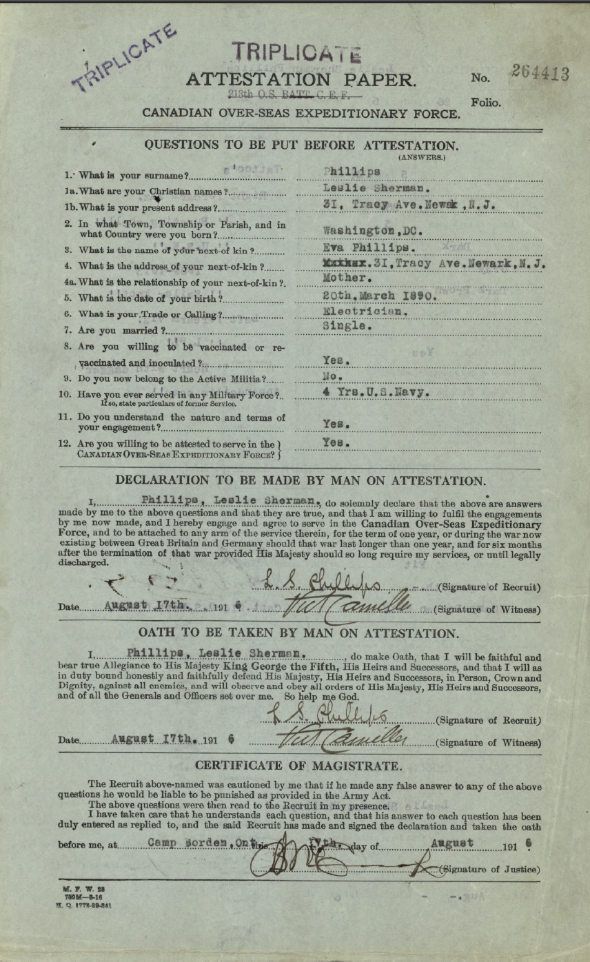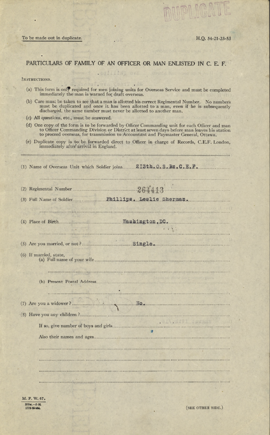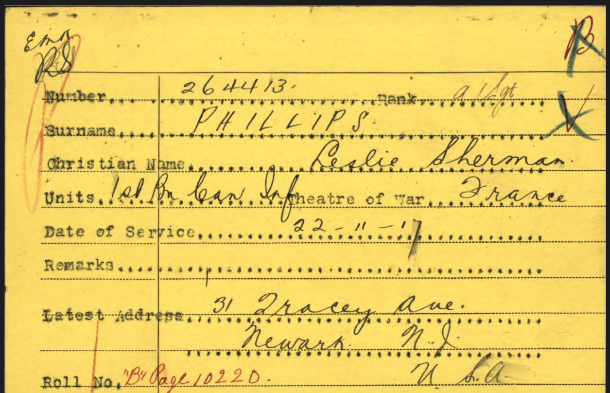 Family Search: Private Leslie Sherman Phillips was born on 20 March 1890, in Washington, District of Columbia, United States as the son of Phillips and Eva. He had at least 1 son and 2 daughters with Grace Frances Snow. He immigrated to Saint John, St. John, New Brunswick, Canada in 1919 and lived in Newark, Essex, New Jersey, United States in 1916. He registered for military service in 1916. In 1916, at the age of 26, his occupation is listed as electrician in Newark, Essex, New Jersey, United States.