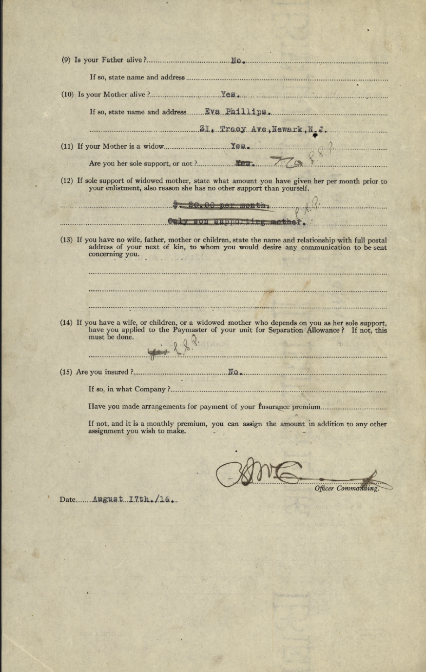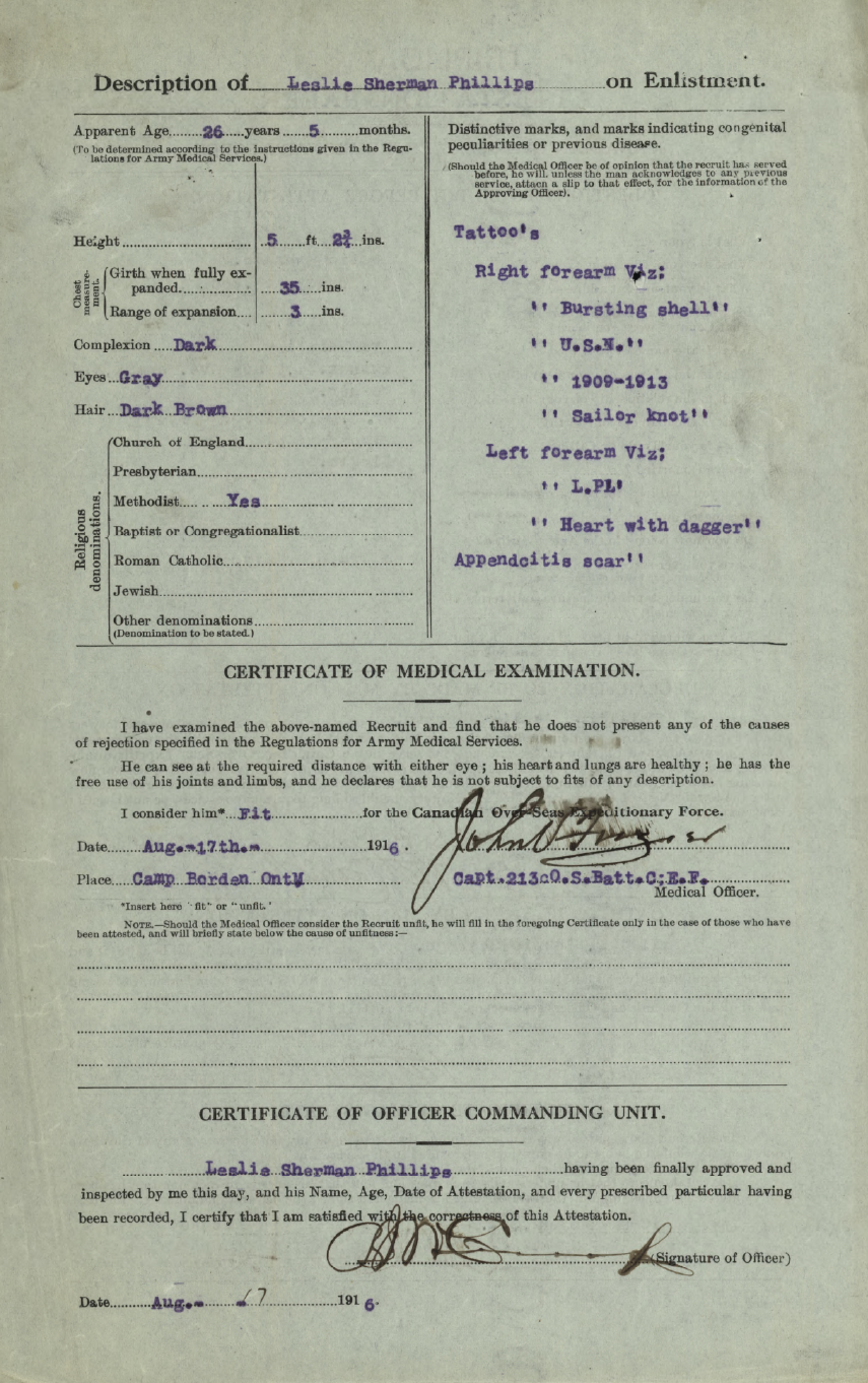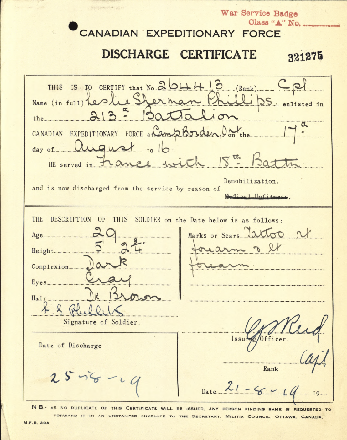 Family Search: Private Leslie Sherman Phillips was born on 20 March 1890, in Washington, District of Columbia, United States as the son of Phillips and Eva. He had at least 1 son and 2 daughters with Grace Frances Snow. He immigrated to Saint John, St. John, New Brunswick, Canada in 1919 and lived in Newark, Essex, New Jersey, United States in 1916. He registered for military service in 1916. In 1916, at the age of 26, his occupation is listed as electrician in Newark, Essex, New Jersey, United States.