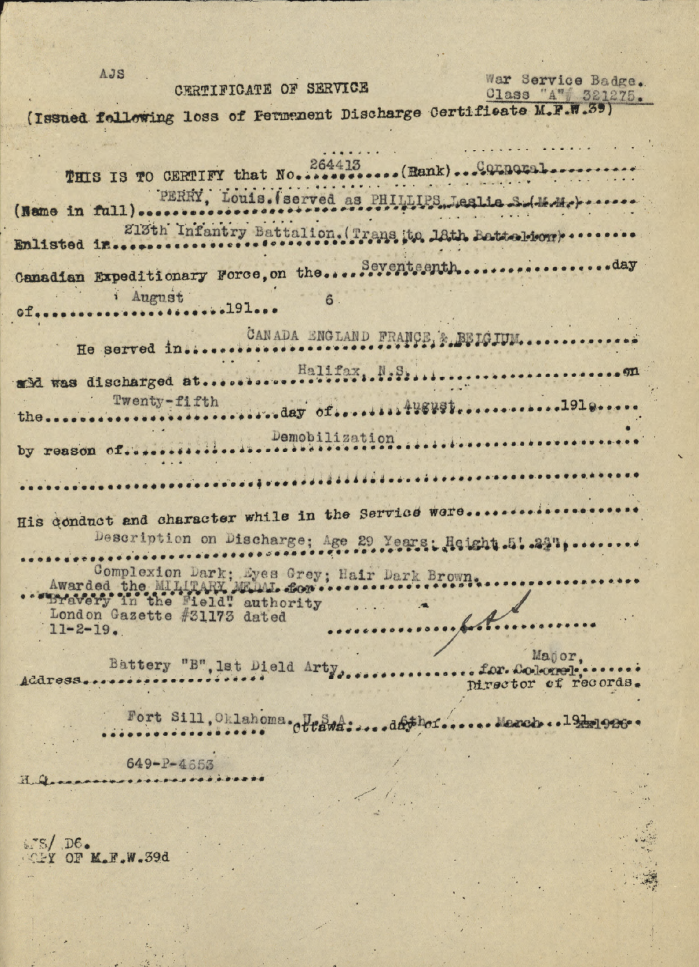Corporal Leslie Sherman Phillips AKA Perry Louis, reg. no. 264413. Marries a Grace F in “London” in 26 March 1919. SOS to H Wing, Married Mens Pool, Witley. Children, Doris Louise and William Sherman.