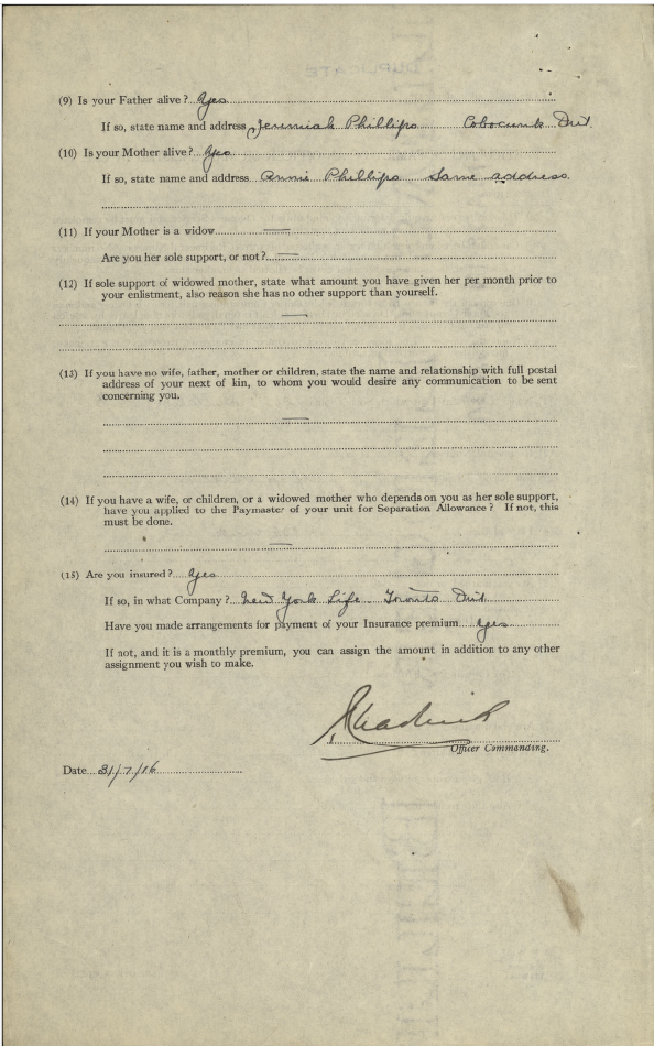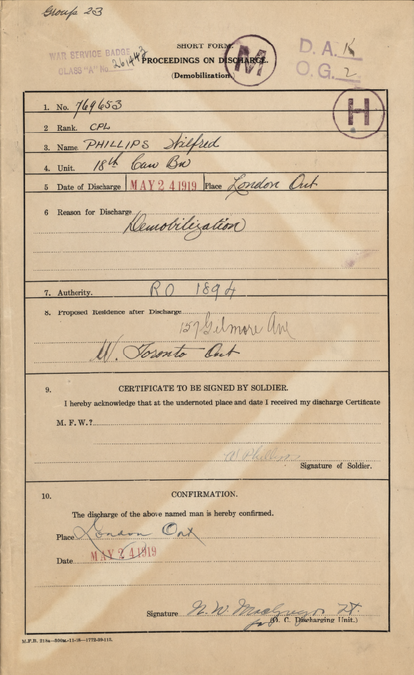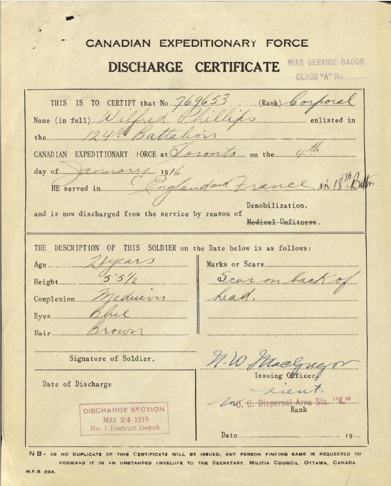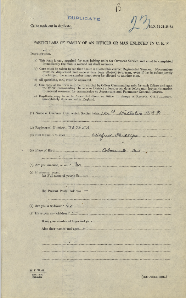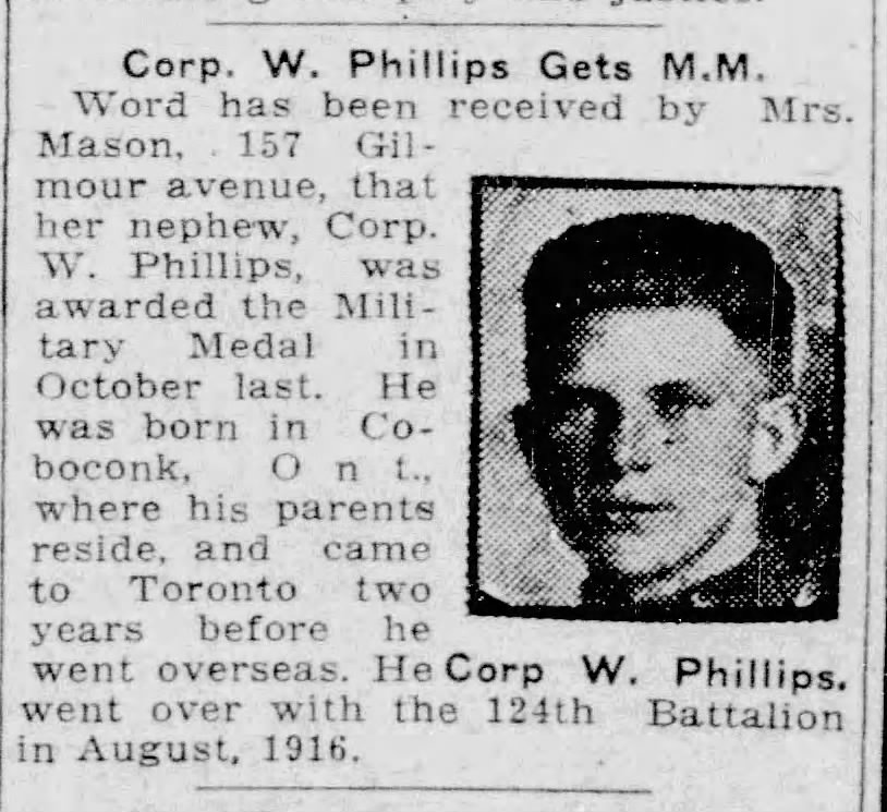 Family Search: When Corporal Wilfred Phillips was born on 17 December 1897, in Coboconk, Victoria, Ontario, Canada, his father, Jeremiah Gerry Phillips, was 31 and his mother, Annie Graham, was 22. He married Helen V. Carr on 31 July 1924. They were the parents of at least 2 sons and 2 daughters. He lived in Toronto, York, Ontario, Canada for about 7 years and Parkdale, Toronto, Ontario, Canada in 1931. He registered for military service in 1916. In 1916, at the age of 19, his occupation is listed as electrician in Toronto, York, Ontario, Canada. He died on 2 April 1976, in Toronto, Ontario, Canada, at the age of 78, and was buried in Riverside Cemetery, Etobicoke, Toronto, Ontario, Canada.