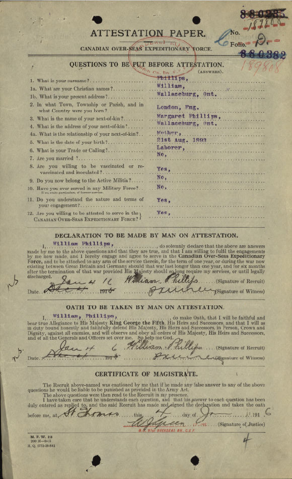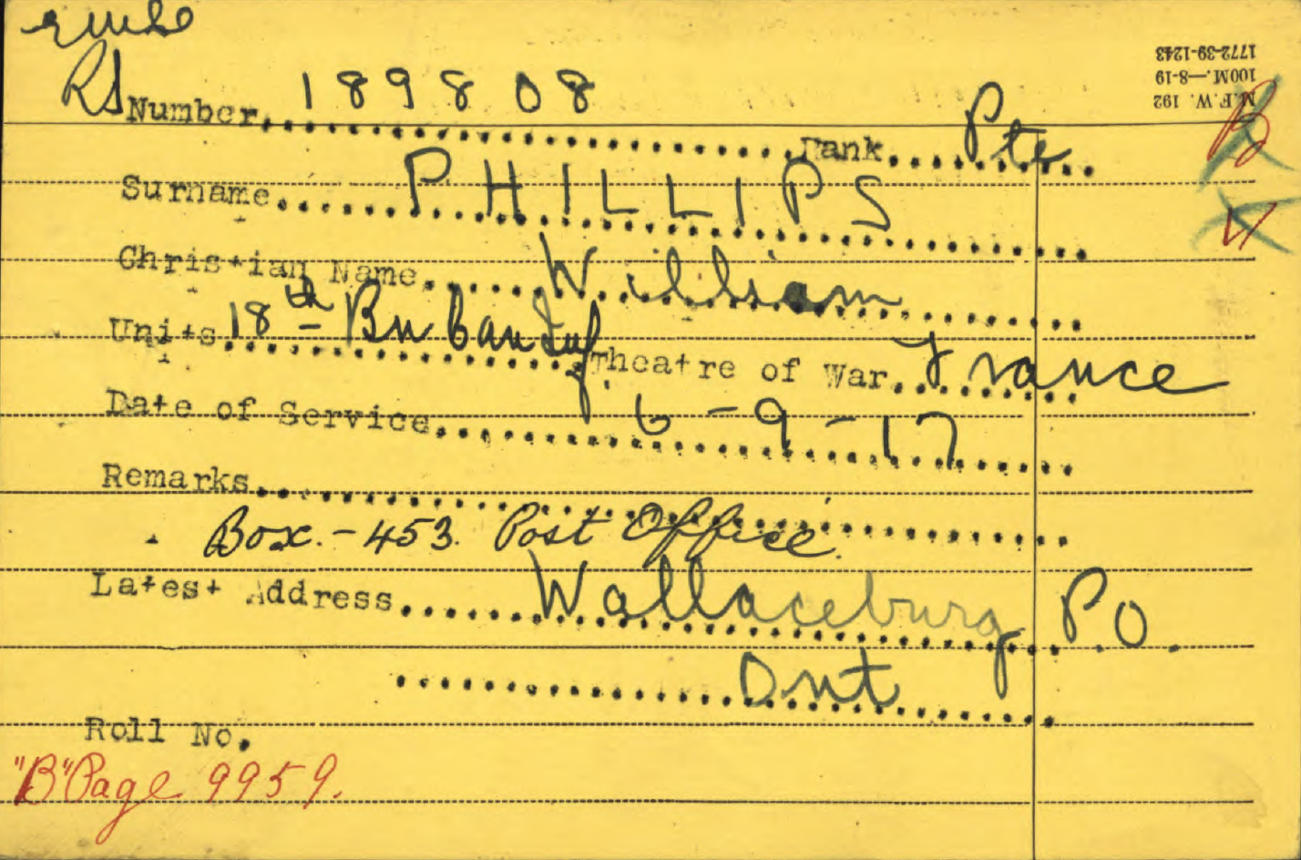 Family Search: Private William Phillips was born on 21 August 1893, in Stepney, London, England, United Kingdom as the son of Phillips and Margaret. He immigrated to Canada in 1913 and lived in Wallaceburg, Kent, Ontario, Canada in 1916. He registered for military service in 1916. In 1916, at the age of 23, his occupation is listed as labourer in Wallaceburg, Kent, Ontario, Canada.