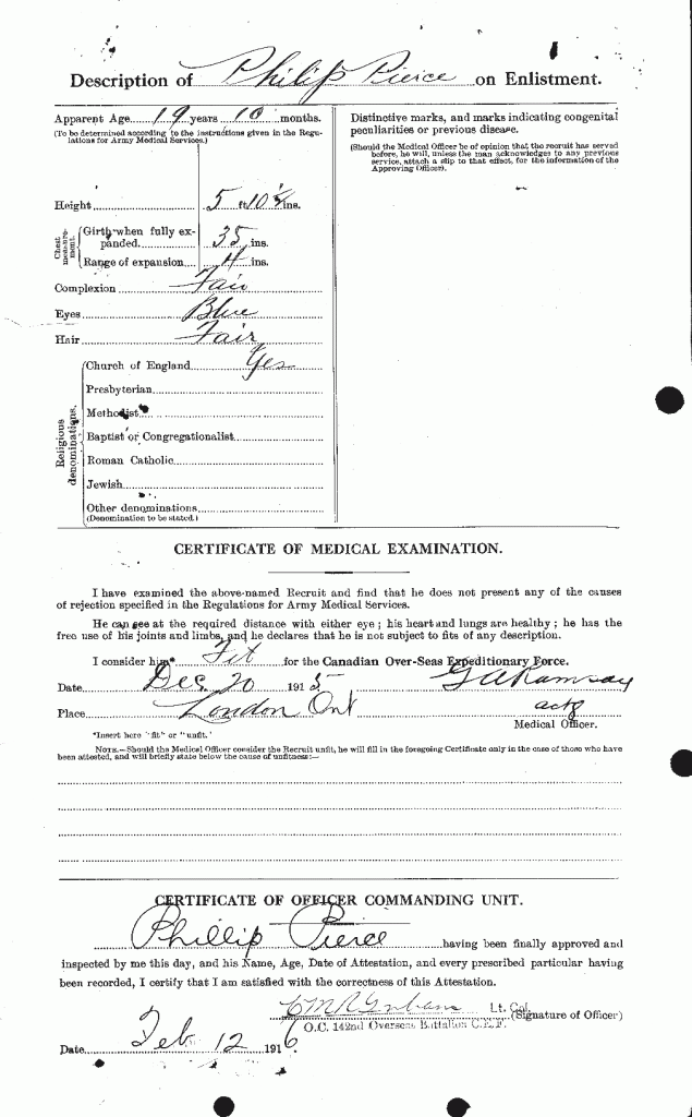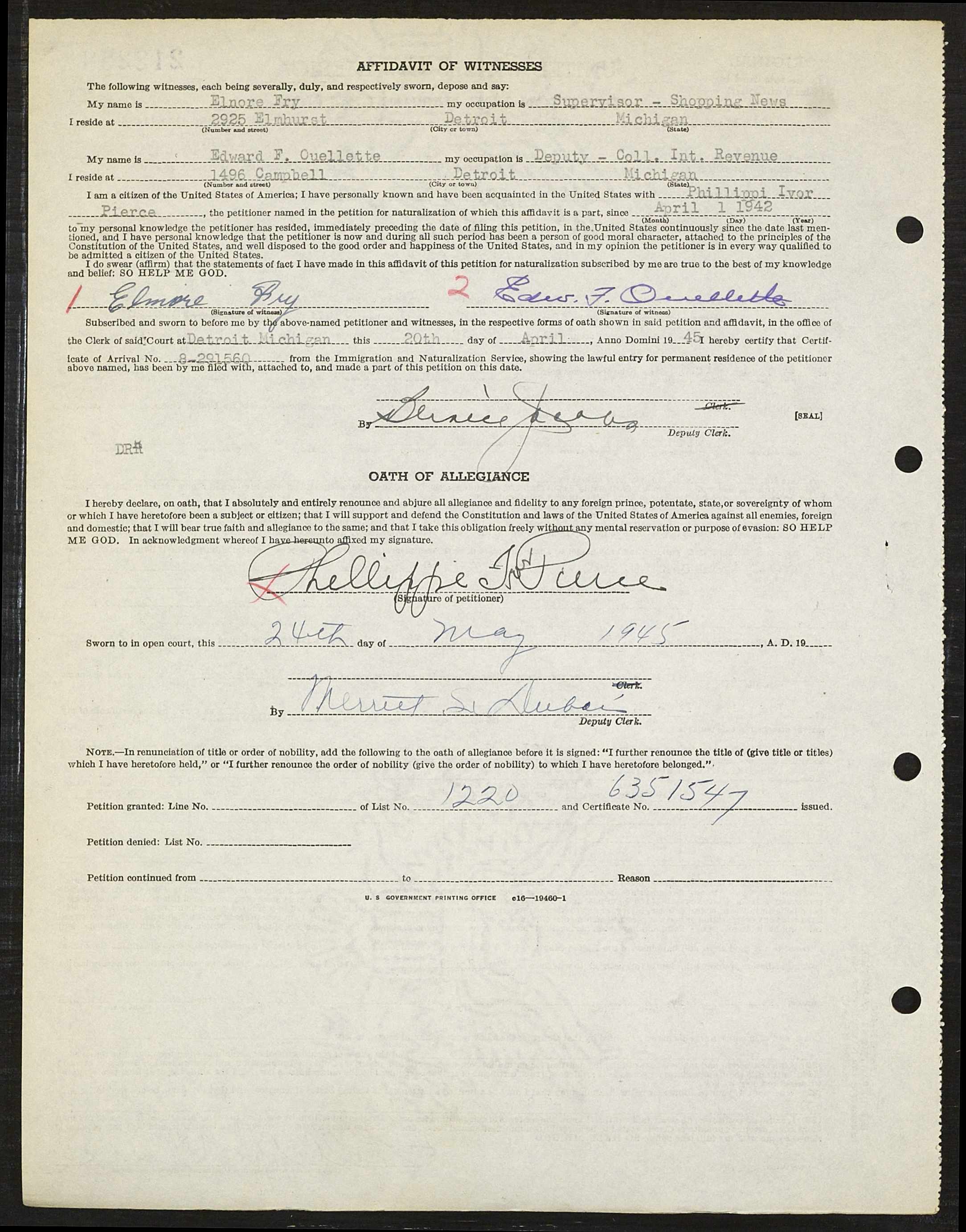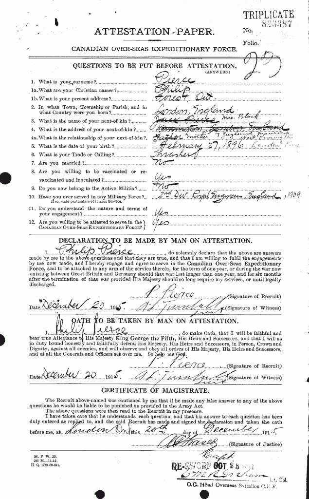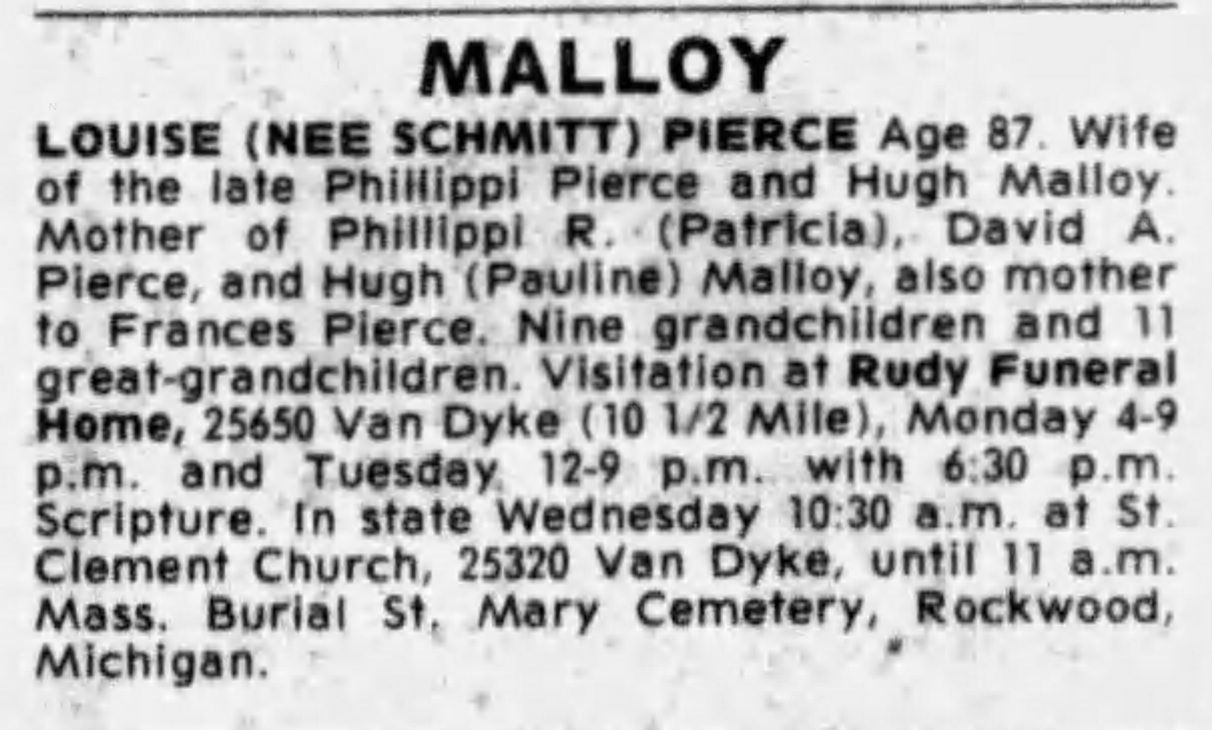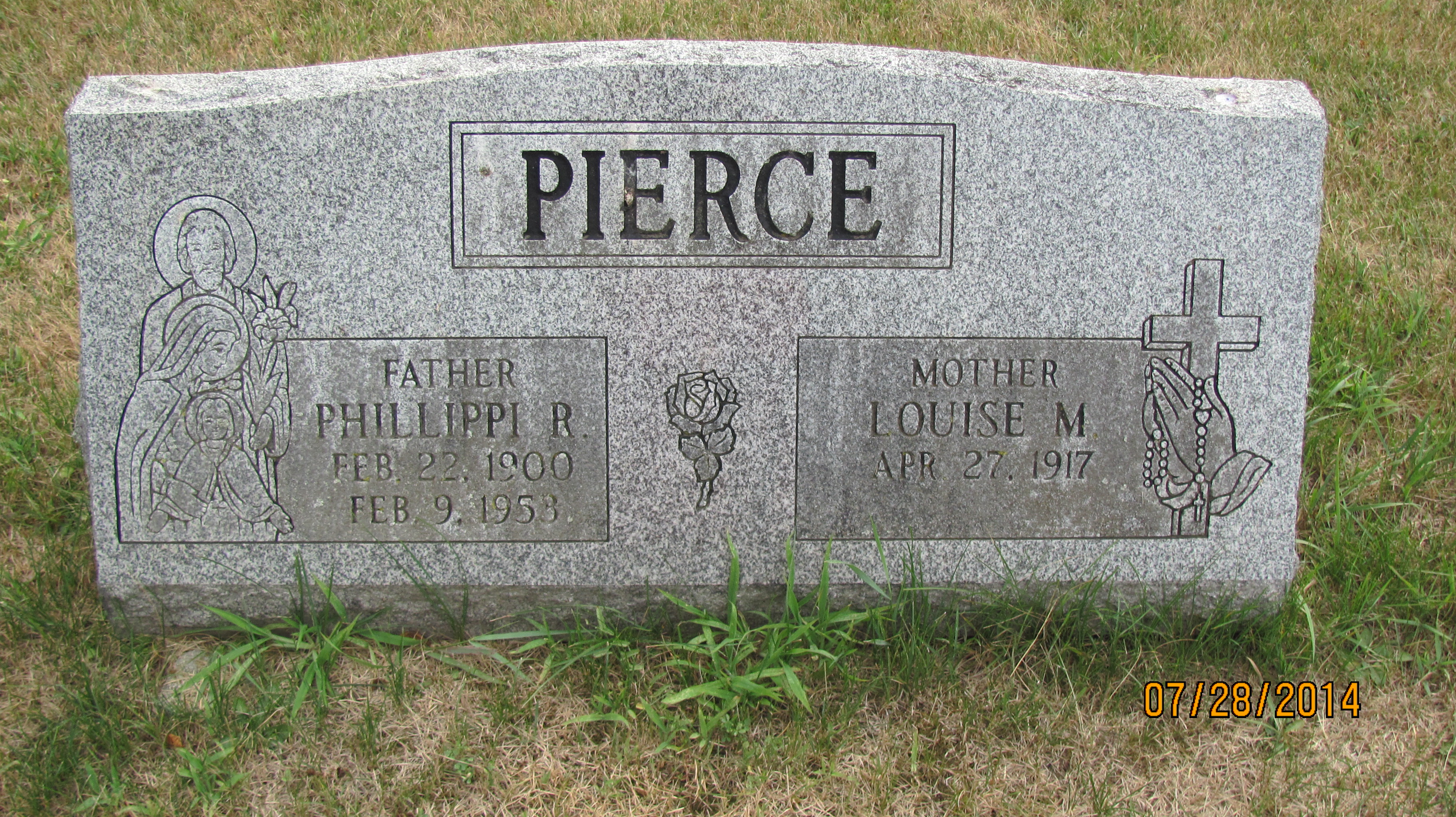 Family Search: Private Phillipi Ivor Pierce was born on 22 February 1900, in London, England, United Kingdom as the son of Jack Pierce and E.. He had at least 2 sons and 1 daughter with Louise Margaret Schmitt. He immigrated to Detroit, Wayne, Michigan, United States in 1919 and lived in Detroit Ward 20, Detroit, Wayne, Michigan, United States in 1935 and Detroit, Wayne, Michigan, United States for about 4 years. He registered for military service in 1915. In 1945, at the age of 45, his occupation is listed as circulation supervisor, shopping news in Detroit, Wayne, Michigan, United States. He died on 9 February 1953, at the age of 52, and was buried in Saint Marys Cemetery, Rockwood, Wayne, Michigan, United States.