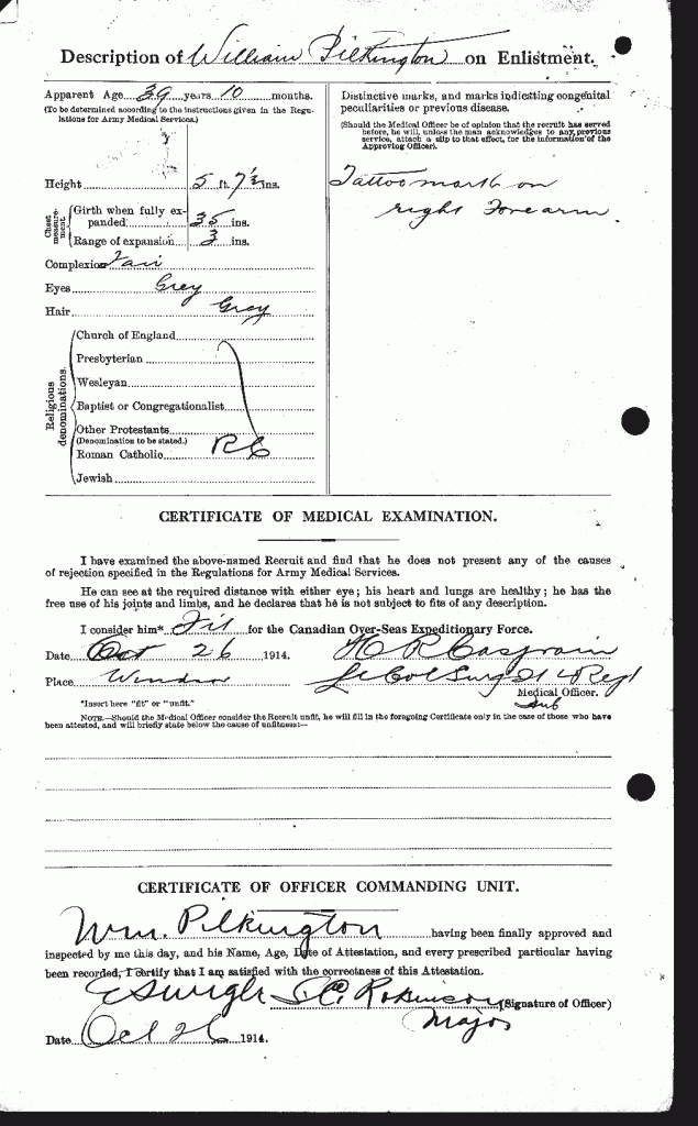Pilkington states that he returned to Canada and was offered his pro rata of land, but he goes for the sea and wanted no land. His discharge papers read effective July 5, 1917, while his medal of honor reads service from April 1915 to July 5, 1917.