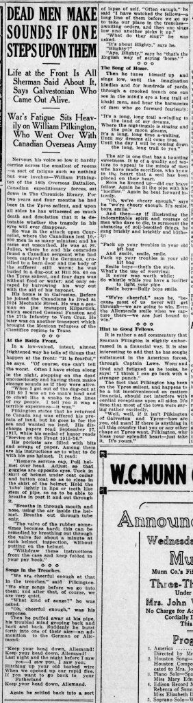 Nervous, his voice so low it hardly carries across the smallest of rooms—a sort of fatigue such as nothing but war invokes—William Pilkington of the 18th Overseas Battalion, Canadian expeditionary forces, sat down in the Chronicle library. For two years and four months he had been in the Ypres salient, and upon all sides he has witnessed so much death and desolation that it is debatable whether the tragedy in his eyes will ever disappear.