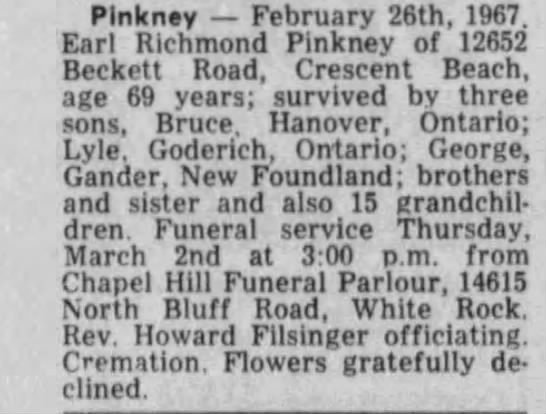 Family Search: When Earl Richmond Pinkney was born on 21 April 1897, in Brant Township, Bruce, Ontario, Canada, his father, Robert Pinkney, was 38 and his mother, Sarah Wilson, was 35. He married Nora Gertrude Blake on 5 April 1920, in Brant Township, Bruce, Ontario, Canada. They were the parents of at least 4 sons. He lived in Elmwood, West Grey, Grey, Ontario, Canada in 1922 and Crescent Beach, Surrey, British Columbia, Canada in 1967. He registered for military service in 1917. In 1917, at the age of 20, his occupation is listed as farmer in Walkerton, Bruce, Ontario, Canada. He died on 26 February 1967, in White Rock, British Columbia, Canada, at the age of 69.