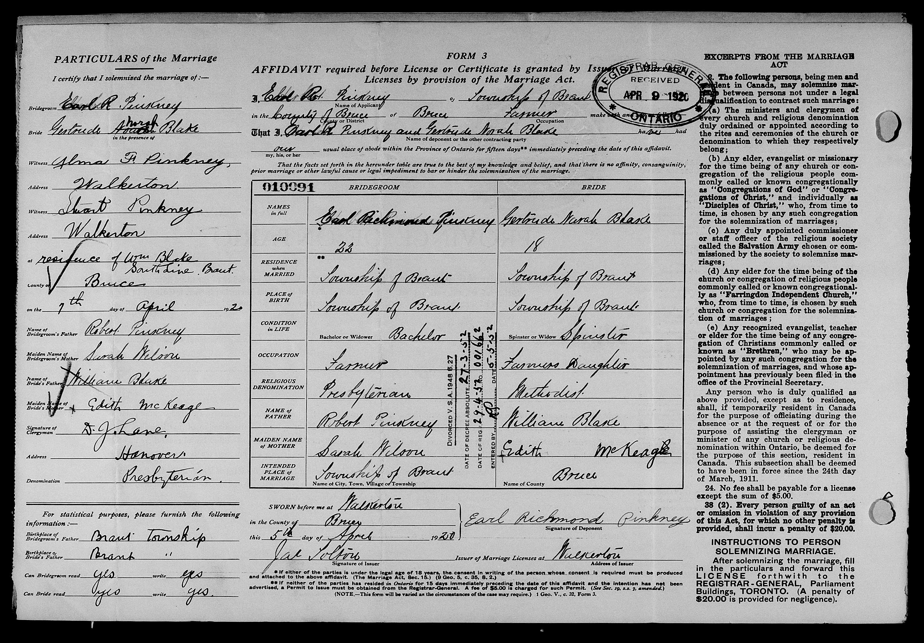 Family Search: When Earl Richmond Pinkney was born on 21 April 1897, in Brant Township, Bruce, Ontario, Canada, his father, Robert Pinkney, was 38 and his mother, Sarah Wilson, was 35. He married Nora Gertrude Blake on 5 April 1920, in Brant Township, Bruce, Ontario, Canada. They were the parents of at least 4 sons. He lived in Elmwood, West Grey, Grey, Ontario, Canada in 1922 and Crescent Beach, Surrey, British Columbia, Canada in 1967. He registered for military service in 1917. In 1917, at the age of 20, his occupation is listed as farmer in Walkerton, Bruce, Ontario, Canada. He died on 26 February 1967, in White Rock, British Columbia, Canada, at the age of 69.