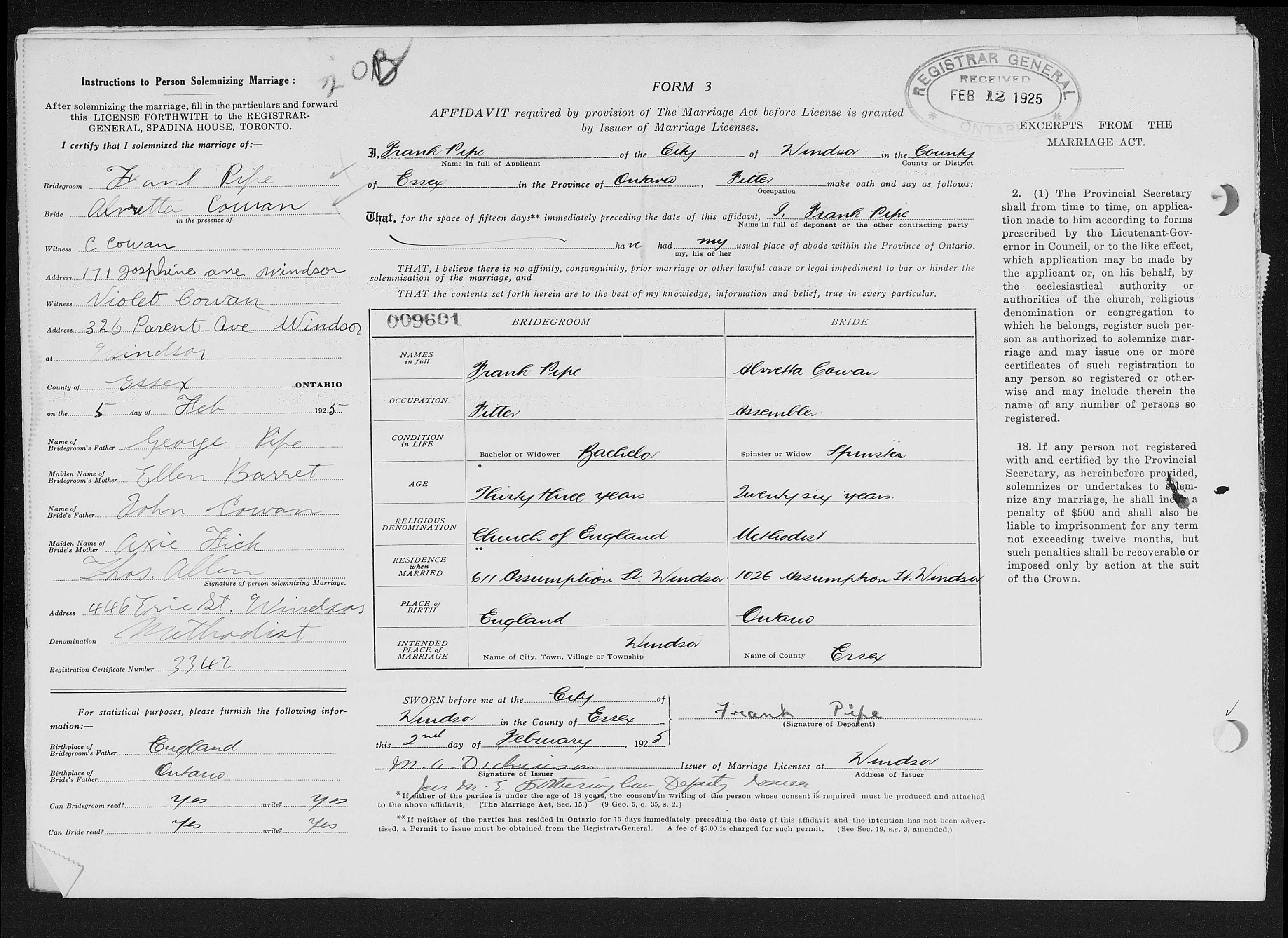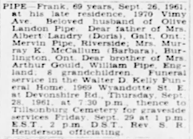Family Search: When Private Frank Pipe was born on 10 October 1891, in Bournemouth, Dorset, England, United Kingdom, his father, George William Pipe, was 28 and his mother, Lydia Ellen Rolls, was 27. He married Alvaretta Cowan on 5 February 1925, in Windsor, Essex, Ontario, Canada. They were the parents of at least 1 son and 2 daughters. He lived in Lytchett Minster, Dorset, England, United Kingdom for about 10 years and in Springfield, Elgin, Ontario, Canada in 1921. He registered for military service in 1914. In 1921, his occupation is listed as maintenance superintendent, Ford Canada in Windsor, Essex, Ontario, Canada. He died on 26 September 1961, in Windsor, Essex, Ontario, Canada, at the age of 69, and was buried in Tillsonburg Cemetery, Tillsonburg, Oxford, Ontario, Canada.