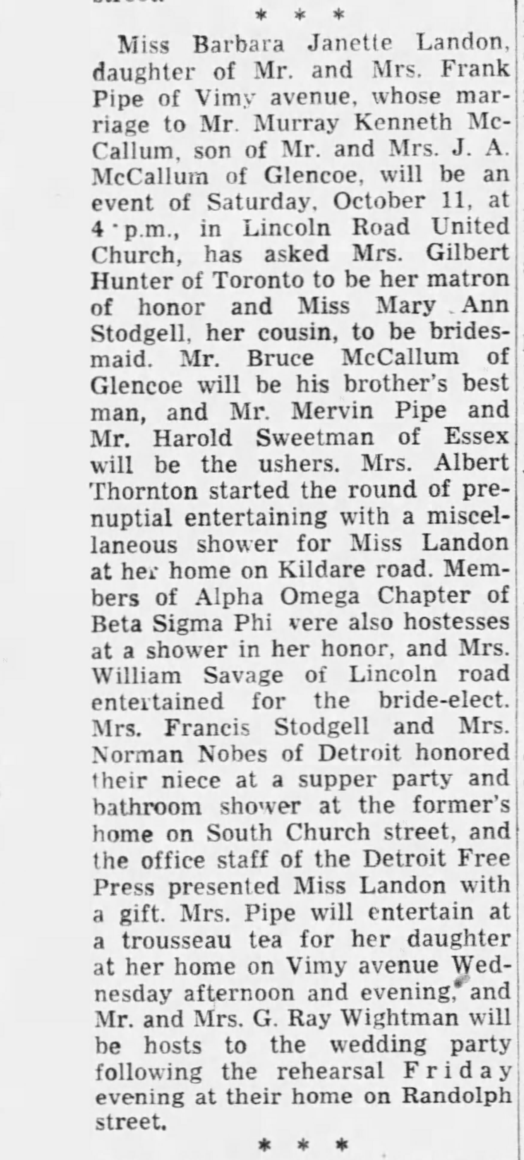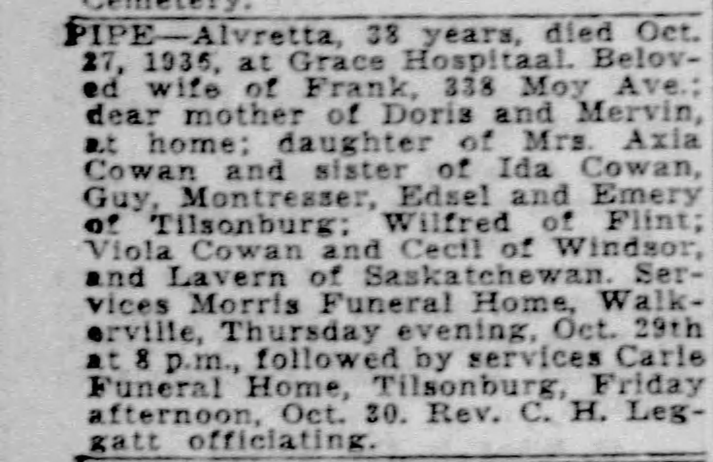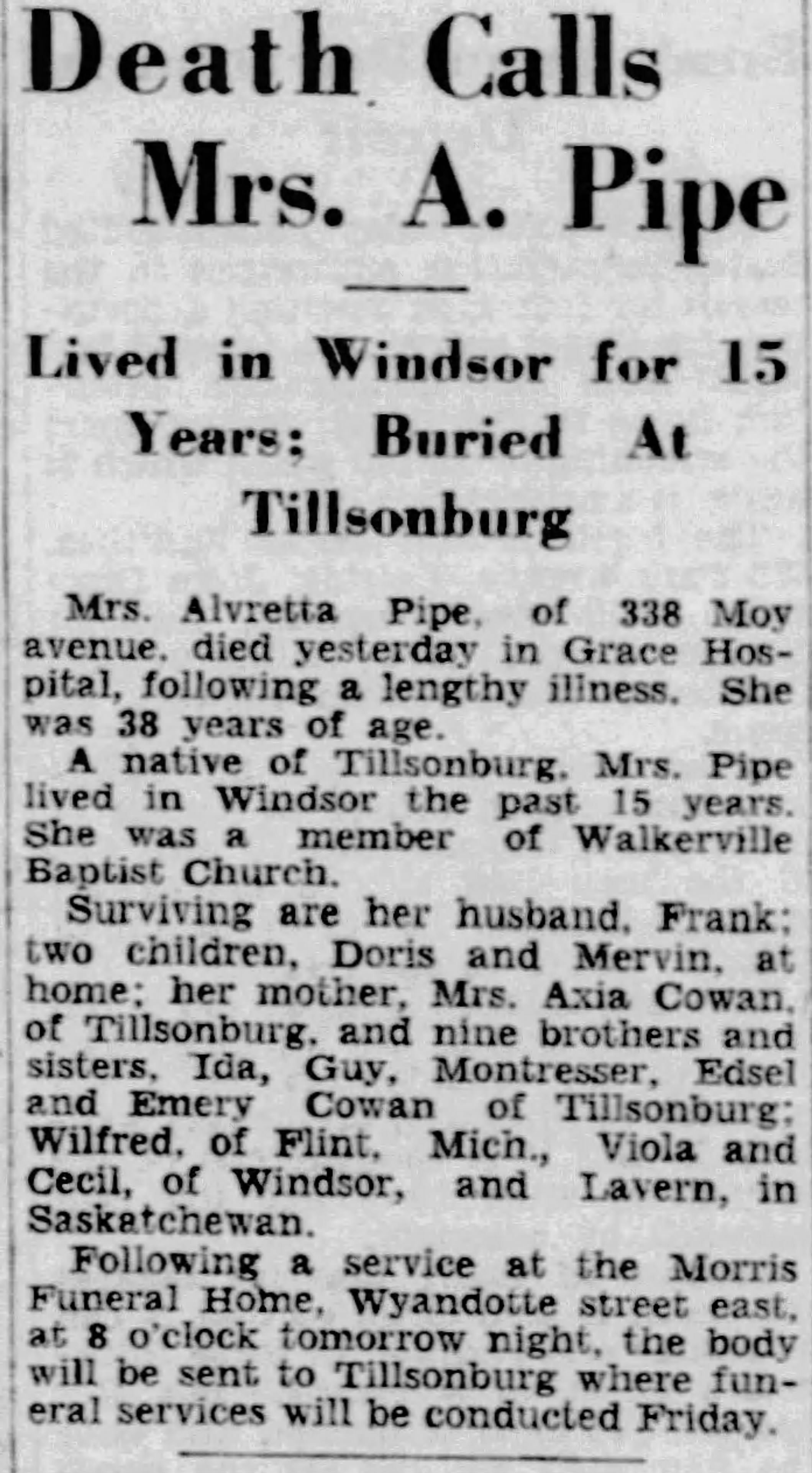Funeral services will be held on Thursday at 7:30 p.m. at the Walter D. Kelly Funeral Home, 1989 Wyandotte St. E. Rev. S. R. Henderson officiating. Graveside service will be held in Tillsonburg at 1 p.m. E.S.T. on Friday.