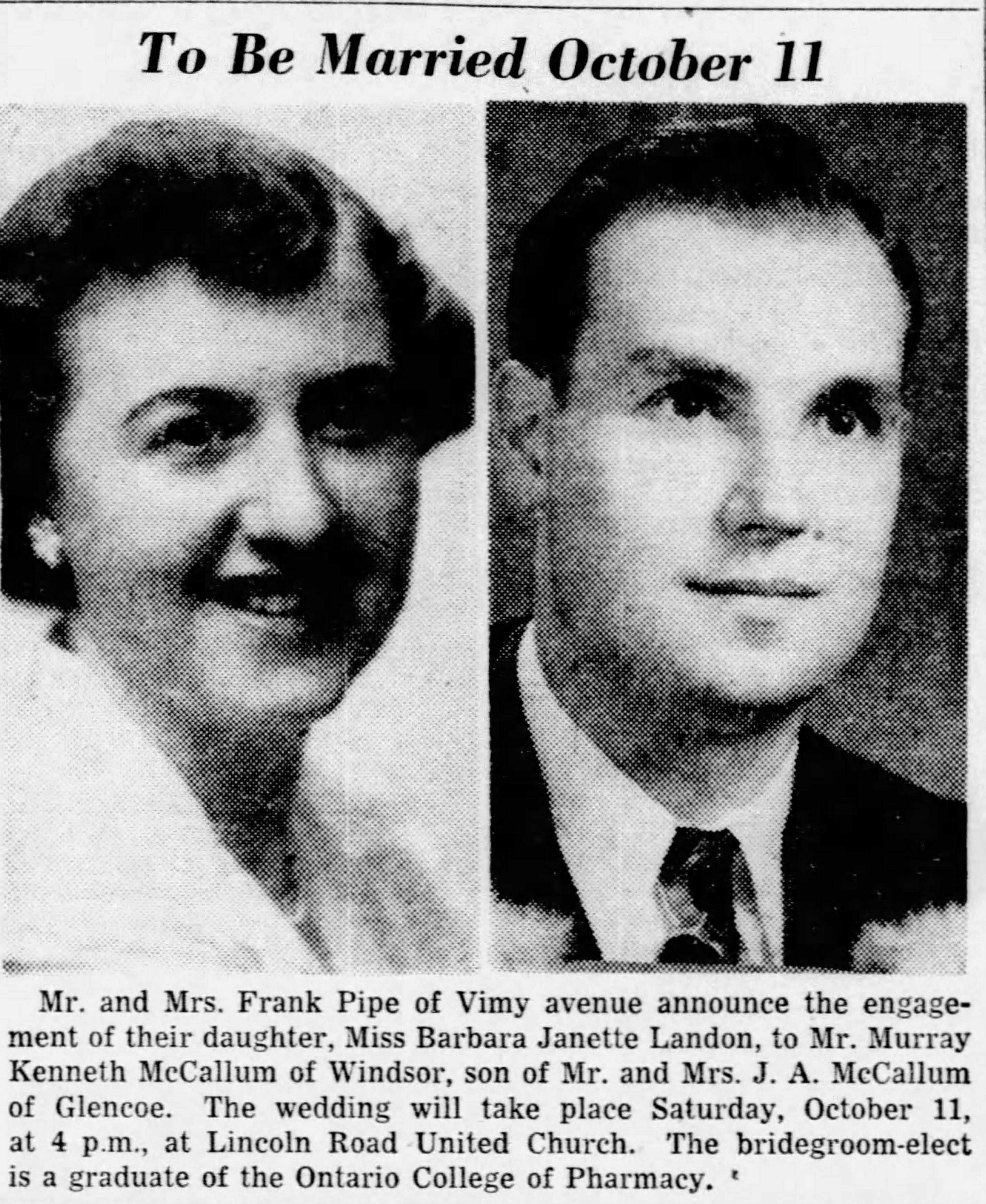 In addition to his widow, Olive, he is survived by one son, Mervin, Riverside; two daughters, Mrs. Albert (Doris) Landry, of Galt, and Mrs. Murray K. (Barbara) McCallum, of Burlington; one brother, William; one sister, Mrs. Arthur Gold, both of Bournemouth.