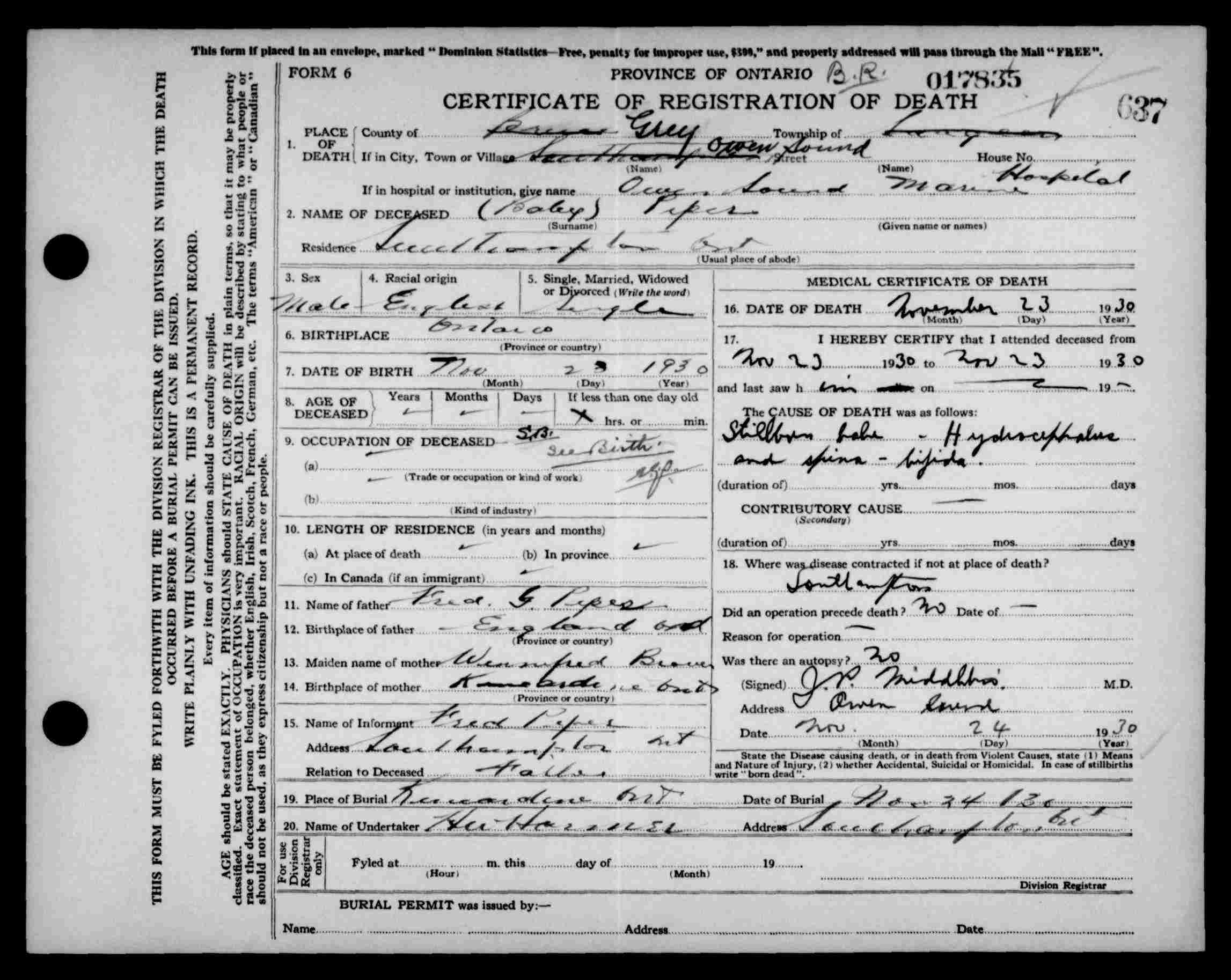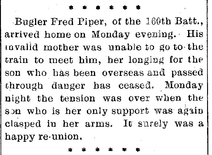 Family Search: Private Frederick George Piper was born on 26 September 1891, in London, England, United Kingdom as the son of George Frederick Piper Sr. and Maude Elderwood. He married Winifred Enid Gladys Brown on 29 June 1921, in Kincardine, Bruce, Ontario, Canada. They were the parents of at least 1 son. He immigrated to Canada in 1913 and lived in Kincardine, Bruce, Ontario, Canada in 1921. In 1921, at the age of 30, his occupation is listed as cabinet maker in Kincardine, Bruce, Ontario, Canada. He died on 8 November 1982, in Wiarton, Bruce, Ontario, Canada, at the age of 91, and was buried in Southampton Cemetery, Southampton, Bruce, Ontario, Canada.