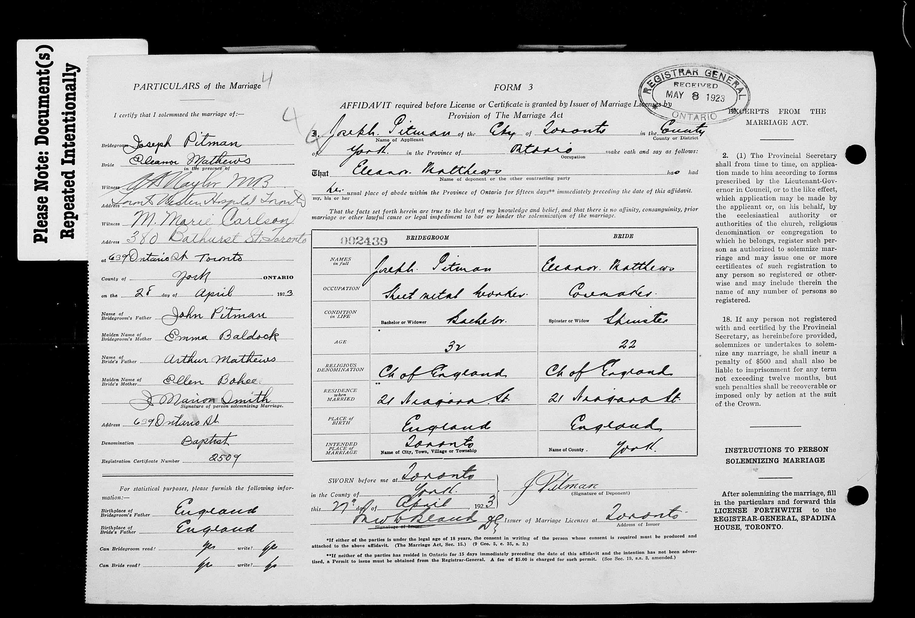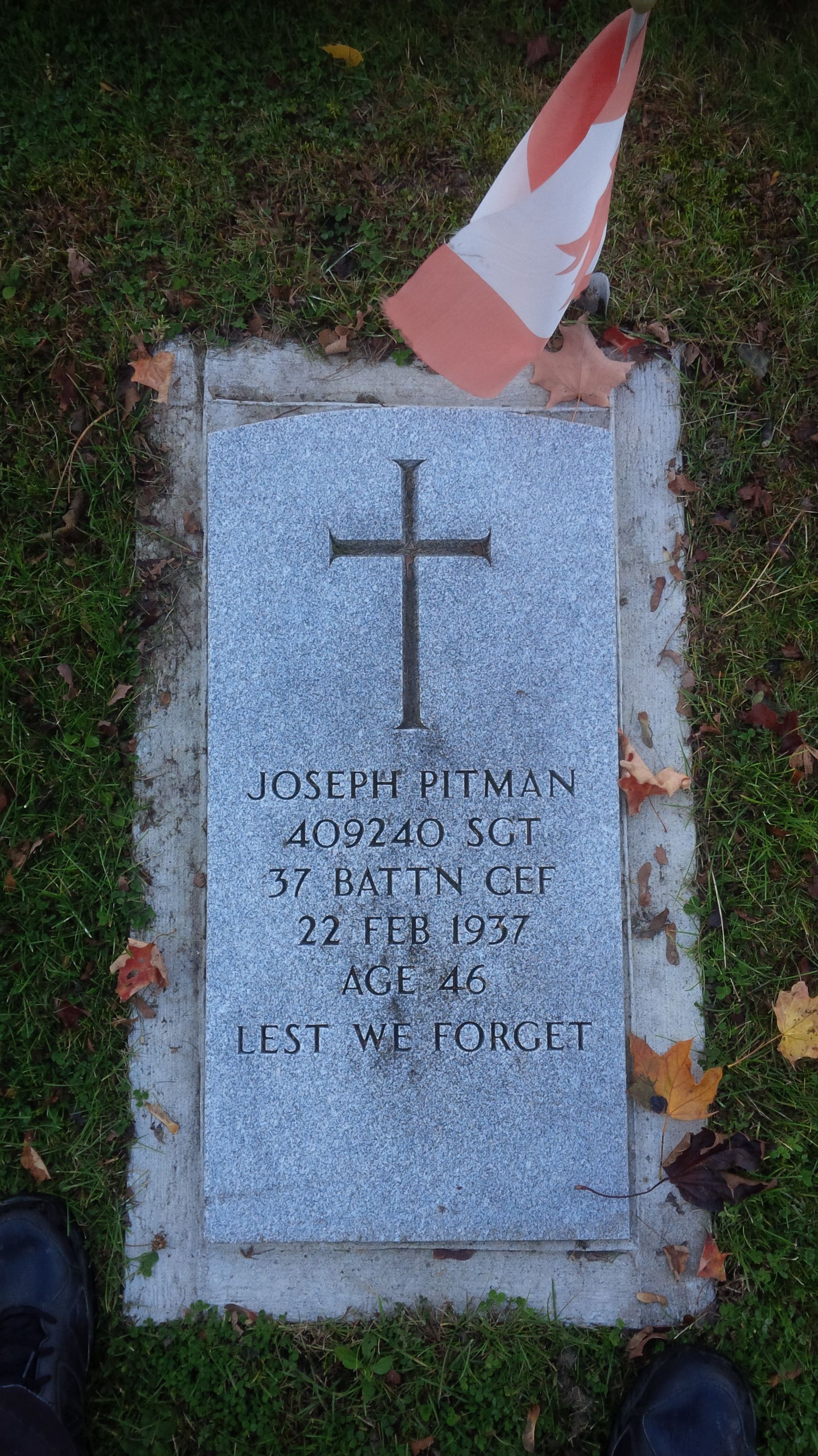 Family Search: Sergeant Joseph Pitman was born on 11 April 1890, in Stockingford, Warwickshire, England, United Kingdom as the son of John Pitman and Emma Baldock. He married Elenor Matthews on 27 April 1923, in York, Toronto, Ontario, Canada. He immigrated to Canada in 1913 and lived in Oshawa, Ontario, Ontario, Canada in 1915 and Toronto, York, Ontario, Canada in 1923. He registered for military service in 1915. In 1923, at the age of 33, his occupation is listed as sheet metal worker in Toronto, York, Ontario, Canada. He died on 22 February 1937, in Oshawa, Durham, Ontario, Canada, at the age of 46, and was buried in Union Cemetery, Oshawa, Durham, Ontario, Canada.