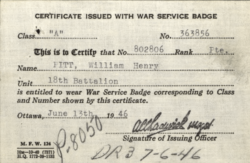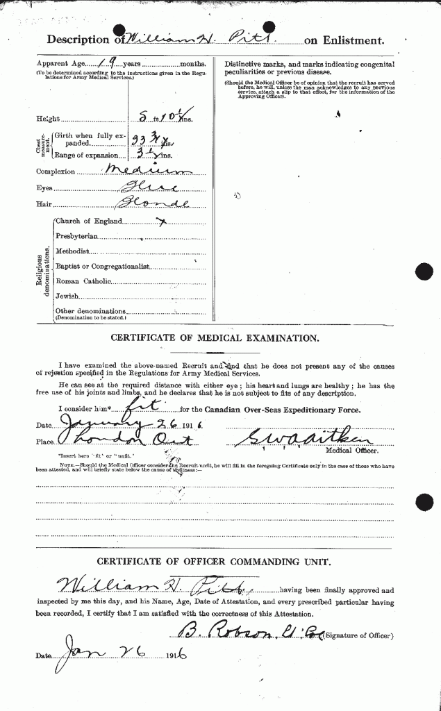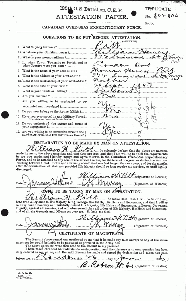 Family Search: When William Henry Pitt was born on 29 September 1898, in London Township, Middlesex, Ontario, Canada, his father, Thomas Henry Pitt, was 32 and his mother, Frances Edith ‘Fanny’ Baker, was 33. He married Gladys Scott on 27 October 1920, in London Township, Middlesex, Ontario, Canada. They were the parents of at least 1 son and 1 daughter. He lived in London, Ontario, Canada West, British Colonial America in 1911 and London, Ontario, Canada in 1916. He registered for military service in 1916. In 1916, at the age of 18, his occupation is listed as student in London, Ontario, Canada. He died on 27 October 1965, in London Township, Middlesex, Ontario, Canada, at the age of 67, and was buried in Woodland Cemetery, London, Ontario, Canada.