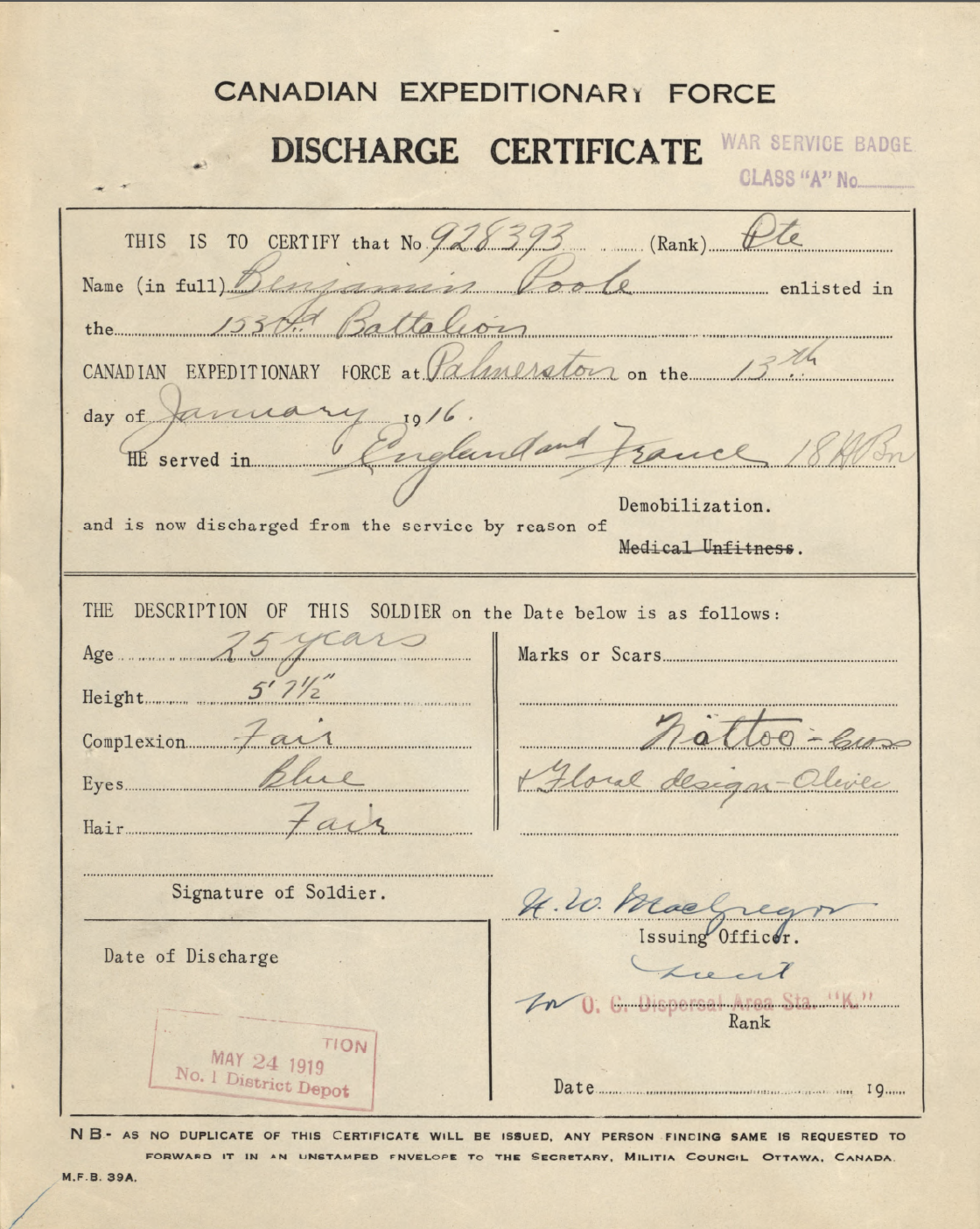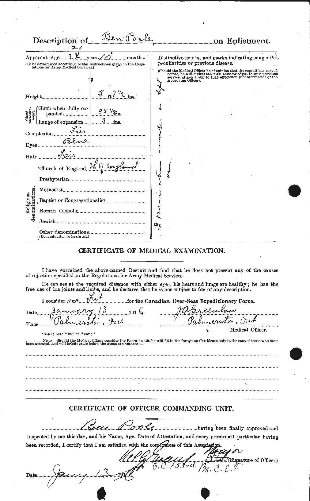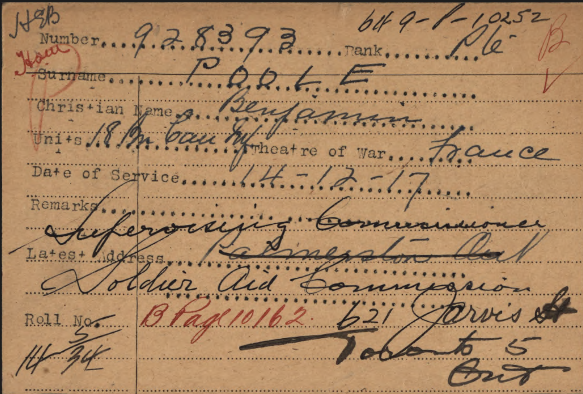 Trade listed as Mail Clerk. DOB 8-3-94 (Ontario Birth Certificate 8-3-92 at Bruce County). Born Port Elgin, Ontario. Oliver Poole, father. Sarah Harvey, mother. 5 foot 7 1/2 inches. Blue eyes, fair hair. Church of England. NOK Hazel (Claridge) Poole, wife, married 11-6-14 at Stratford, to reside in Palmerston. Enlisted Palmerston 13-1-16 (age 21 years 10 months). On 153rd Battalion Nominal Roll 29-1-16, no transfer noted. On 153rd Nominal Rolls as published Guelph Mercury 10-6-16 and 1-12-16. Embarked with 153rd Halifax N.S. SS Olympic 29-4-17. Taken on Strength 18th Battalion 14-12-17. Court Martial AWOL 17-11-18 until apprehended 7-2-19. Sentenced to 6 months. Commuted to 90 days, loss of 82 days pay. Returned to Canada for Discharge aboard SS Caronia, Halifax N.S. 22-5-19. Demobilized London, 24-5-10. 1921 Canadian Census: Benjamin and Hazel Poole, (plus 1 daughter), Brantford, Ontario.