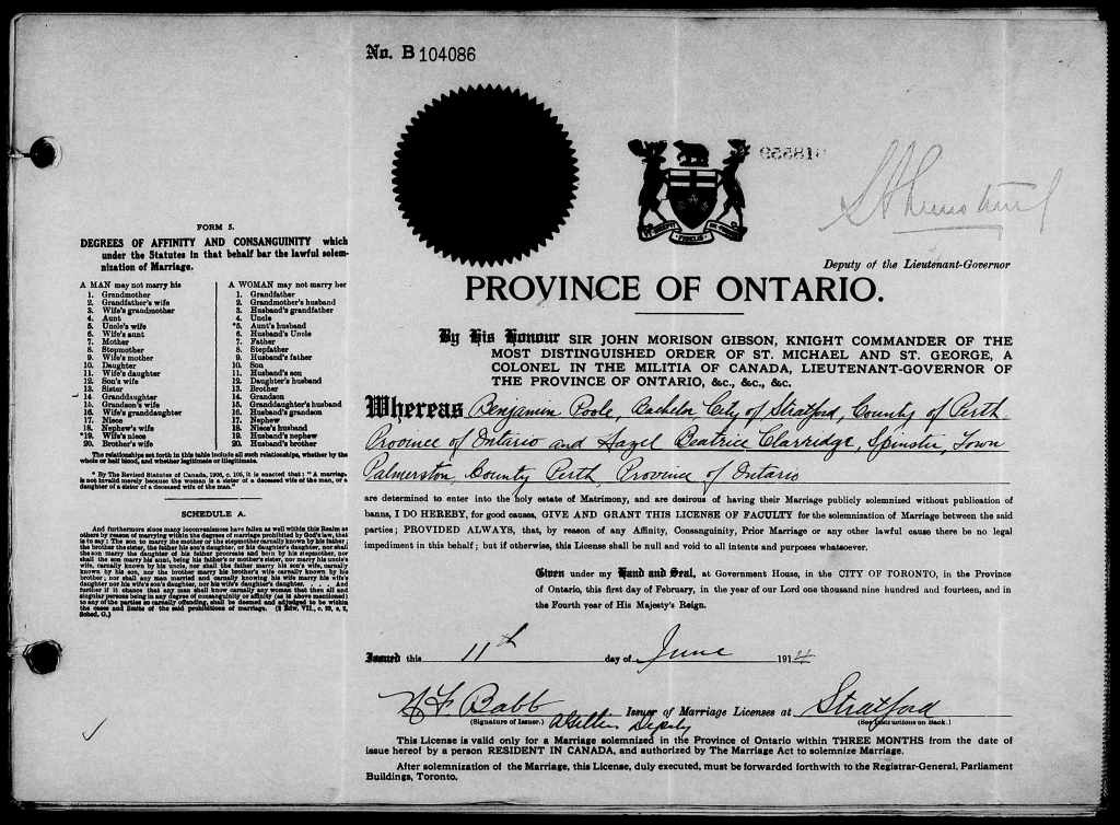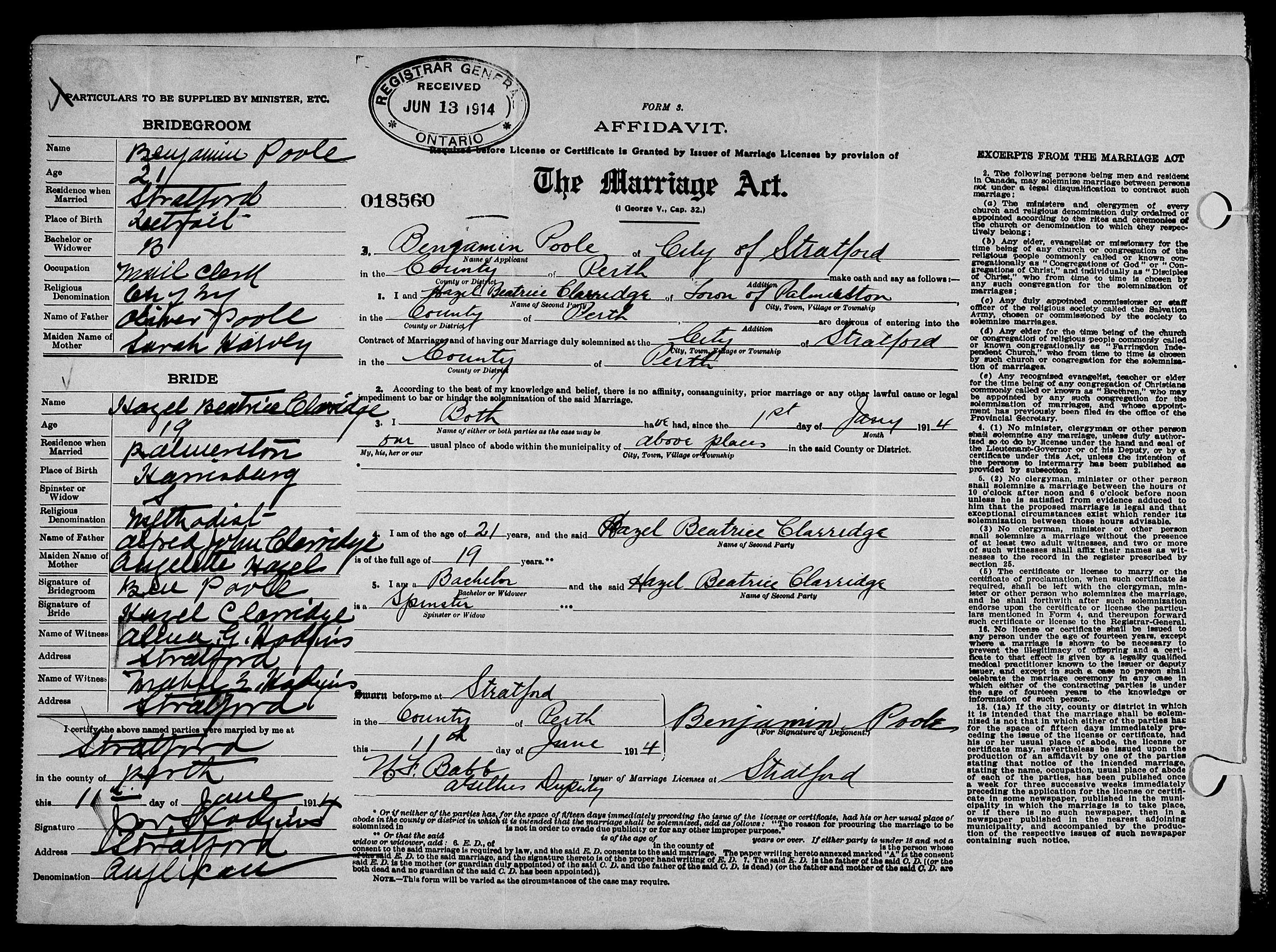 Family Search: When Benjamin Poole was born on 8 March 1894, in Port Elgin, Saugeen Shores, Bruce, Ontario, Canada, his father, Oliver Poole, was 41 and his mother, Sarah Harvey, was 39. He married Hazel Beatrice Clarridge on 11 June 1914, in Stratford, Perth, Ontario, Canada. They were the parents of at least 1 daughter. He immigrated to Vermont, United States in 1912 and lived in Ontario, Canada in 1892 and Perth, Lanark, Ontario, Canada in 1911. He registered for military service in 1916.