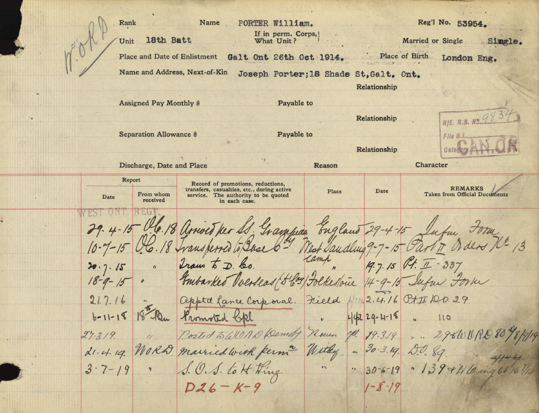Family Search: When Sergeant William Porter was born on 8 January 1889, in Islington, London, England, United Kingdom, his father, Joseph Porter, was 27 and his mother, Emily Pickerill, was 28. He married Ethel K. Booth in 1919, in Wolverhampton, Staffordshire, England, United Kingdom. He lived in Wolverhampton, Staffordshire, England, United Kingdom in 1901. He registered for military service in 1914. In 1914, at the age of 25, his occupation is listed as nickel plater in Galt, Waterloo, Ontario, Canada. He died on 24 December 1954, in Galt, Waterloo, Ontario, Canada, at the age of 65, and was buried in Mount View Cemetery, Cambridge, Waterloo, Ontario, Canada.