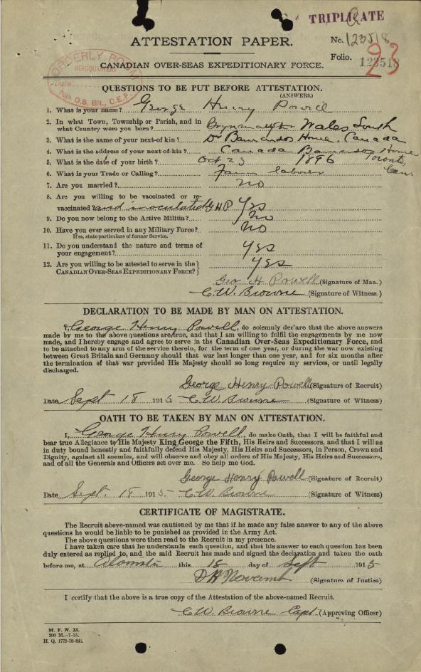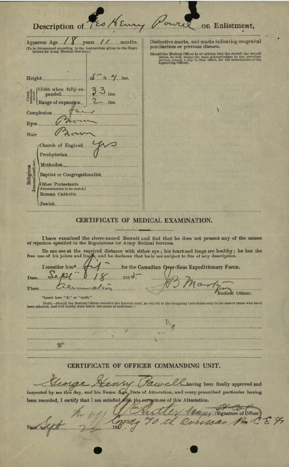 Family Search: Private George Henry Powell was born on 23 October 1896, in Brynmawr, Blaenau Gwent, Wales, United Kingdom. He immigrated to Halifax, Nova Scotia, Canada in 1908. He enlisted with the 70th Battalion at London at London, Ontario on 15 September 1915. He was a farm labourer at the time of his enlistment. He went overseas with the 70th and on 10 August 1916 he was drafted to the 18th Battalion and arrived just after the Battle of Flers Courcelette (15 September 1916) to a decimated battalion. He served with the 18th until wounded on 4 April 1918 with a GSW to the head. His treatment was on the Continent (France) and he was transferred to the 8th Battalion on 14 August 1918. Barely a month later this man was reassigned to the 18th Battalion arriving in 10 September 1918. He served the rest of the war with the 18th and saw occupation duty in Germany. Returning to Canada in May 1919 he was discharged when the 18th Battalion was officially disbanded at London, Ontario on 24 May 1919. He then lived in Florence, Lambton, Ontario, Canada in 1922. He died on 2 January 1974, in Vancouver, British Columbia, Canada, at the age of 77, and was buried in Victory Memorial Park, Surrey, British Columbia, Canada.