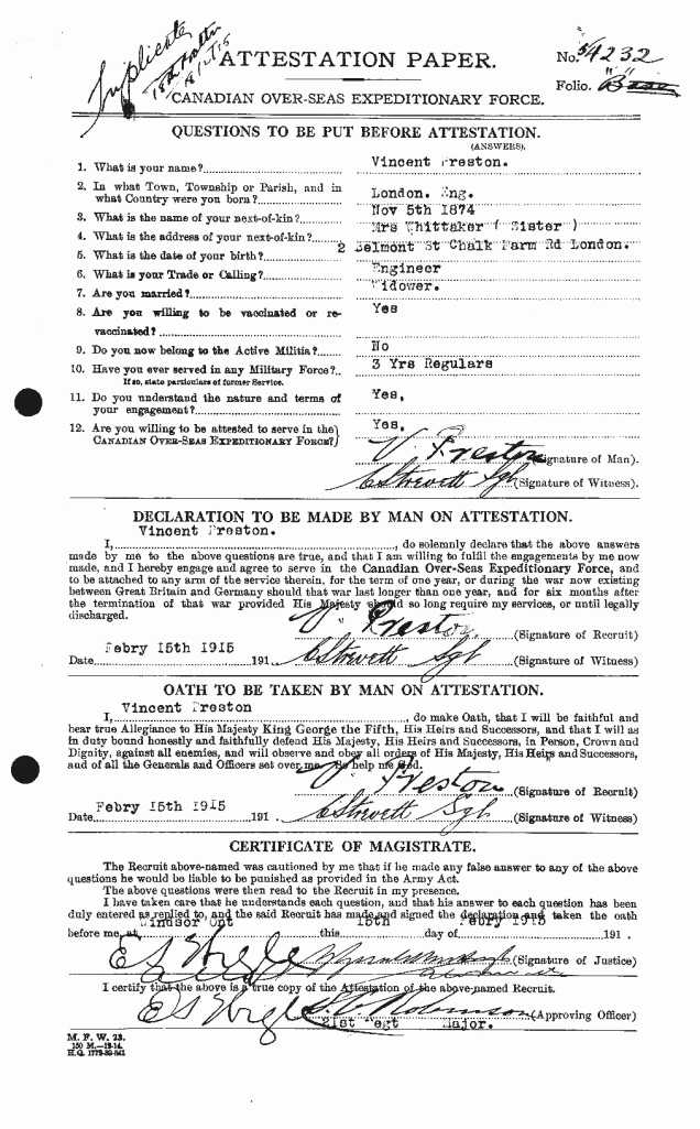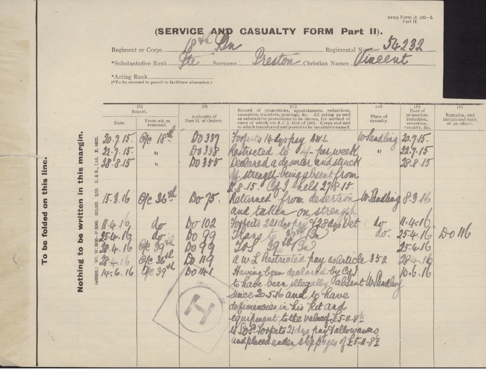 Preston, Vincent: Service no. 54232 Digitized Service Record Source: 18th Battalion Nominal Roll, April 1915. Find-A-Grave Deserter. Share this: Click to email a link to a friend (Opens in new window) Email Click to share on Facebook (Opens in new window) Facebook Click to share on X (Opens in new window) X Click to share on Reddit (Opens in new window) Reddit Click to share on LinkedIn (Opens in new window) LinkedIn Click to print (Opens in new window) Print Click to share on Tumblr (Opens in new window) Tumblr Click to share on Pocket (Opens in new window) Pocket Click to share on Pinterest (Opens in new window) Pinterest Click to share on Telegram (Opens in new window) Telegram Click to share on WhatsApp (Opens in new window) WhatsApp Like Loading...