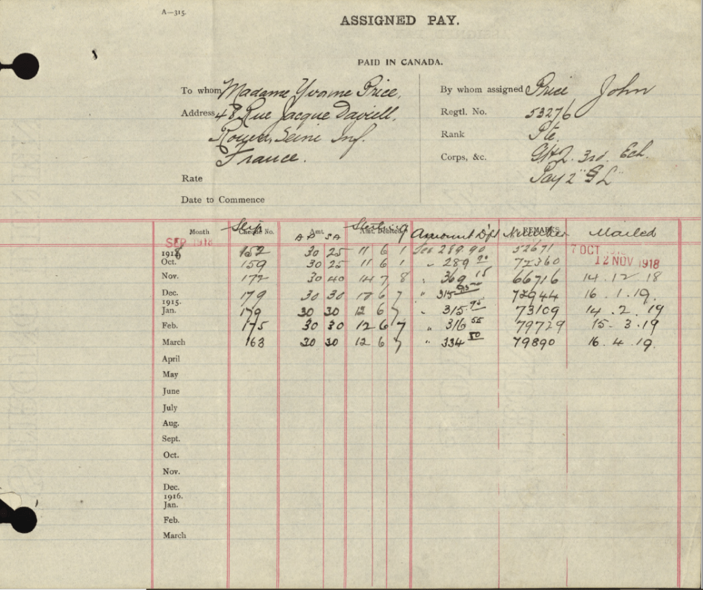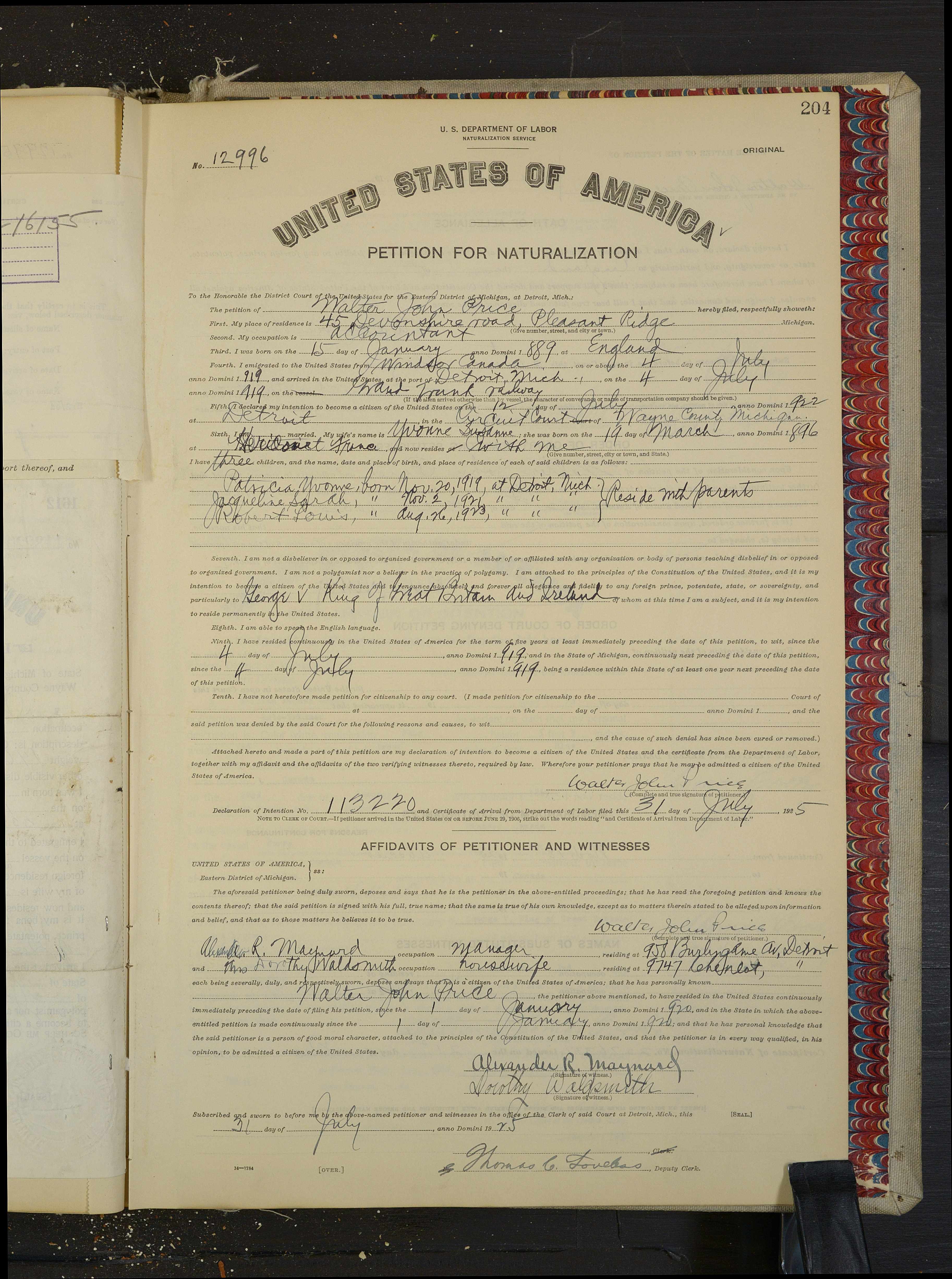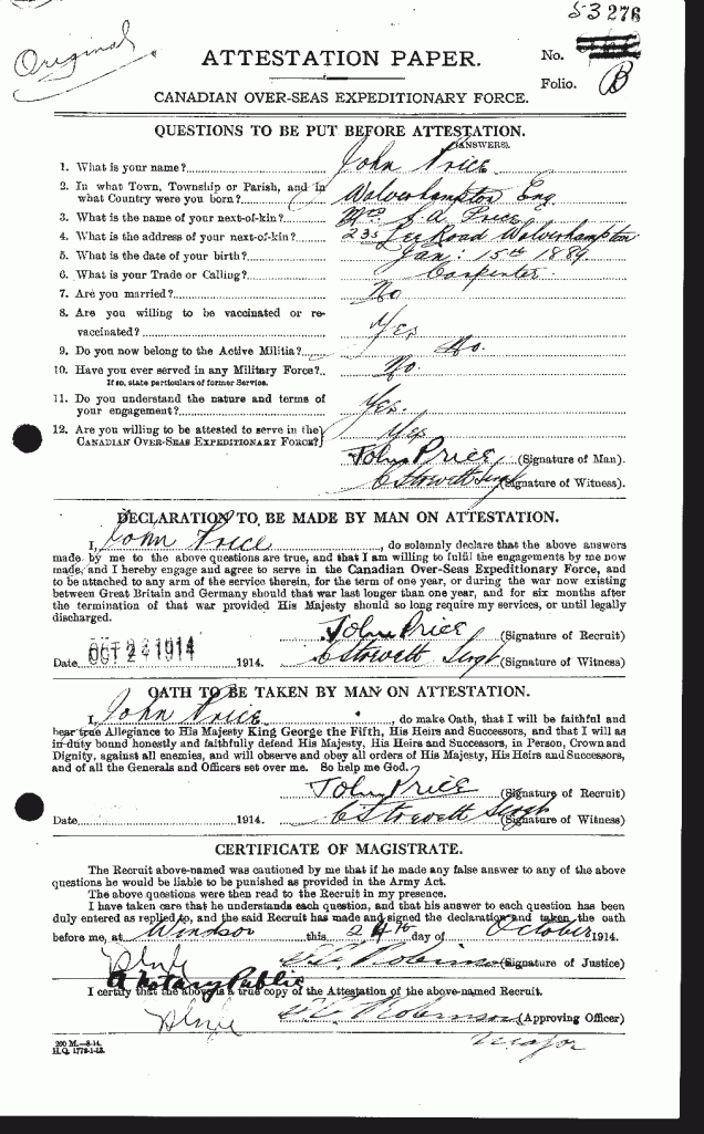 Family Search: When John Walter Price was born on 15 January 1889, in Wolverhampton, Staffordshire, England, his father, Thomas Price, was 40 and his mother, Sarah Ann Theodore, was 34. He had at least 1 son and 2 daughters with Yvonne Susanne Durand Price. He lived in Wolverhampton, Staffordshire, England, United Kingdom for about 10 years and Detroit, Wayne, Michigan, United States for about 2 years. He registered for military service in 1914. In 1914, at the age of 25, his occupation is listed as carpenter.