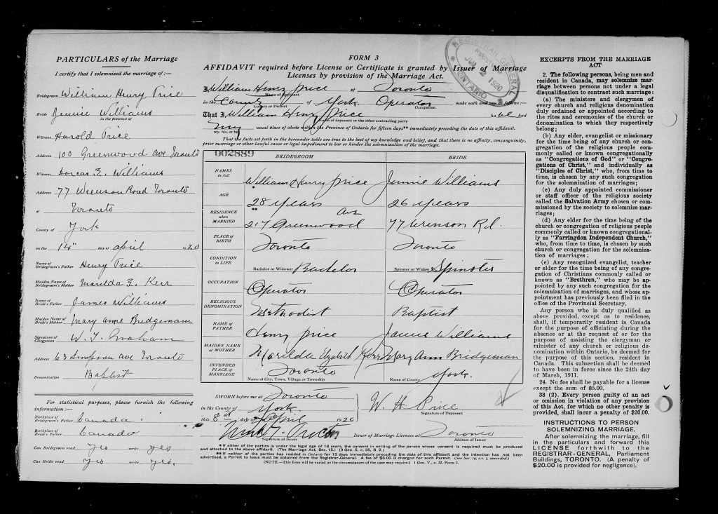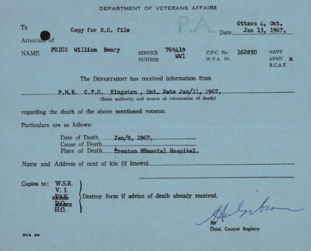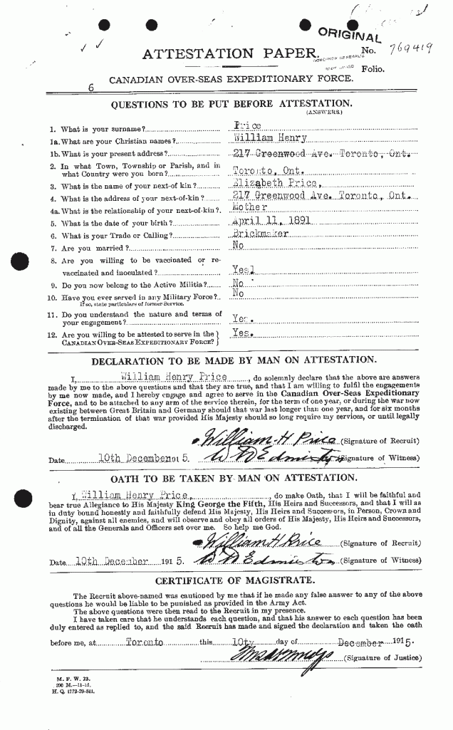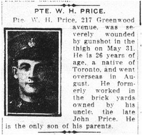 Private William Henry Price enlisted with the 124th Battalion at Toronto, Ontario on 10 December 1915.