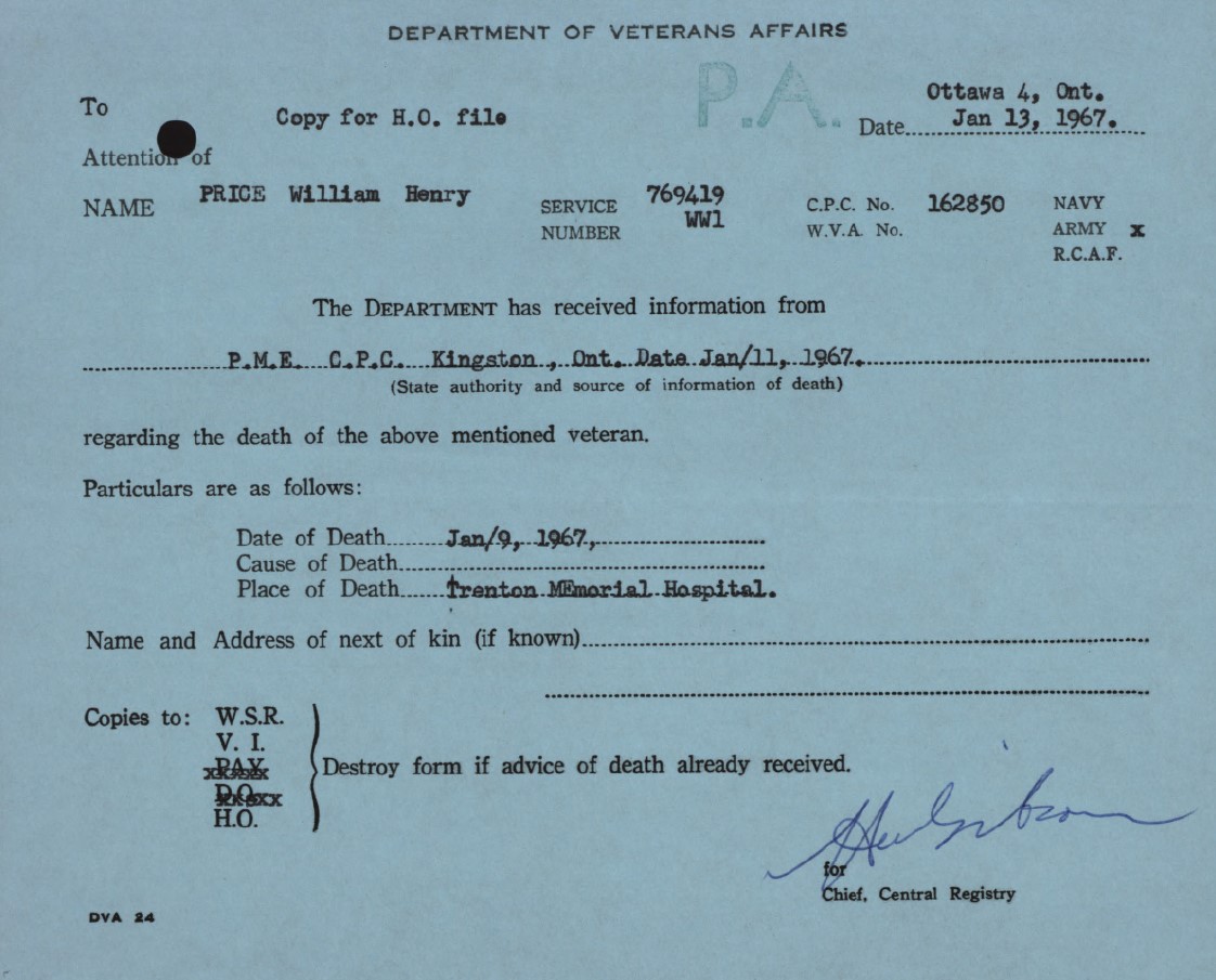 Private William Henry Price enlisted with the 124th Battalion at Toronto, Ontario on 10 December 1915.