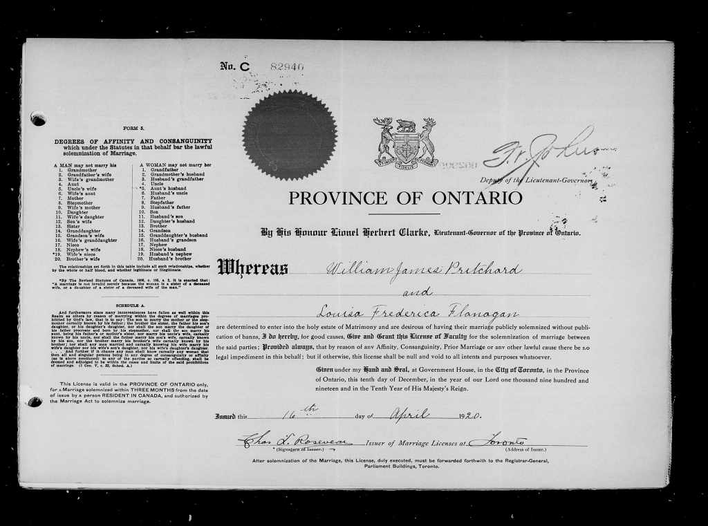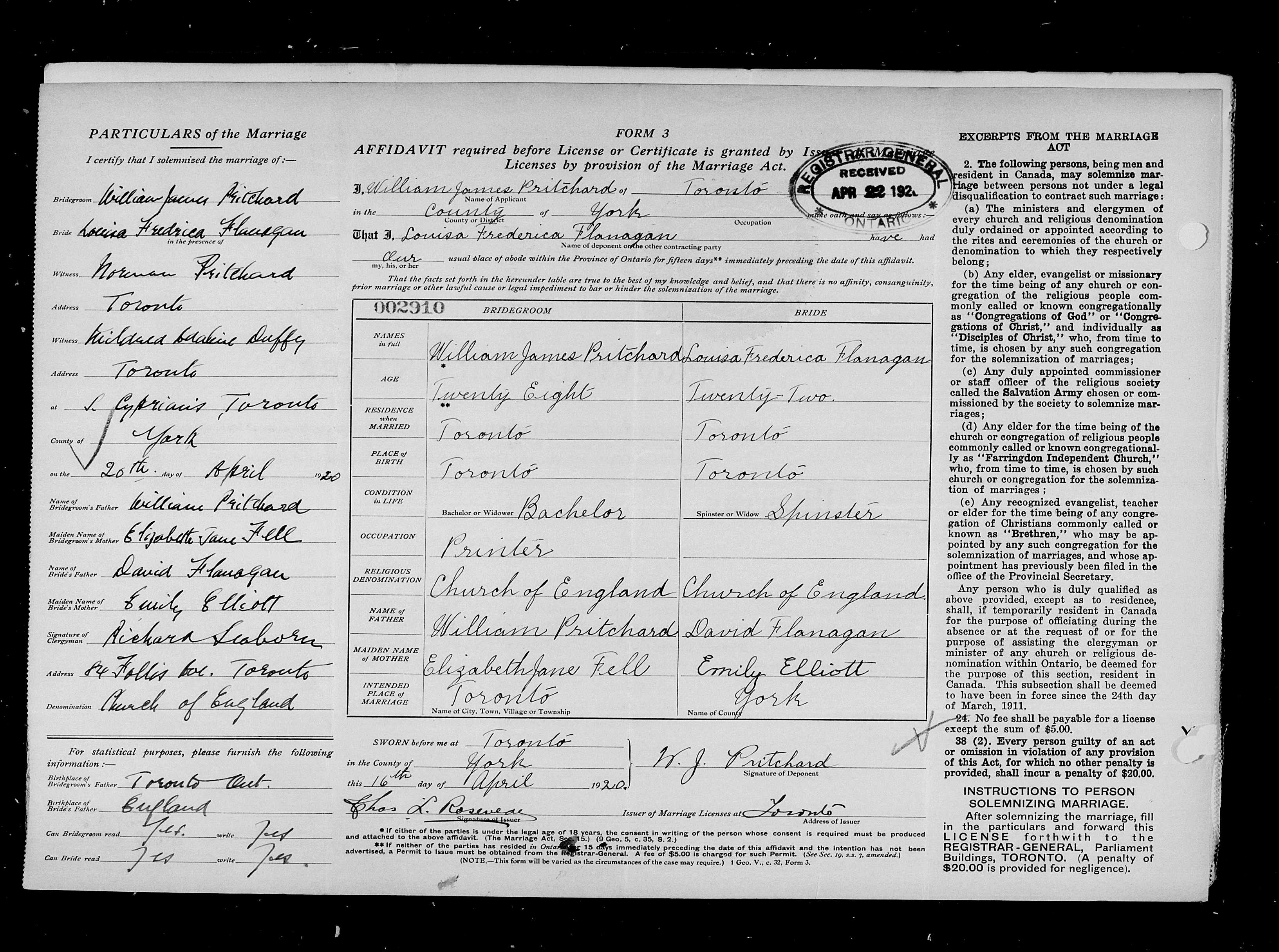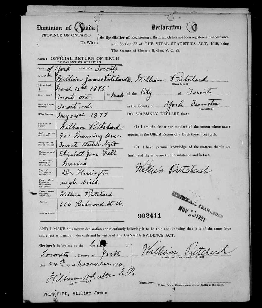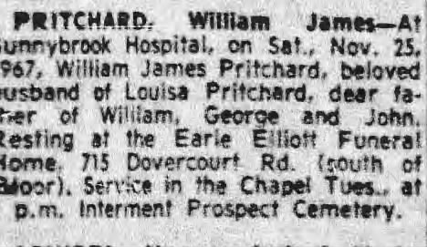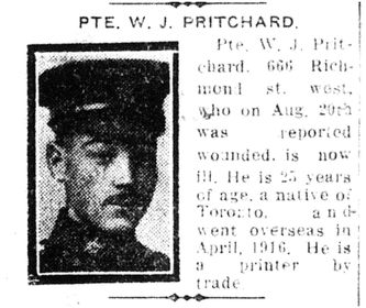 Family Search: When Private William James Pritchard was born on 12 March 1895, in York Township, Toronto, Ontario, Canada, his father, William James Pritchard, was 39 and his mother, Elizabeth Jane Fell, was 36. He married Louisa Frederica Flanagan on 20 April 1920, in York, Ontario, Canada. They were the parents of at least 3 sons. He lived in Ontario, Canada in 1895 and Toronto, York, Ontario, Canada for about 21 years. He registered for military service in 1915. In 1915, at the age of 20, his occupation is listed as printer in Toronto, York, Ontario, Canada. He died on 26 November 1967, in Toronto, Ontario, Canada, at the age of 72, and was buried in Prospect Cemetery, Toronto, Ontario, Canada.