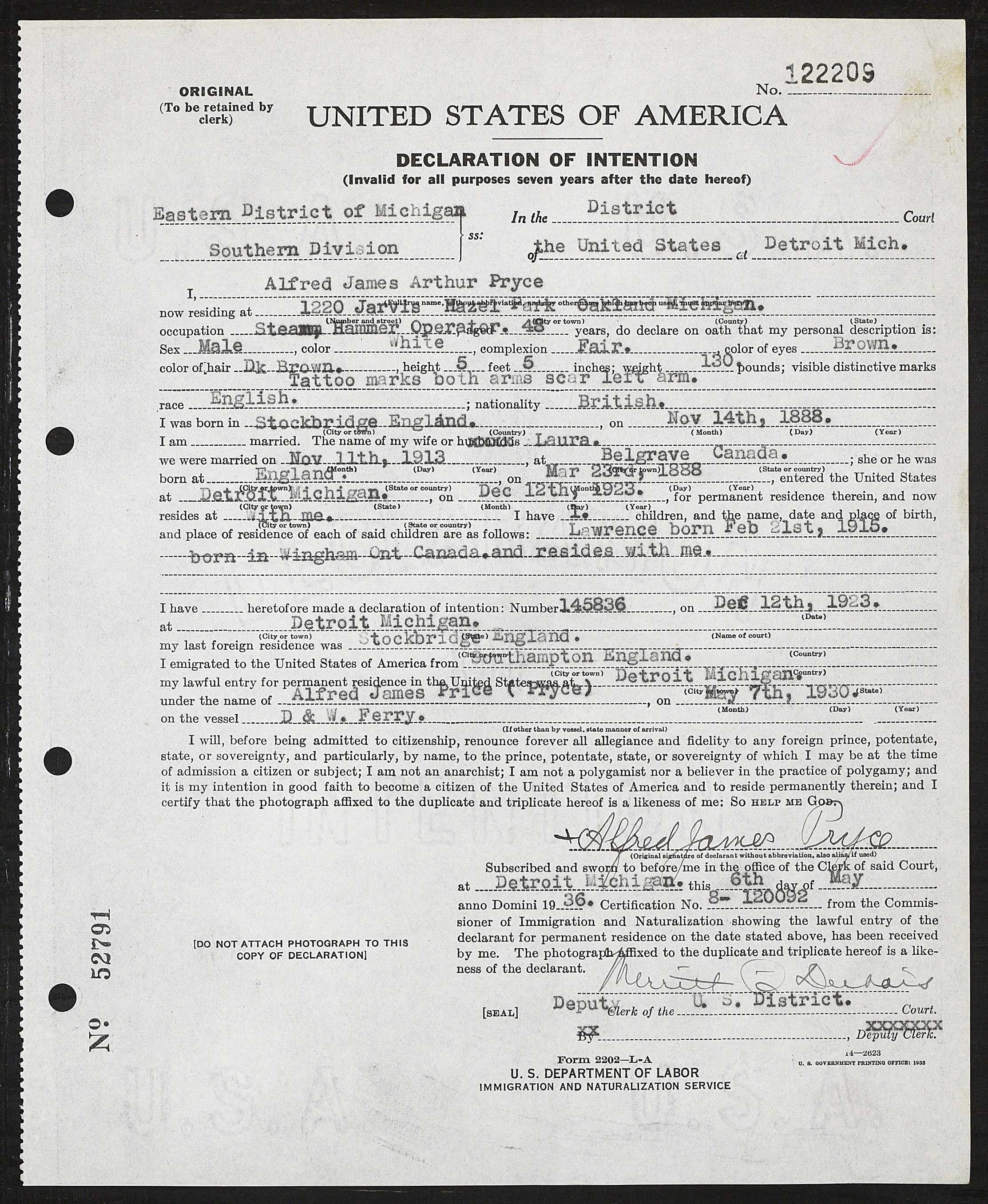 Family Search: When Alfred James Arthur Pryce was born on 18 November 1888, in Nether Wallop, Hampshire, England, United Kingdom, his father, James Price, was 29 and his mother, Rachel W Price, was 25. He married Laura Sarah Horne on 11 November 1913, in Belgrave, Morris-Turnberry, Huron, Ontario, Canada. They were the parents of at least 1 son. He lived in Wingham, North Huron, Huron, Ontario, Canada in 19. He registered for military service in 1916. In 1916, at the age of 28, his occupation is listed as farmer. He died in 1982, at the age of 94.