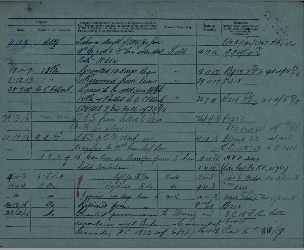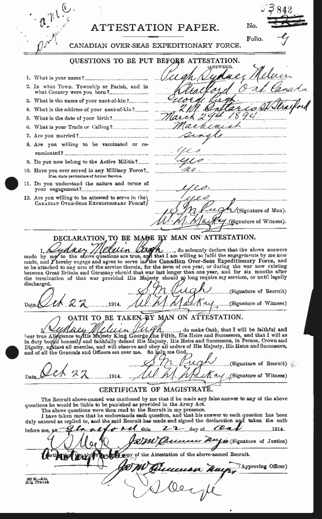 Family Search: Sydney Melville Pugh was born on 29 March 1894, in Stratford, Perth, Ontario, Canada as the son of George Jonas Pugh. He married Rose Margaret Condon on 16 November 1918, in Southwark St Peter, Surrey, England, United Kingdom. He registered for military service in 1914. In 1914, at the age of 20, his occupation is listed as machinist.