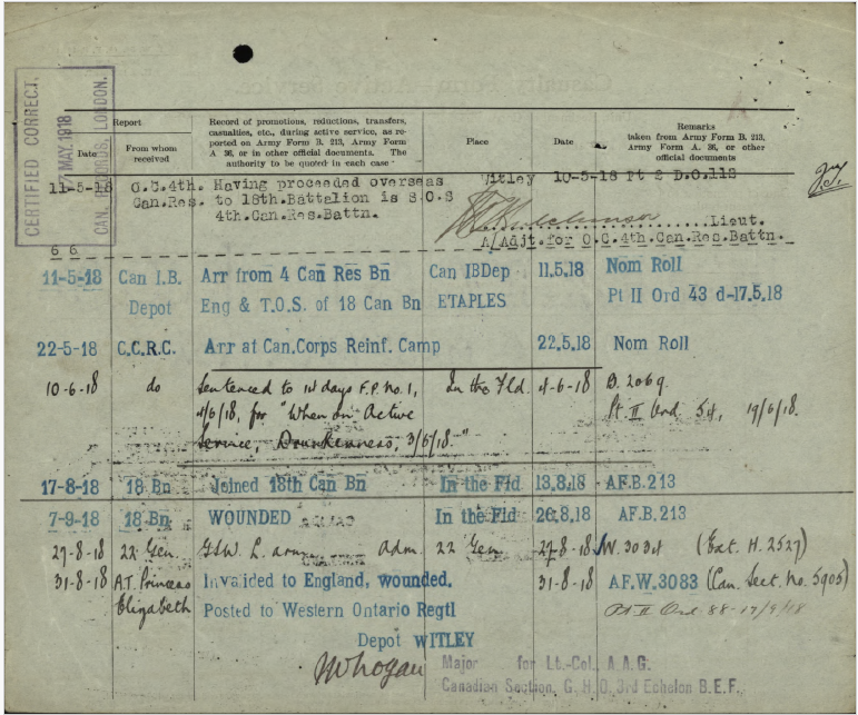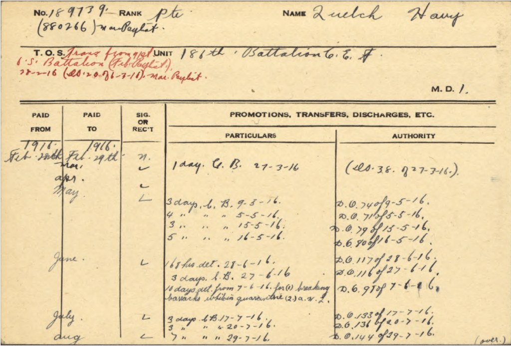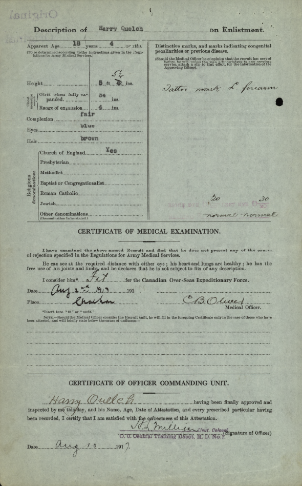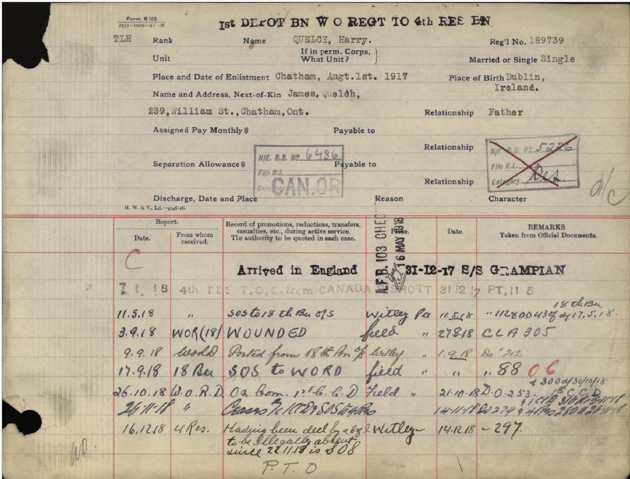 Family Search: Private Harry Quelch was born on 7 April 1899, in Dublin, County Dublin, Ireland as the son of James Quelch. He immigrated to Canada in 1915 and lived in Chatham, Kent, Ontario, Canada in 1917. He registered for military service in 1917. In 1917, at the age of 18, his occupation is listed as labourer in Chatham, Chatham-Kent, Ontario, Canada.