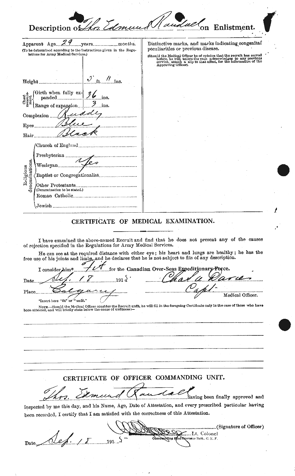 | September 18, 1915 | Enlist | Private Randall joins the 82nd Battalion in Calgary listing his father as his next-of-kin. His trade is that of a trapper and hunter. He is 29 years old. |