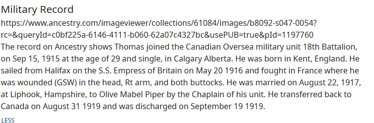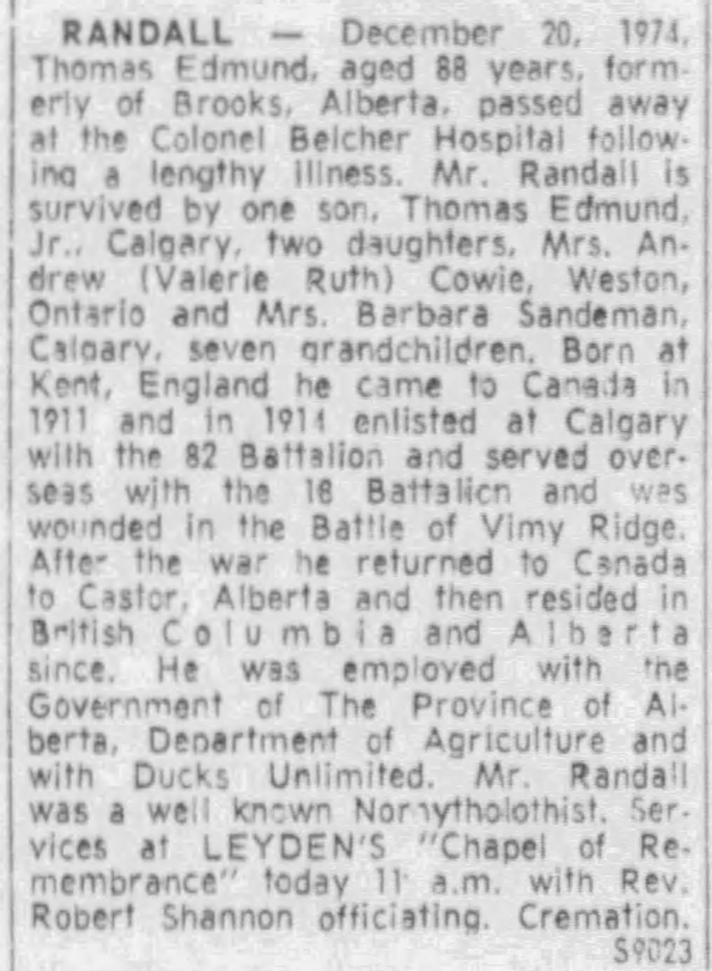 Family Search: When Sergeant Thomas Edmund Randall was born on 21 June 1886, in Rodmersham, Kent, England, United Kingdom, his father, William Randall, was 24 and his mother, Emma Randall, was 22. He married Olive Mabel Piper on 22 August 1917, in Petersfield, Hampshire, England, United Kingdom. He lived in High Halstow, Kent, England, United Kingdom in 1901 and Sandhurst, Berkshire, England, United Kingdom in 1911. He died on 20 December 1974, in Calgary, Alberta, Canada, at the age of 88.