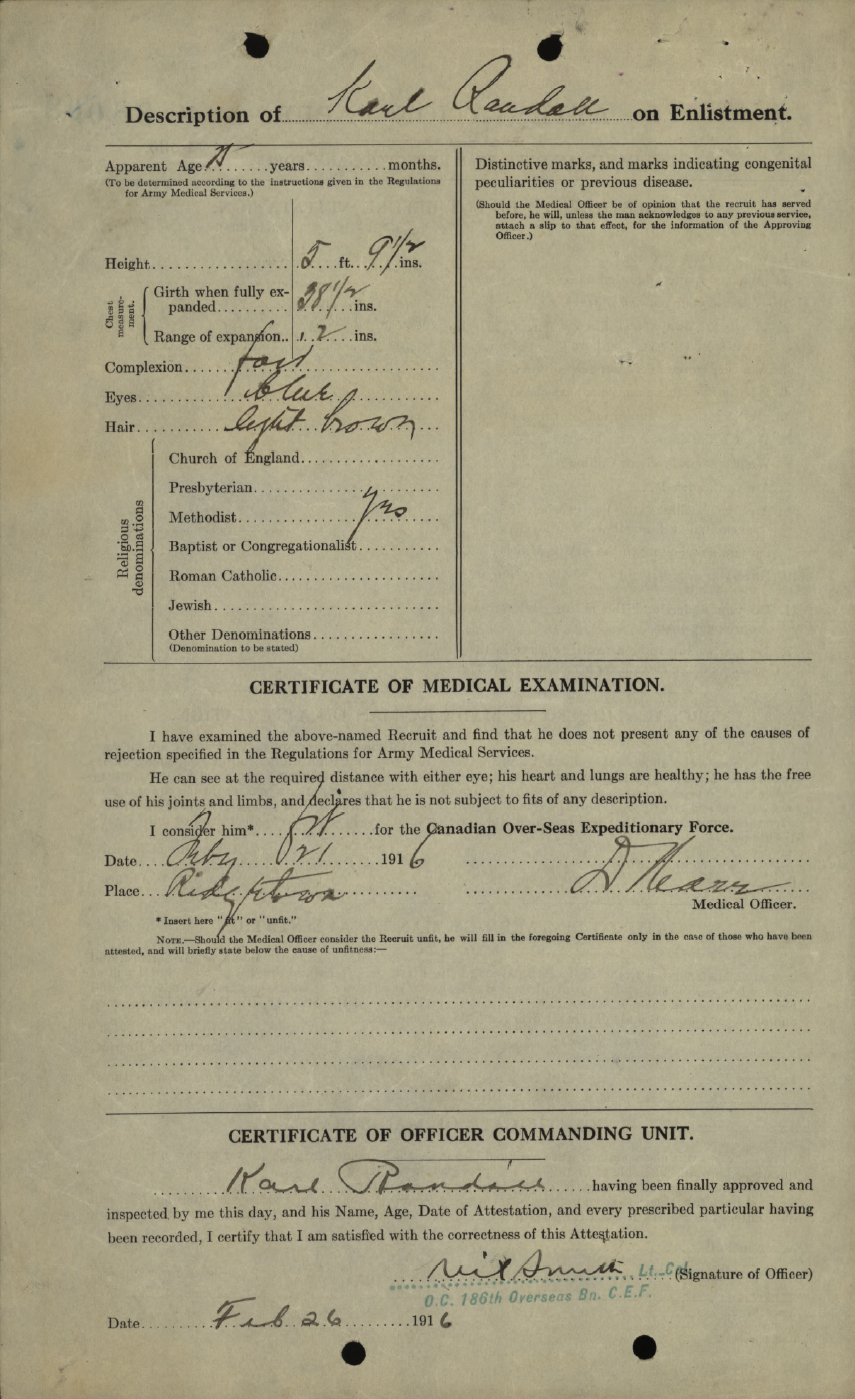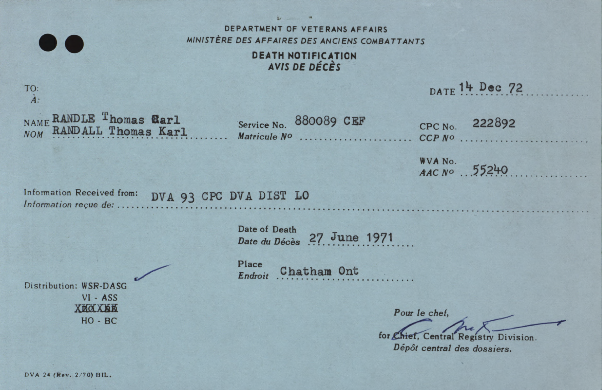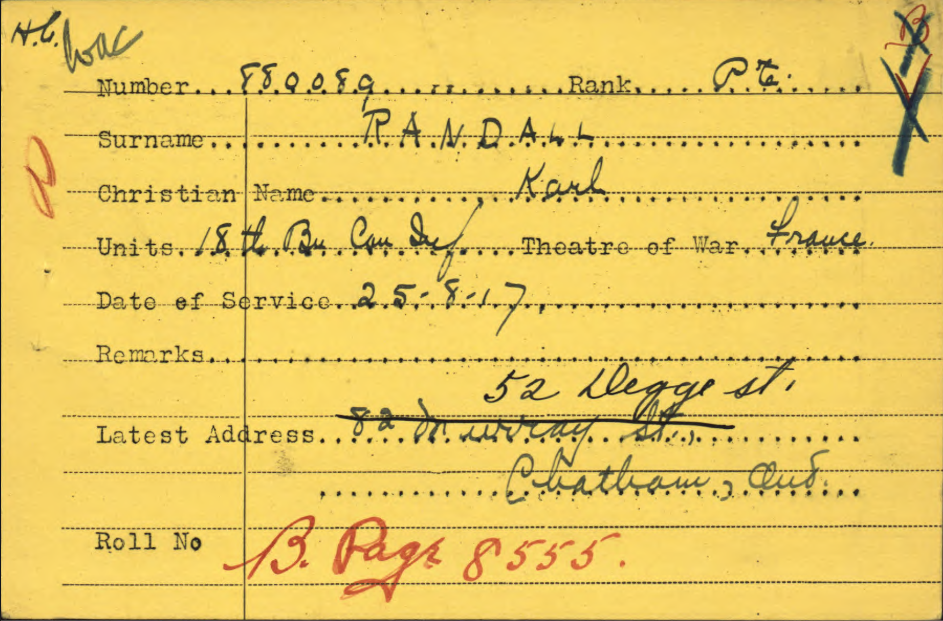 Family Search: When Private Thomas Karl Randle was born on 1 January 1891, in Dawn-Euphemia, Lambton, Ontario, Canada, his father, William Randle, was 34 and his mother, Charlotte Bull, was 33. He married Margaret Emily Deline on 23 June 1911, in Chatham, Chatham-Kent, Ontario, Canada. They were the parents of at least 5 sons and 1 daughter. He lived in Ridgetown, Kent, Ontario, Canada in 1916 and Chatham, Kent, Ontario, Canada for about 44 years. He registered for military service in 1916. In 1931, at the age of 40, his occupation is listed as labourer. He died on 27 June 1971, at the age of 80, and was buried in Maple Leaf Cemetery, Chatham, Chatham-Kent, Ontario, Canada.