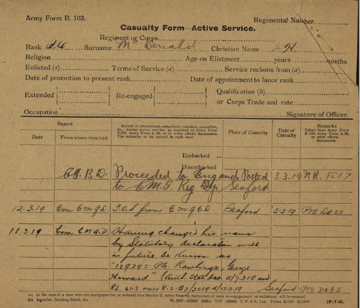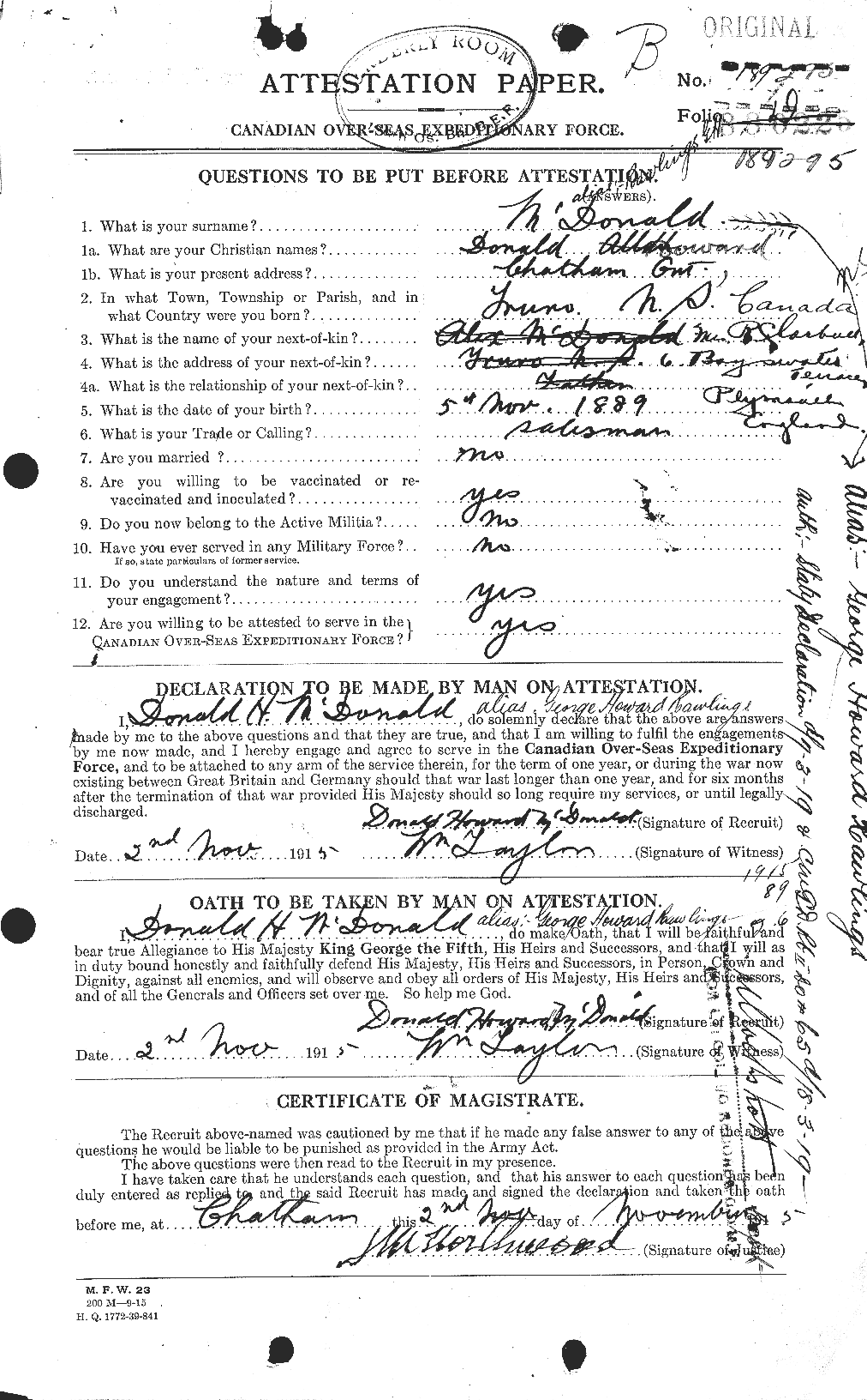 This soldier originally attested under an alias of “Donald McDonald” but this was later corrected with a Statutary Declaration when proof was offered to his real name.